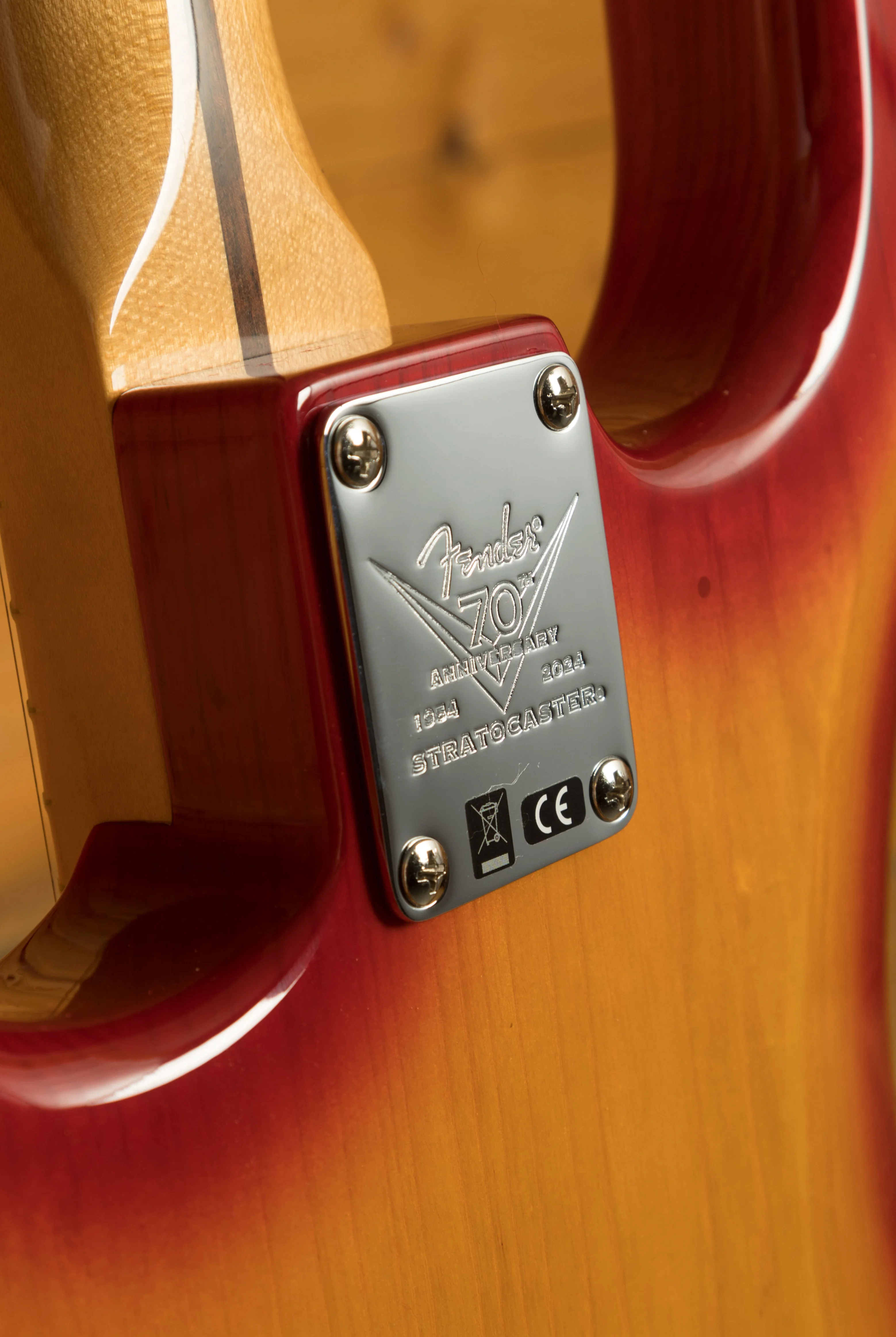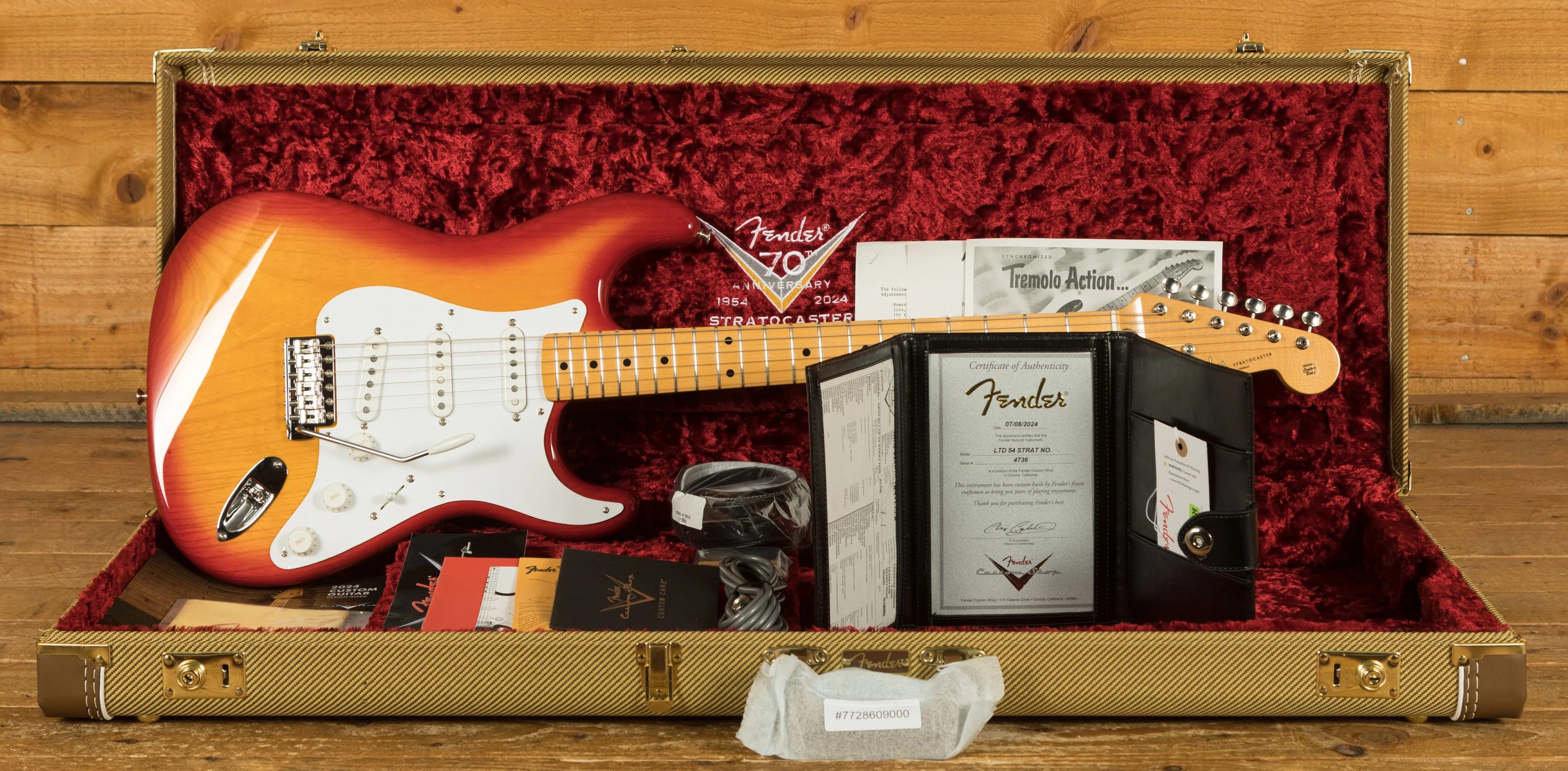 Further enhancing this guitar's premium appeal are its authentic first-year Stratocaster features: a single-ply white pickguard and matching serial-number back plate, 1954-style ABS white pickup covers and control knobs, a Custom Shop vintage synchronised tremolo bridge, vintage-style tuners, and a disc string tree. The special 70th Anniversary Stratocaster neck plate, deluxe embroidered hardshell case, exclusive case candy, and a certificate of authenticity complete the package.
