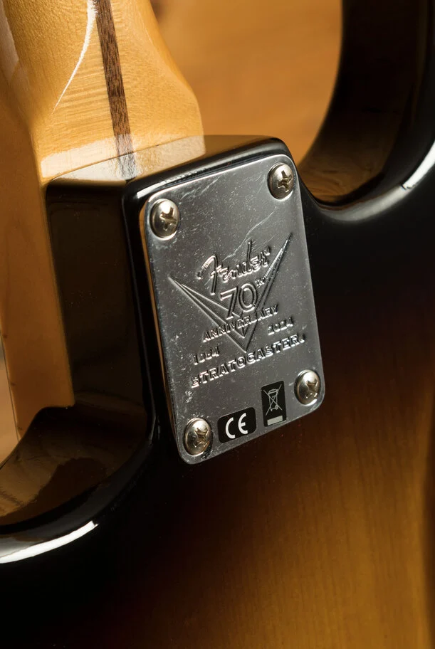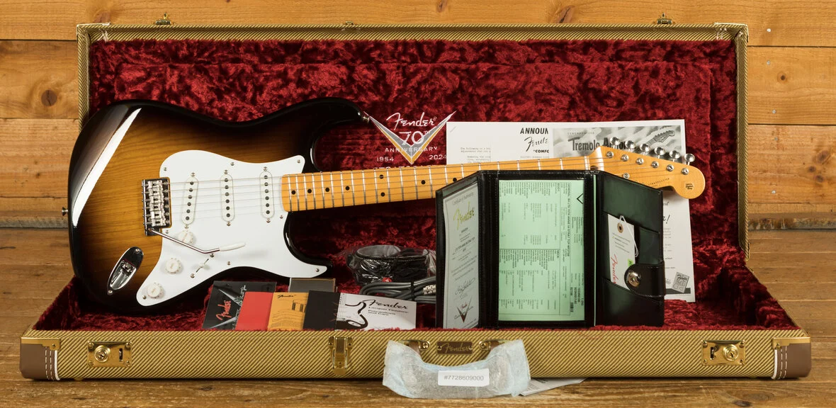 This commemorative model features authentic first-year Strat appointments, including a single-ply white pickguard and serial-number back plate, as well as 1954-style ABS white pickup covers and control knobs. The Custom Shop vintage synchronised tremolo bridge ensures reliable performance and tuning stability, while vintage-style tuners and a disc string tree contribute to its classic aesthetic. Each guitar is accompanied by a special 70th Anniversary Stratocaster neck plate, deluxe embroidered hardshell case, "case candy" kit, and certificate of authenticity, making it a prized addition to any collection.