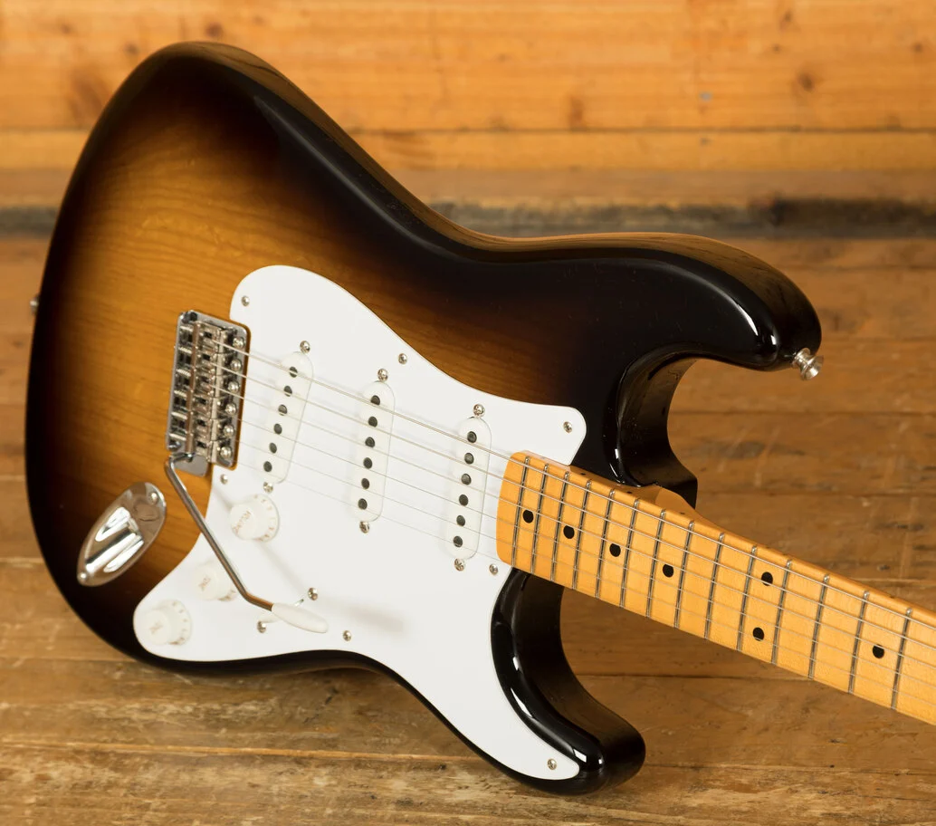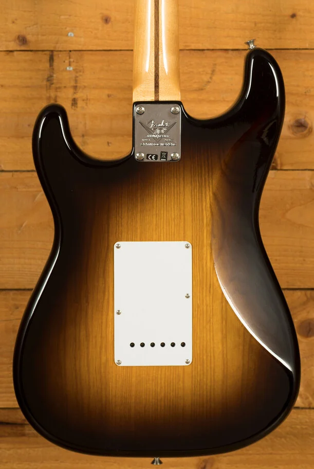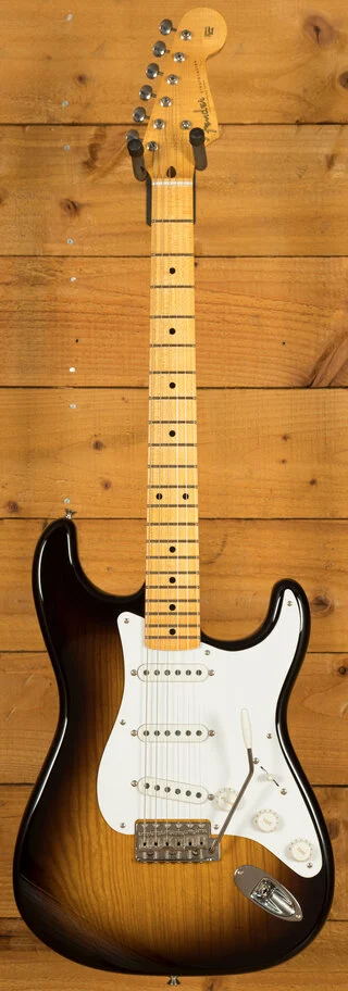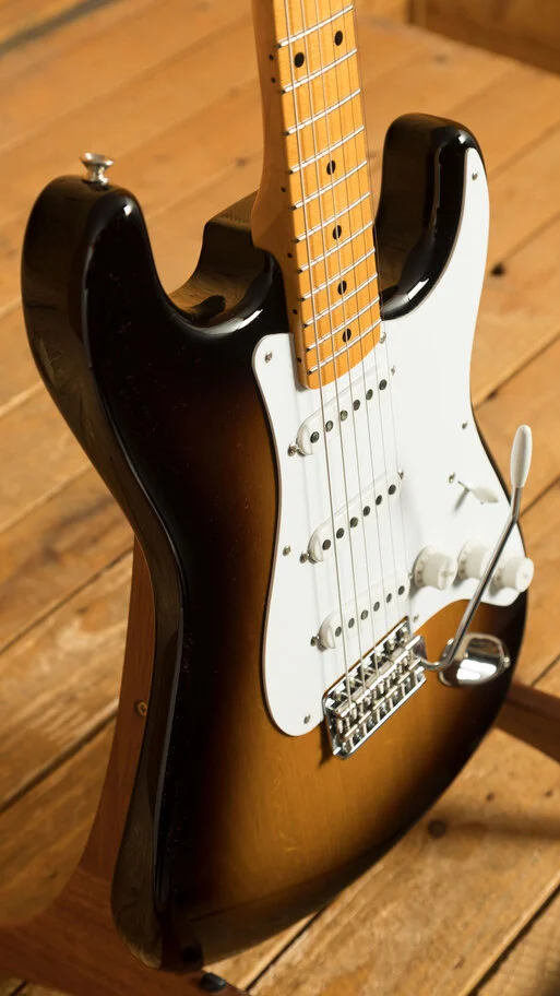 Introducing the Fender Custom Shop 70th Anniversary 1954 Stratocaster, commemorating seven decades of the iconic Stratocaster guitar. Crafted with meticulous attention to detail, this limited edition model embodies the essence of the original 1954 design. Its two-piece select ash body, featuring an offset seam on the treble side, delivers a resonant tone characterised by clear highs, rich midrange, and tight lows, all accentuated by a stunning Wide Fade Two-Colour Sunburst lacquer finish.