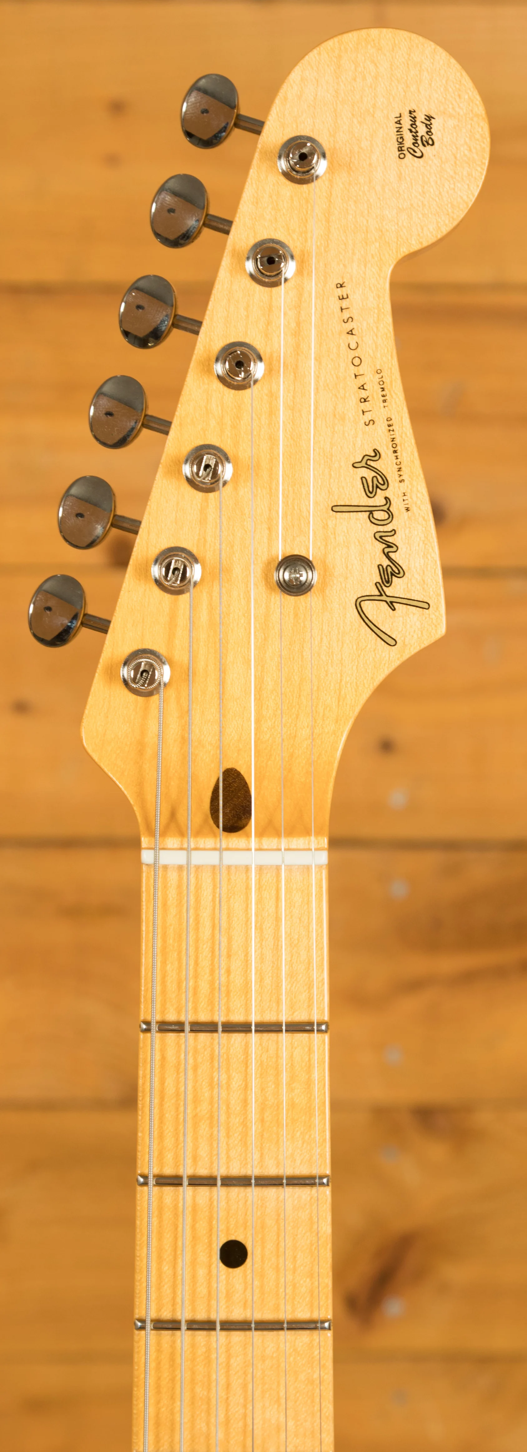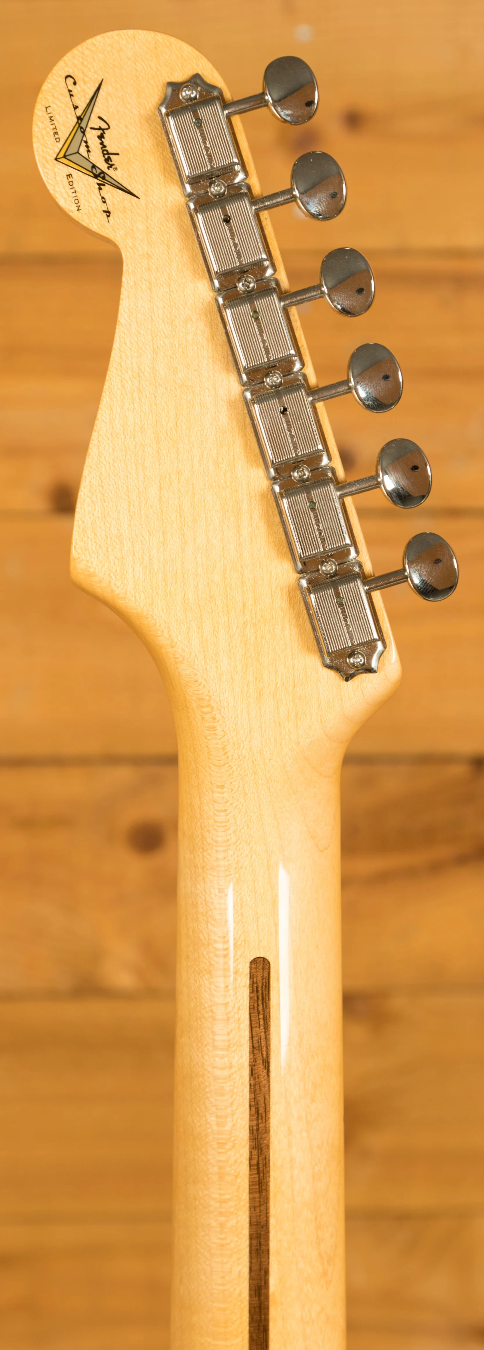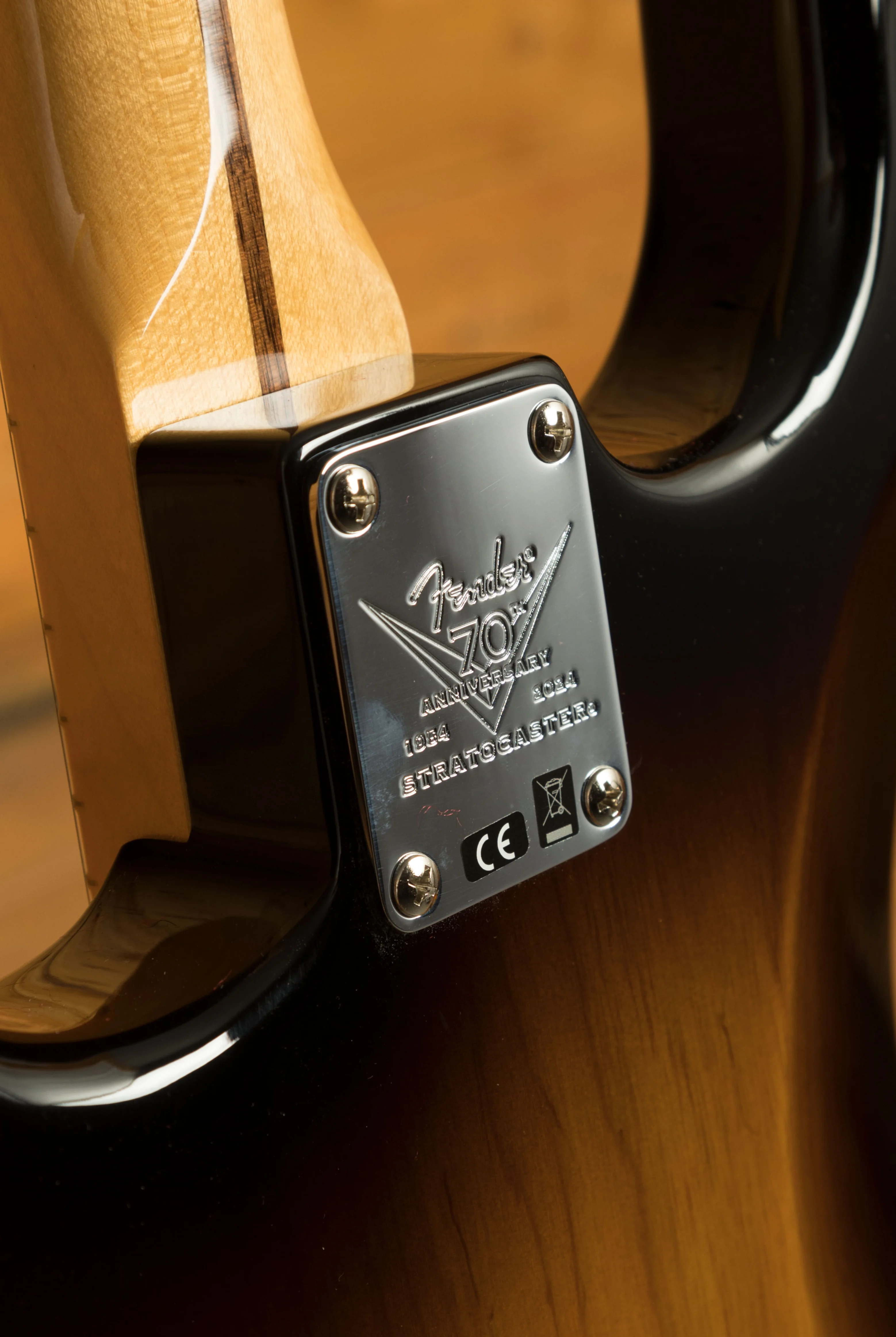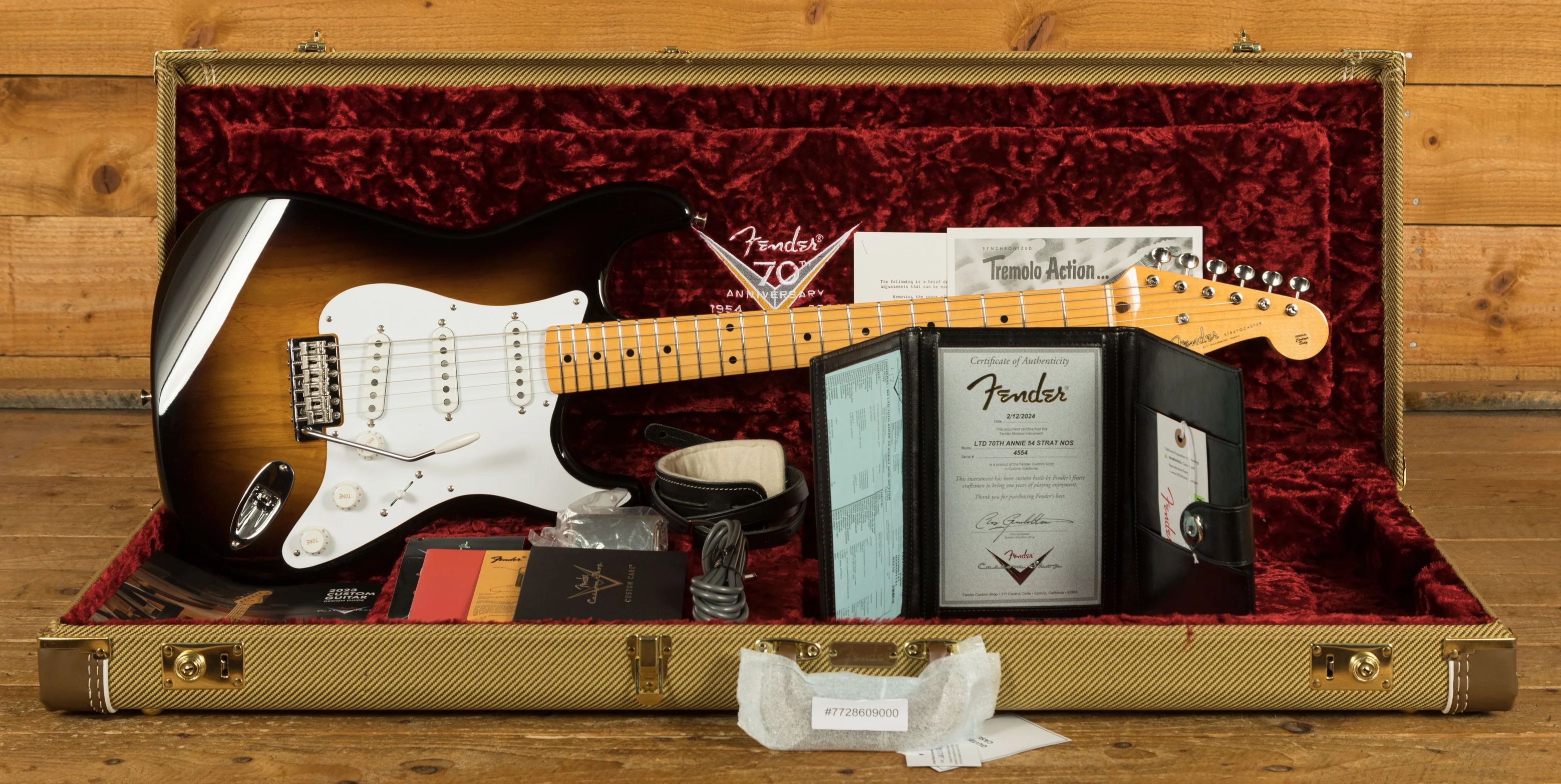 The neck of the 70th Anniversary Stratocaster boasts a one-piece quartersawn maple construction, shaped to a special 70th anniversary Soft "V" profile inspired by a historic Strat neck from July 1954. Its vintage compound-radius fingerboard, ranging from 7.25" to 9.5", hosts 21 medium vintage frets and a 1.625" bone nut - ensuring exceptional playability across the entire fretboard. Equipped with three Custom Shop hand-wound '54 Strat pickups, this guitar delivers the iconic Stratocaster sound characterised by clear, bell-like highs, and dynamic responsiveness.