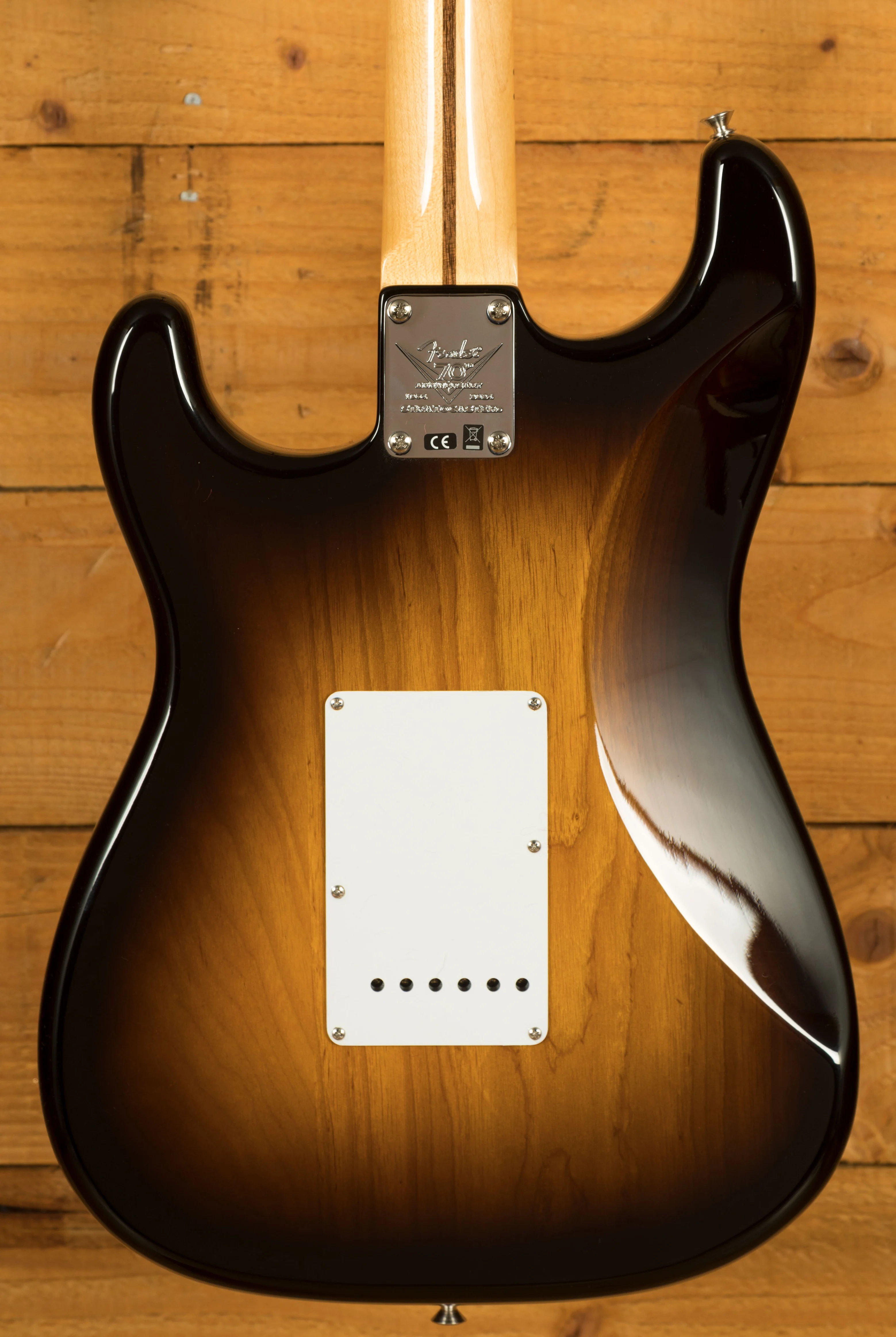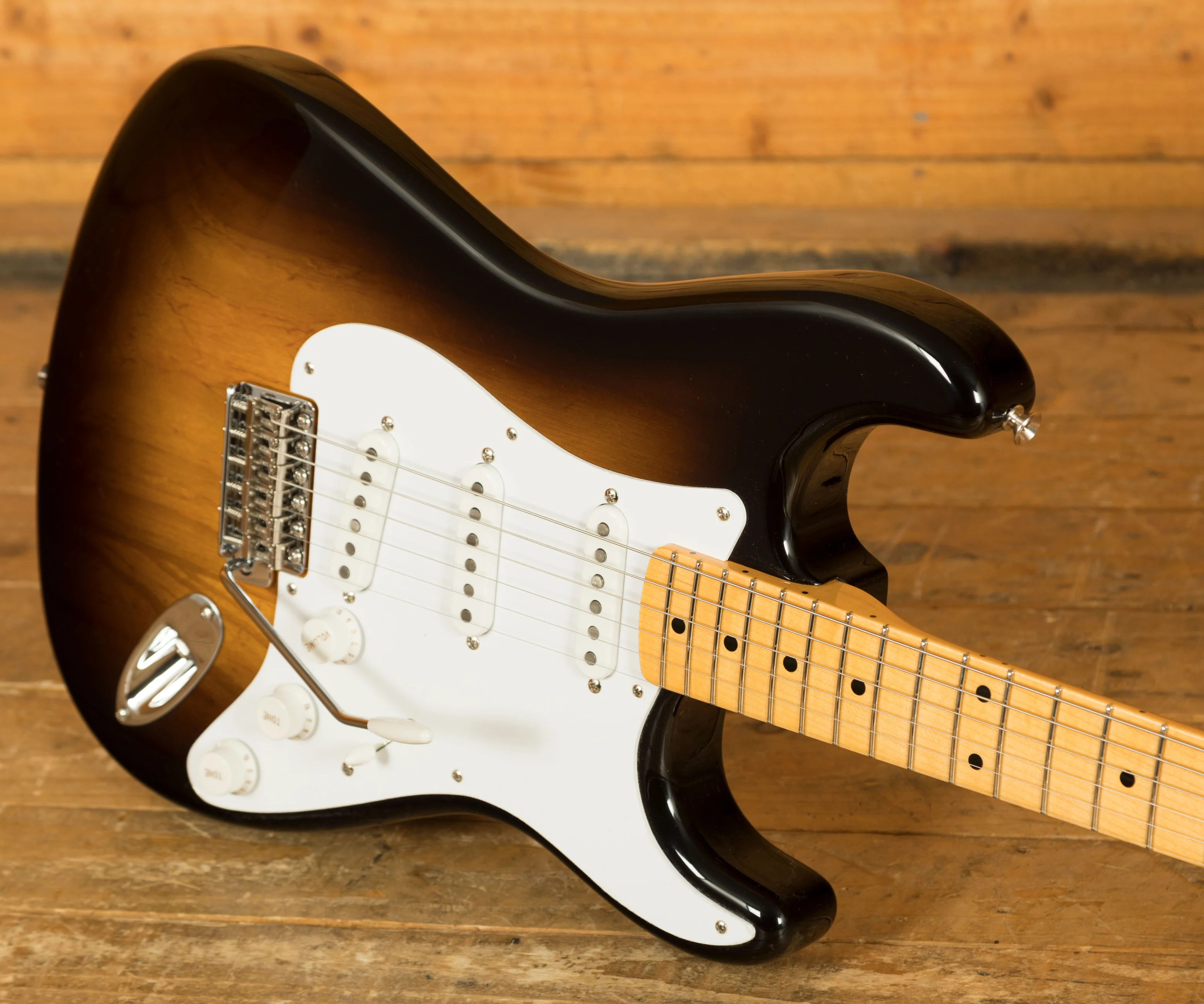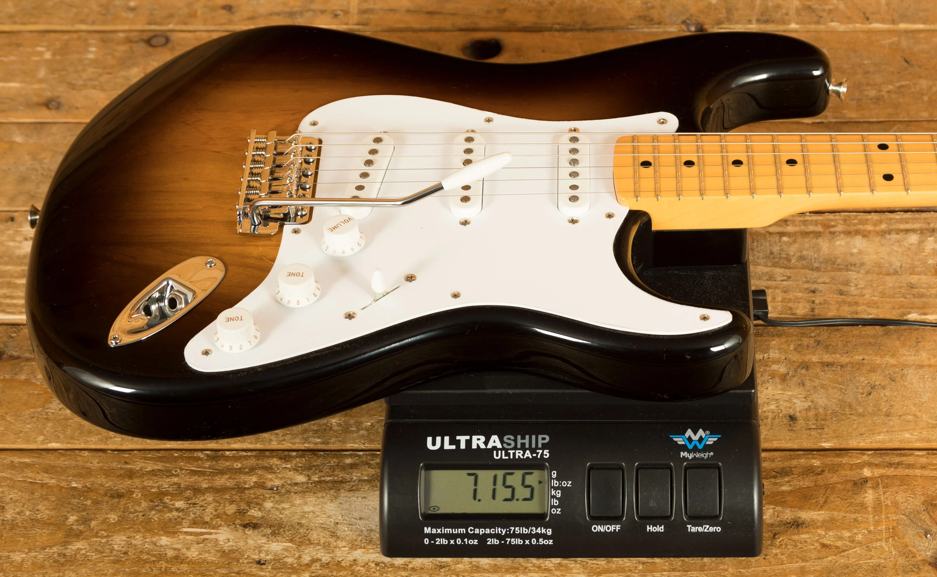 Constructed with a two-piece select ash body, featuring an offset seam on the treble side, this Stratocaster resonates with a balanced tonal spectrum - delivering articulate highs, rich midrange, and defined lows. Adorned with a stunning Wide Fade Two-Colour Sunburst lacquer finish, applied in a pristine NOS style, this instrument exudes timeless elegance.