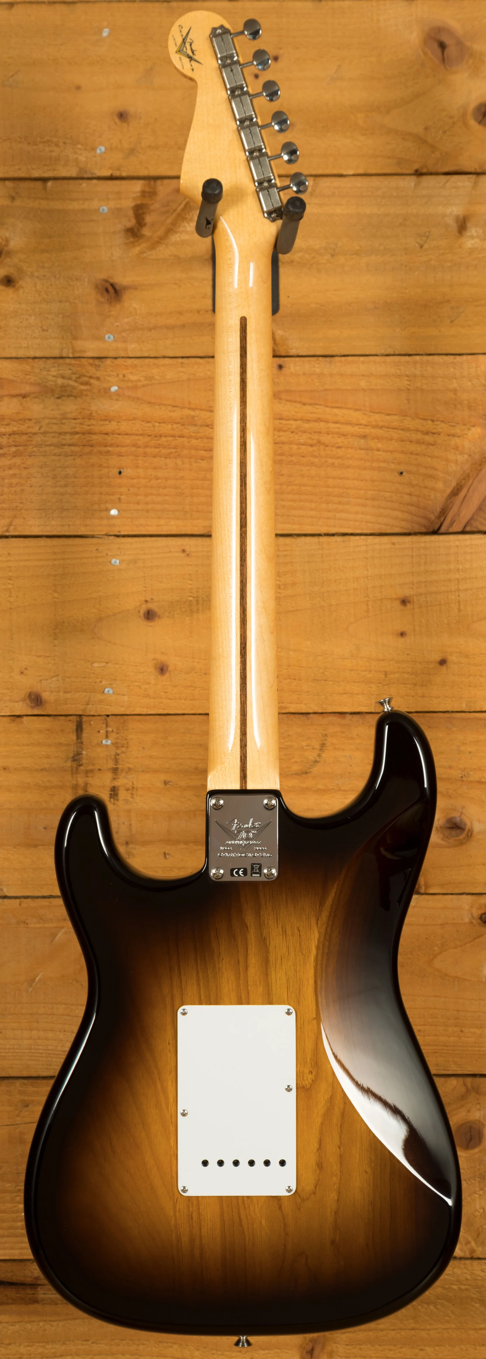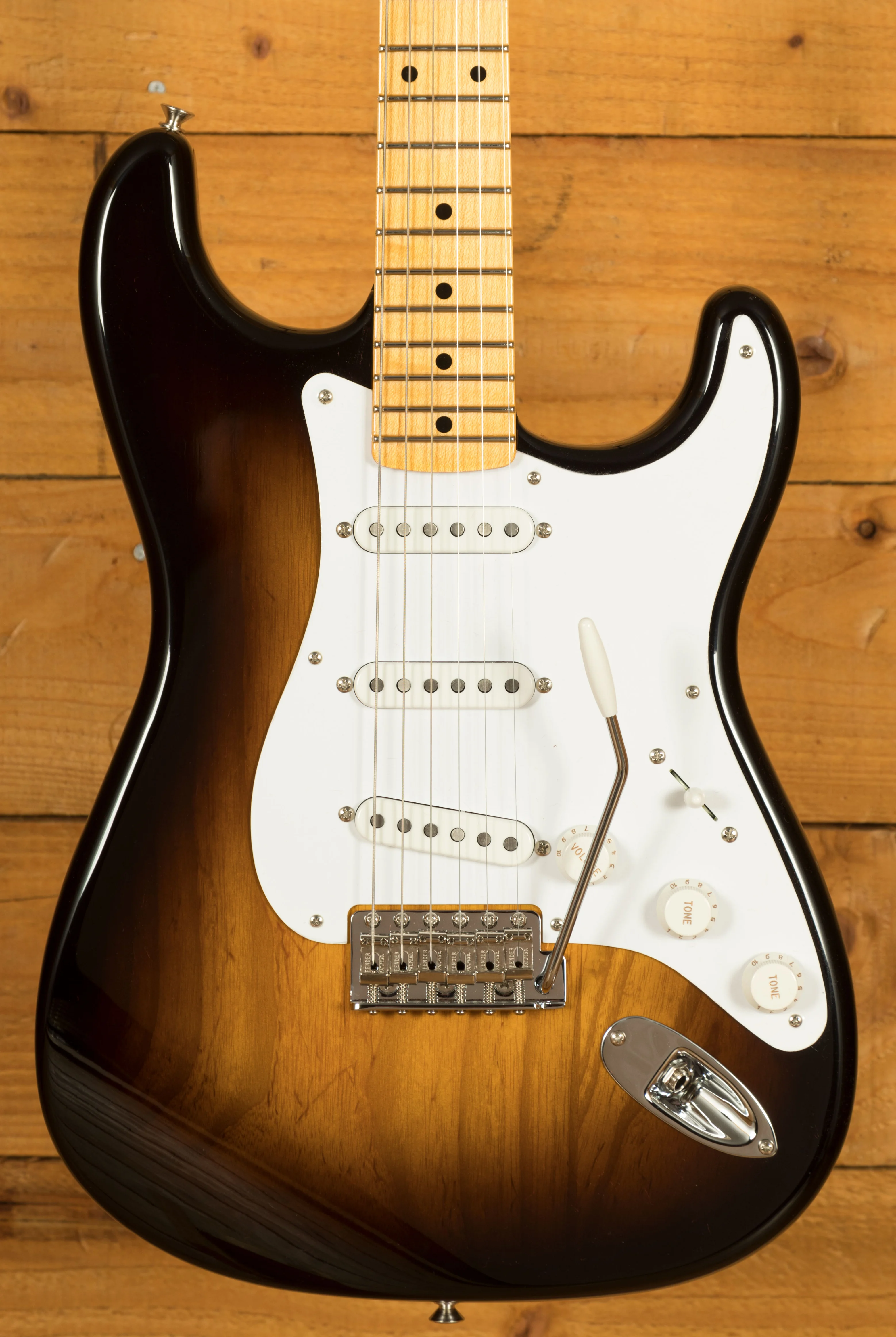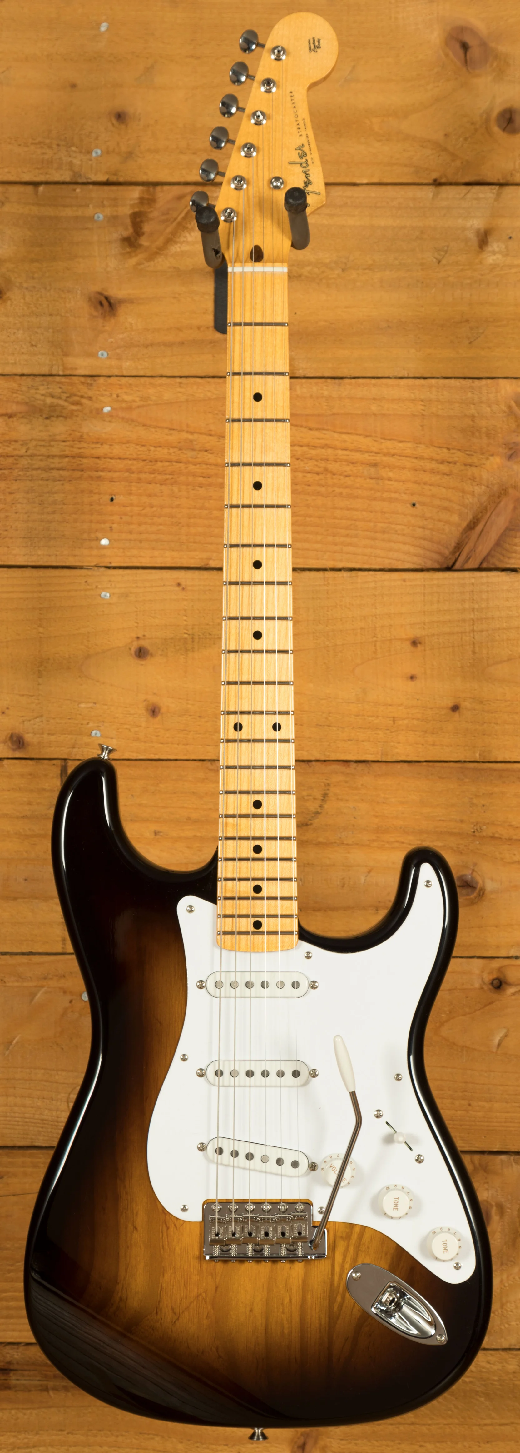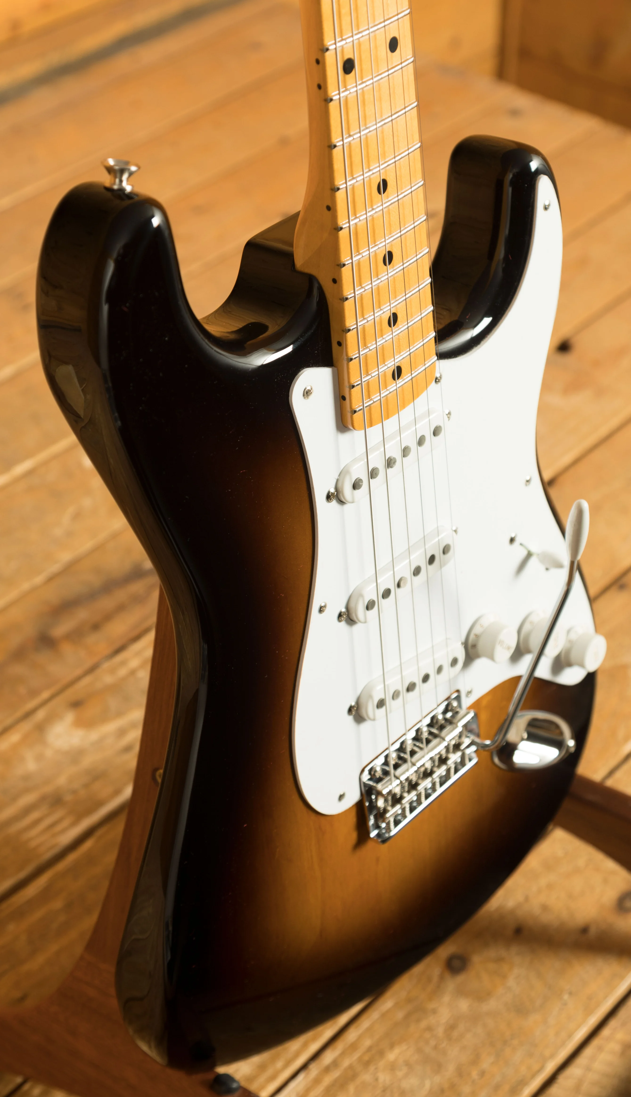 Constructed with a two-piece select ash body, featuring an offset seam on the treble side, this Stratocaster resonates with a balanced tonal spectrum - delivering articulate highs, rich midrange, and defined lows. Adorned with a stunning Wide Fade Two-Colour Sunburst lacquer finish, applied in a pristine NOS style, this instrument exudes timeless elegance.