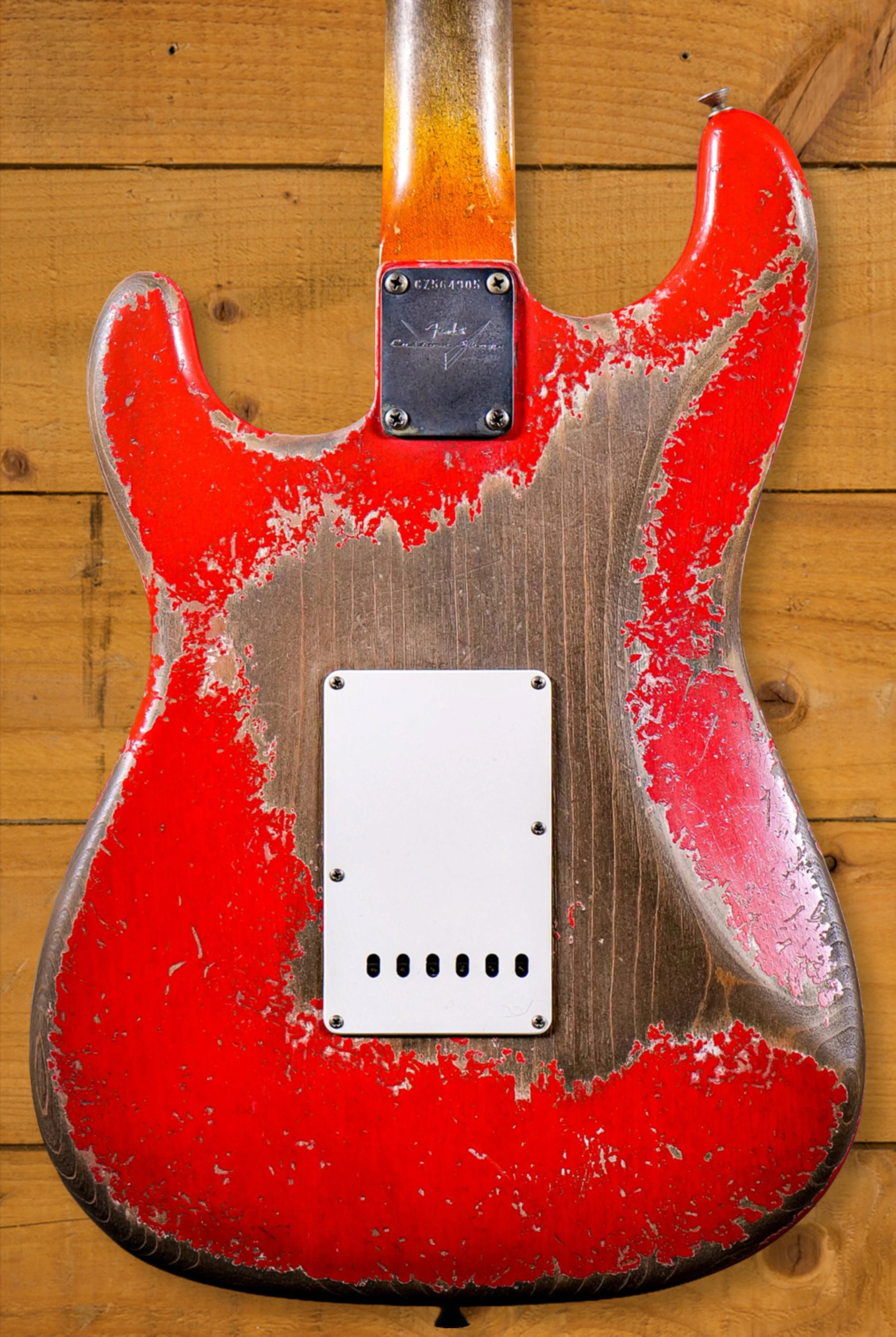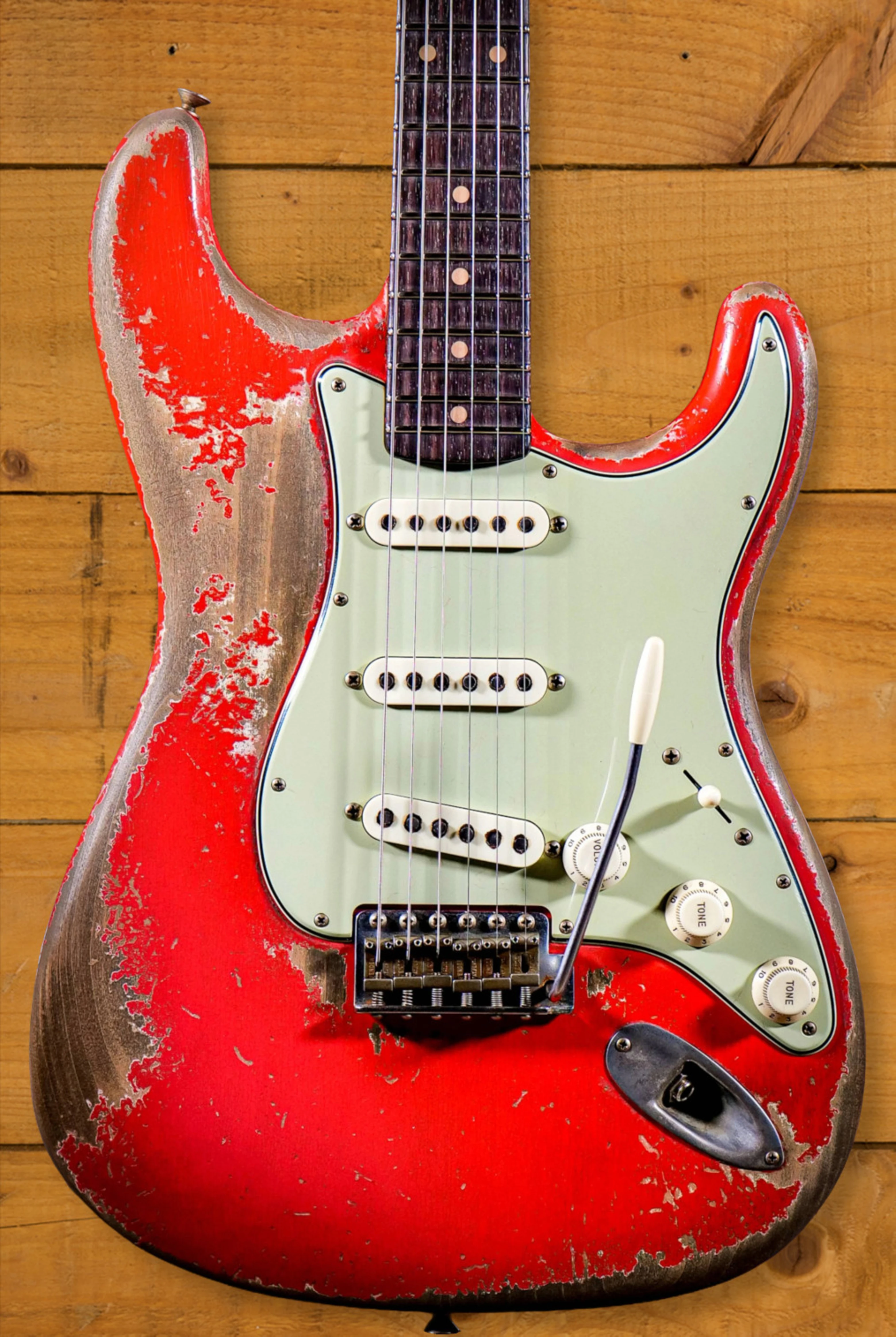 A sort for lightweight Alder body is finished in a legendary "Faded" fiesta red. Time and time again, Fiesta Red continues to send guitar players weak at the knees. Heavily aged, this finish will wear beautifully with time and develop its own character even further. The thin nitro finish also allows the natural resonance of the body to sing and sustain much more effectively. Dale is the King of relic work at the custom shop and this certainly doesn't disappoint though!