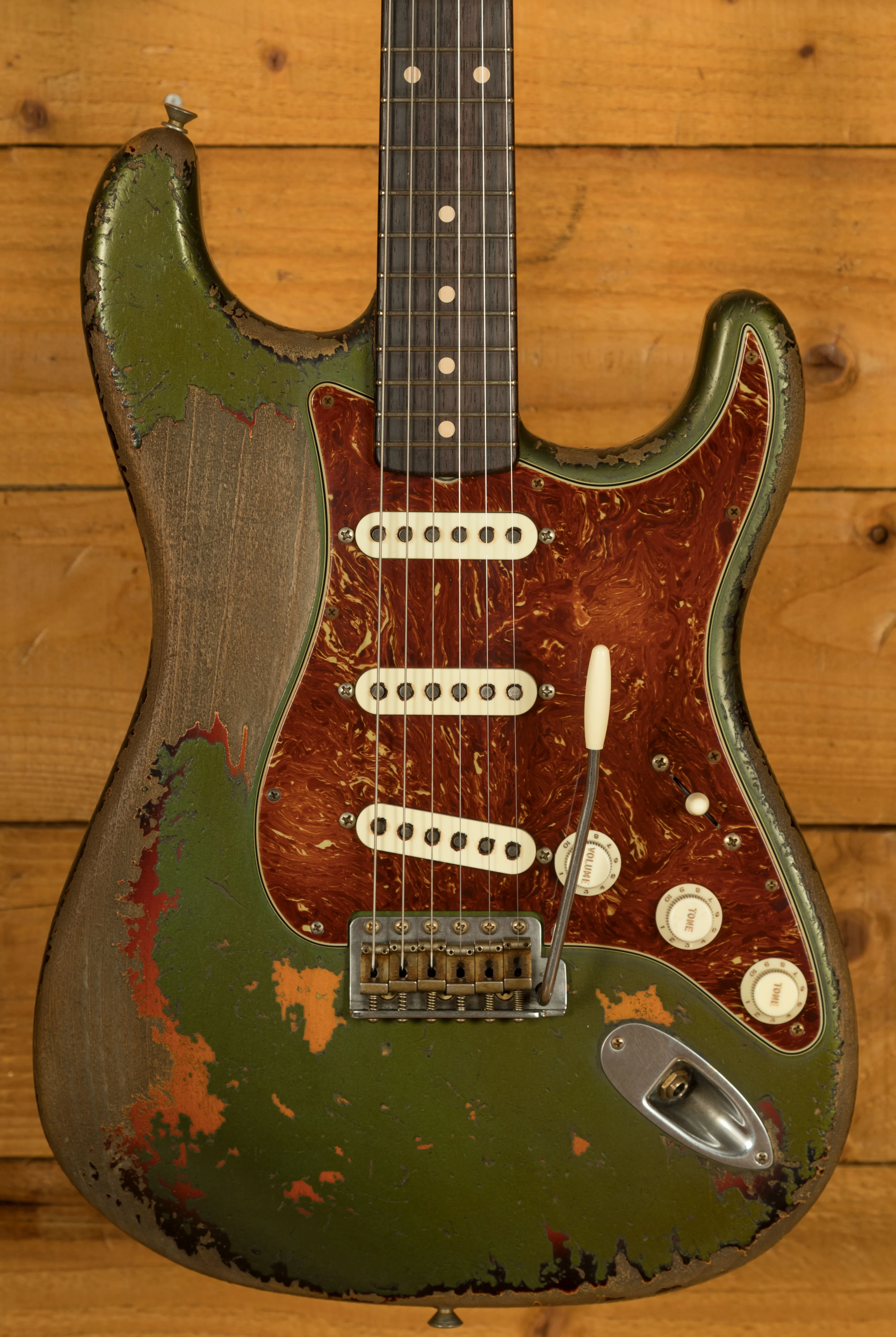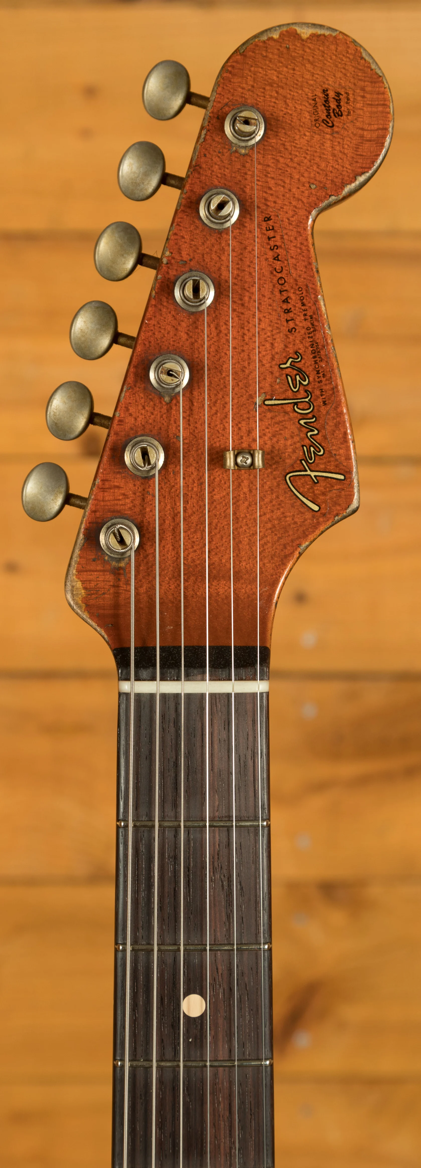 The 5/4 quartersawn Maple neck has a smooth finish. With an AAA Rosewood fingerboard, 7.25"-9.5" compound radius and 21 StewMac #0155 frets, the '60 Custom Shop Stratocaster can handle anything you throw at it without even breaking a sweat; it's supremely comfortable and well balanced. The 60 style oval C profile is a joy to play and offers a great platform for both rhythm and lead playing - measuring .790" at the 1st fret and .930" at the 12th fret.