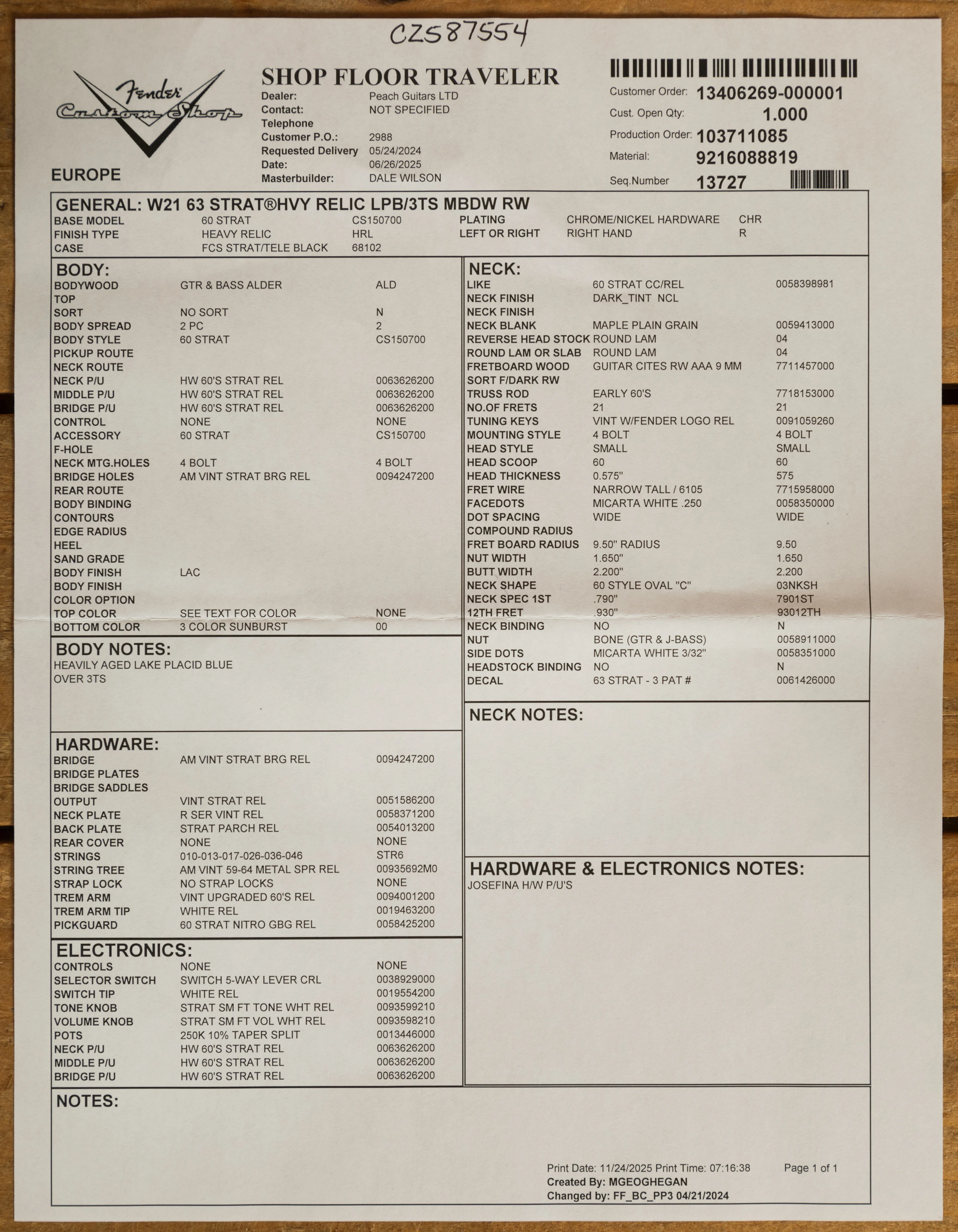 Dale Wilson is known across the globe as one of Fenders highly revered Masterbuilders, a select group of the worlds most esteemed luthiers. With this Godly status, any guitar with his name attached generates a huge amount of interest, and rightly so. For us here at Peach, Dale Wilson really is the master of ageing guitars. His techniques and skills have been refined over decades, and really do allow for some of the most authentic looking and feeling aged guitars around!