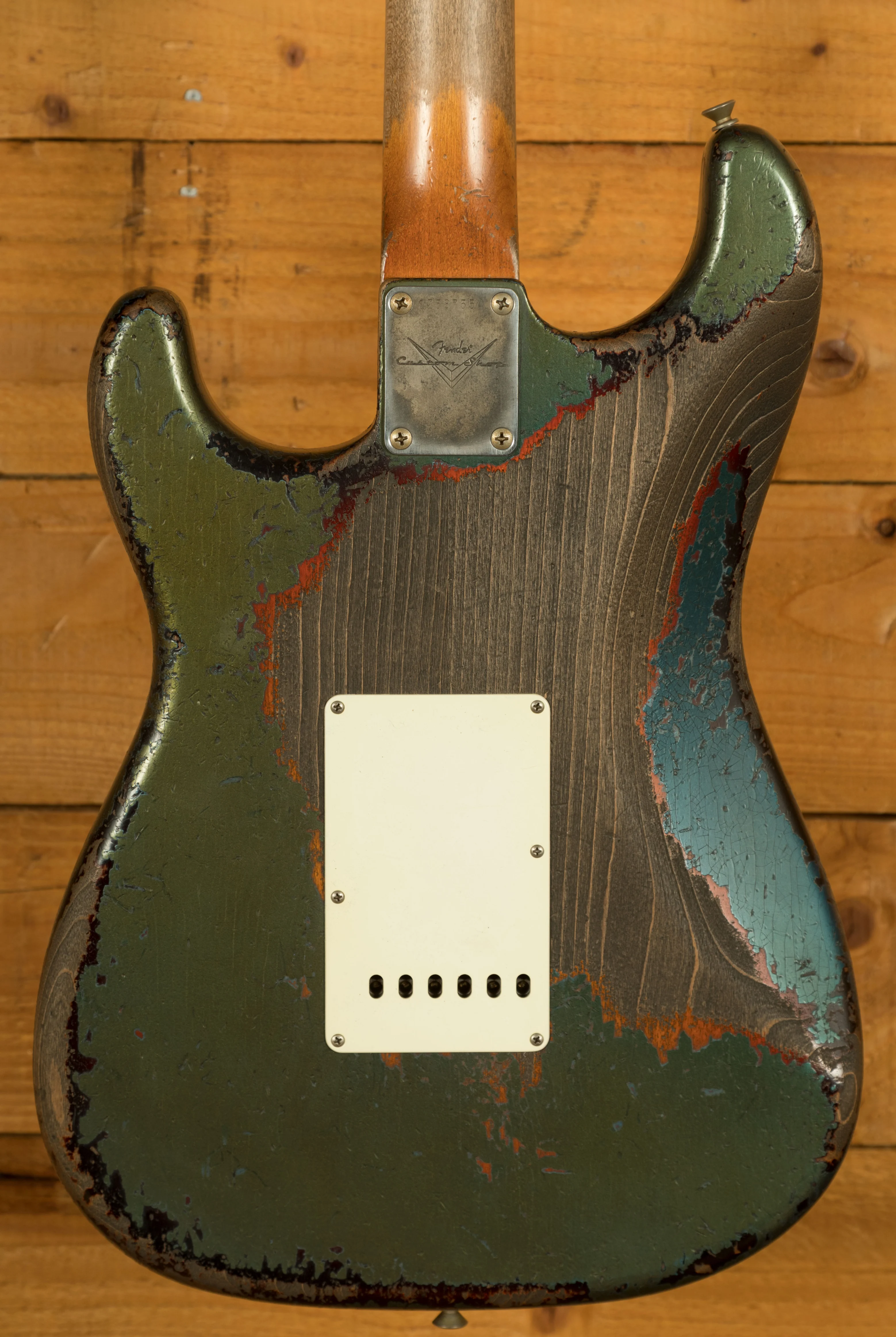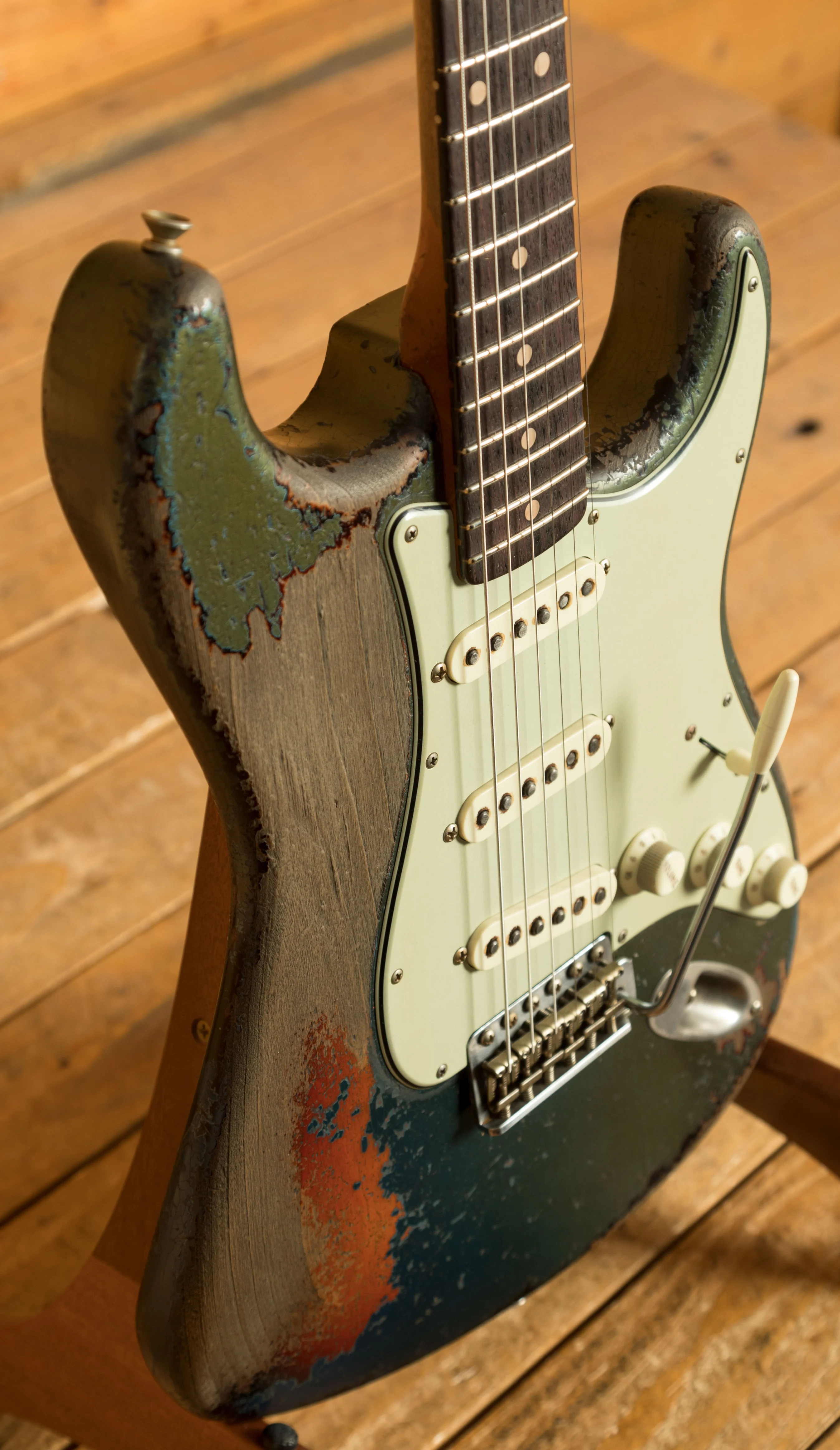 It features a lightweight Alder body, which is finished with a heavily aged Lake Placid Blue over 3-Tone Sunburst nitrocellulose lacquer. Dale really is the master at ageing a finish, he always knows how best to fade certain areas of the guitar, which gives each of his builds a totally unique look and feel. On this guitar, Dale has aged 80% of the top Lake Placid Blue nitrocellulose finish, giving it much more of a green hue. By the arm contour, and the belly carve, youll find the finish retains much more of a traditional Lake Placid Blue hue. This finish really does look the real deal, it looks exactly like an old 60s Strat that was ordered with an original custom colour finish.