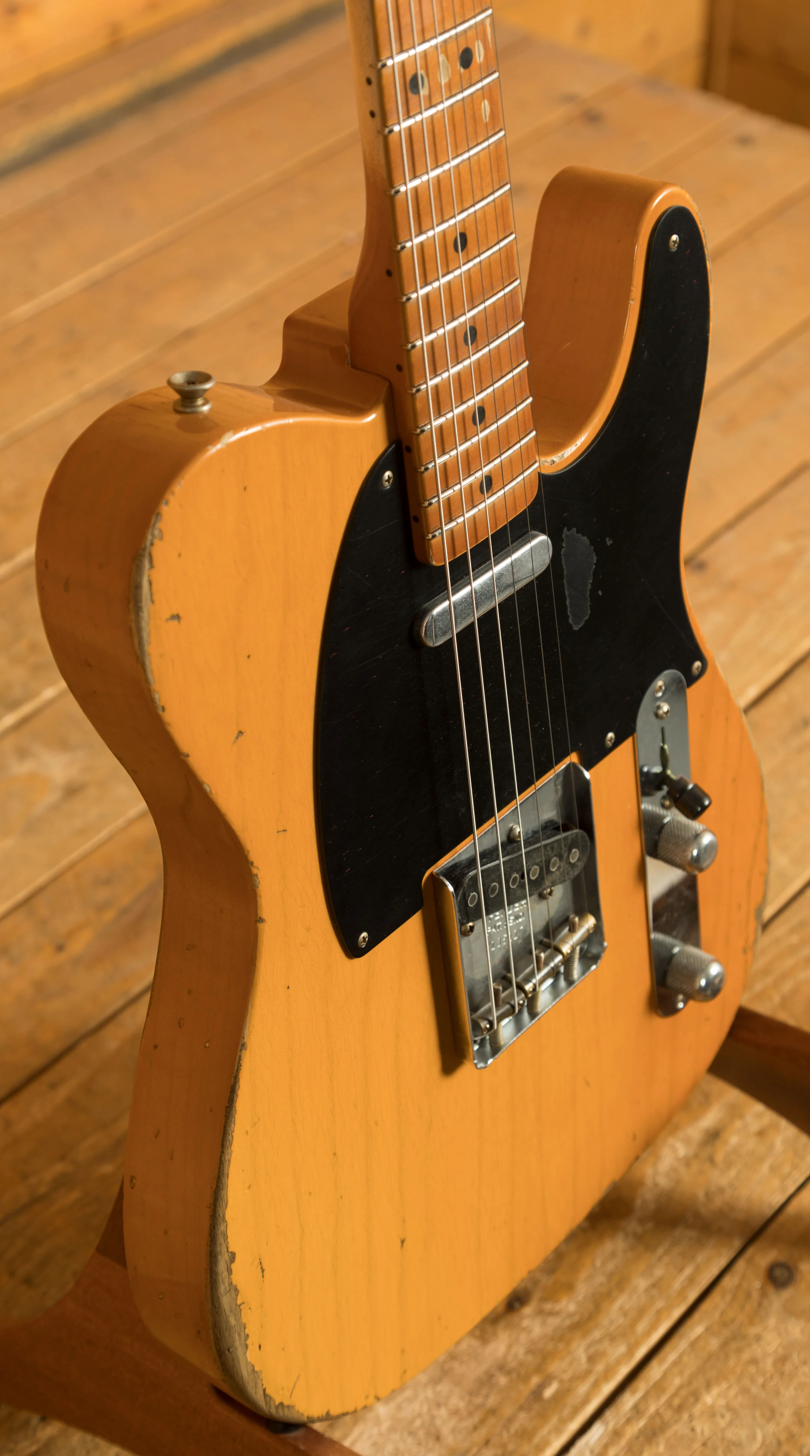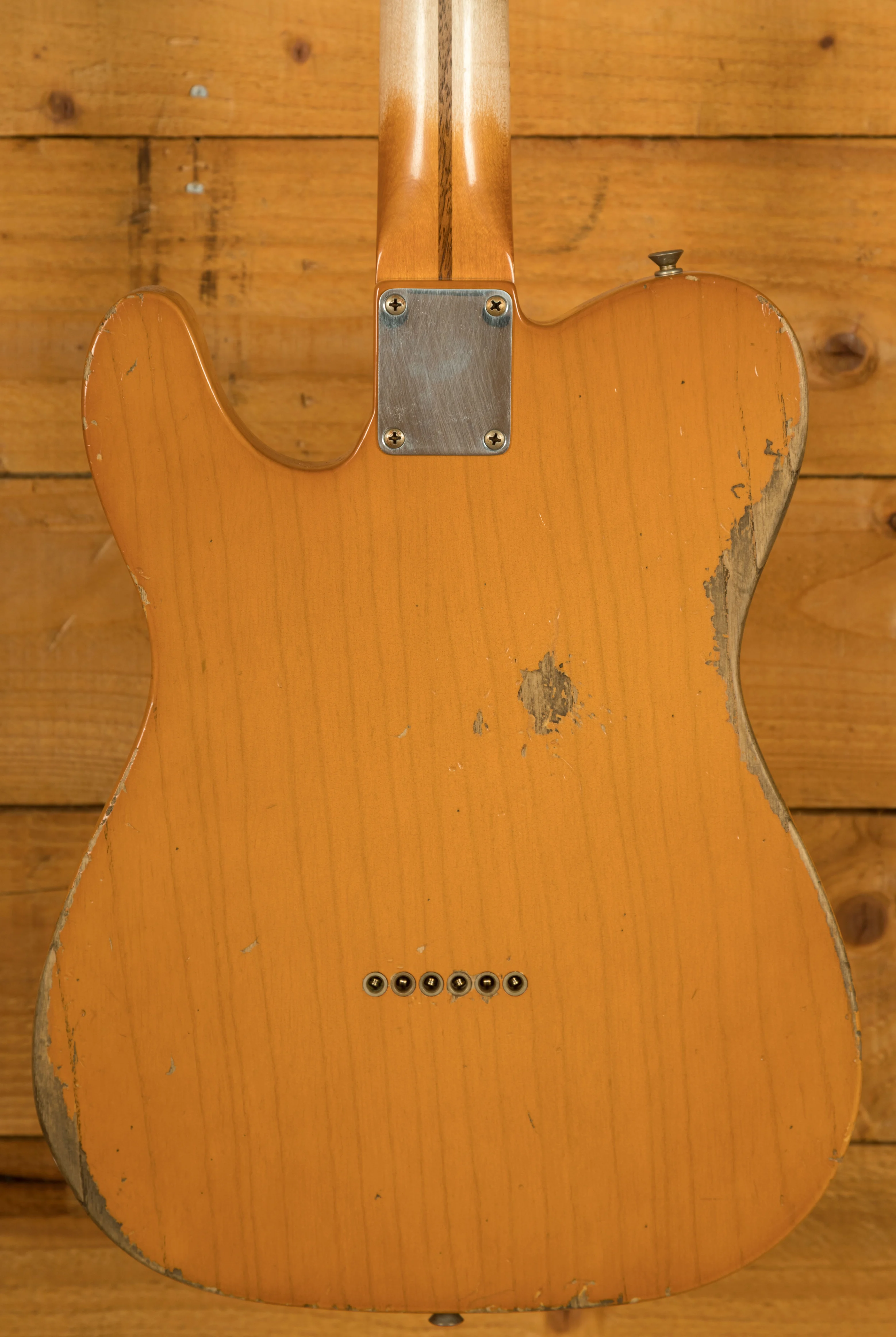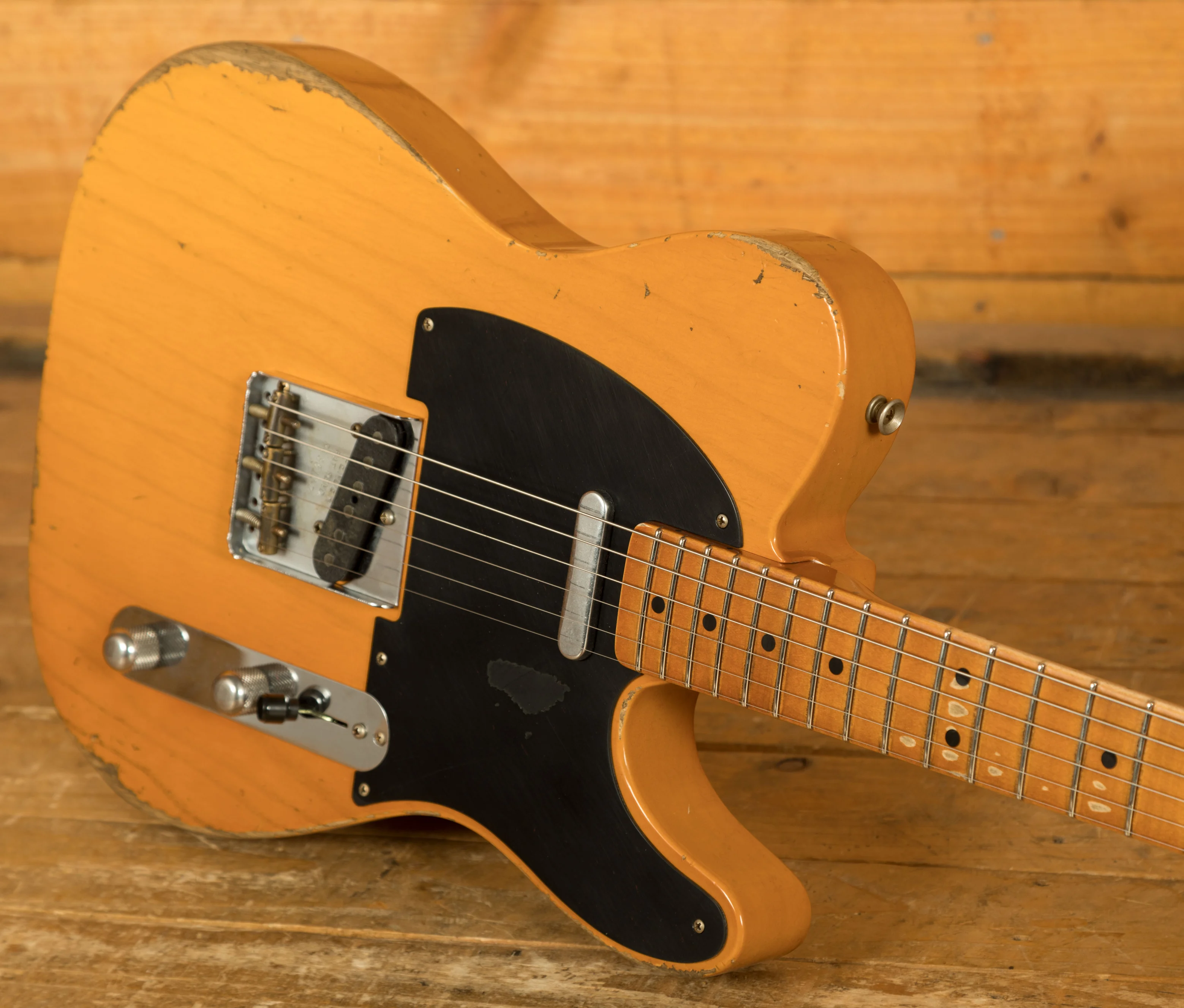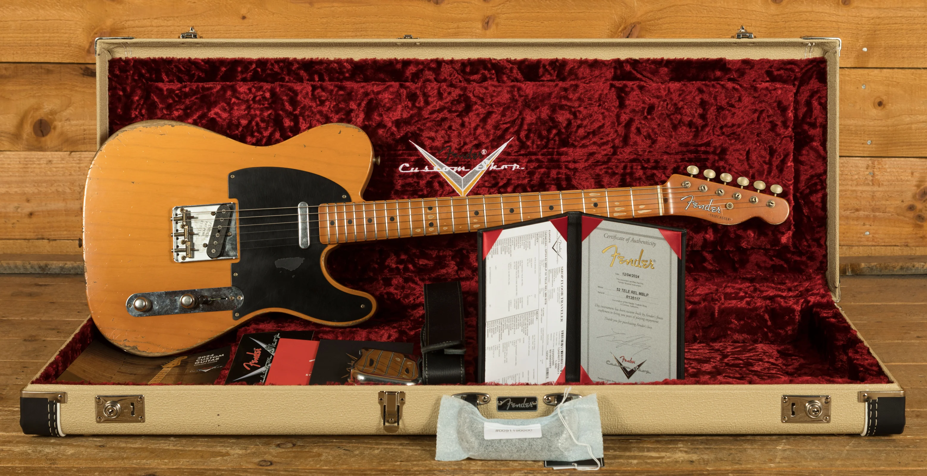 The foundation of this Telecaster is a carefully selected ash body. Ash, a tonewood favoured by Fender for decades, is known for its balanced tonal characteristics. It offers a resonant blend of brightness and warmth, with a well-defined midrange and a strong, clear low end. The hand-selection process ensures that only the finest ash, exhibiting optimal grain patterns,weight, and resonance was used for this exceptional Tele. The Relic Butterscotch Blonde finish gives the guitar the appearance of a well-loved and often-played instrument, complete with the subtle nuances of wear and tear that develop over years of use. This ageing process, painstakingly applied, adds a unique character and vintage vibe to the instrument. The finish checking, dings, dents, and worn areas all contribute to the story the guitar tells, giving it a sense of history and making it feel like a cherished instrument from the past. This Relic treatment extends to the neck, which boasts a '52 Tele Style "U" shape, providing a substantial and comfortable feel in the hand. The back of the neck is finished with a "Closet Classic Relic" and a worn and dirty look, enhancing the vintage aesthetic.