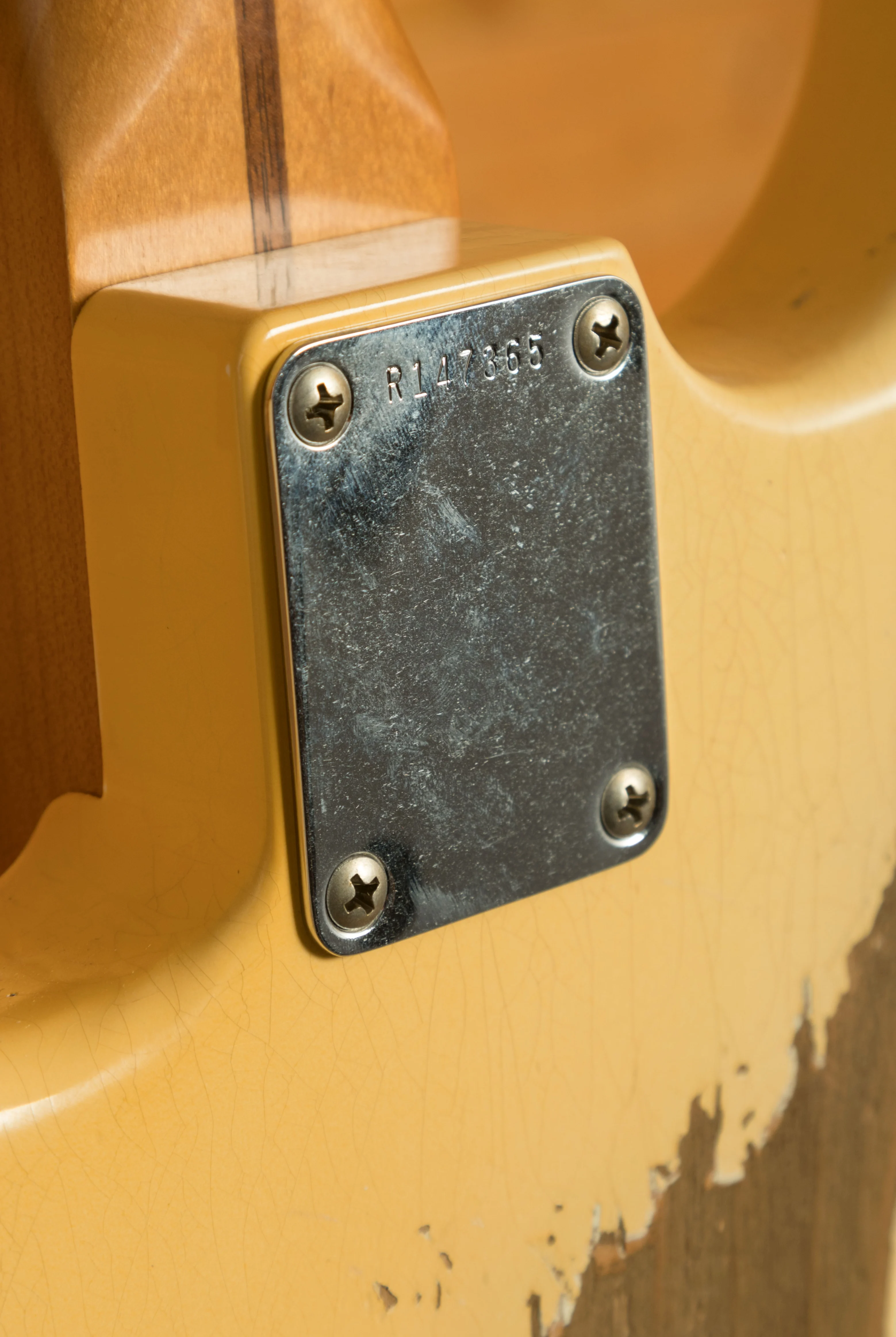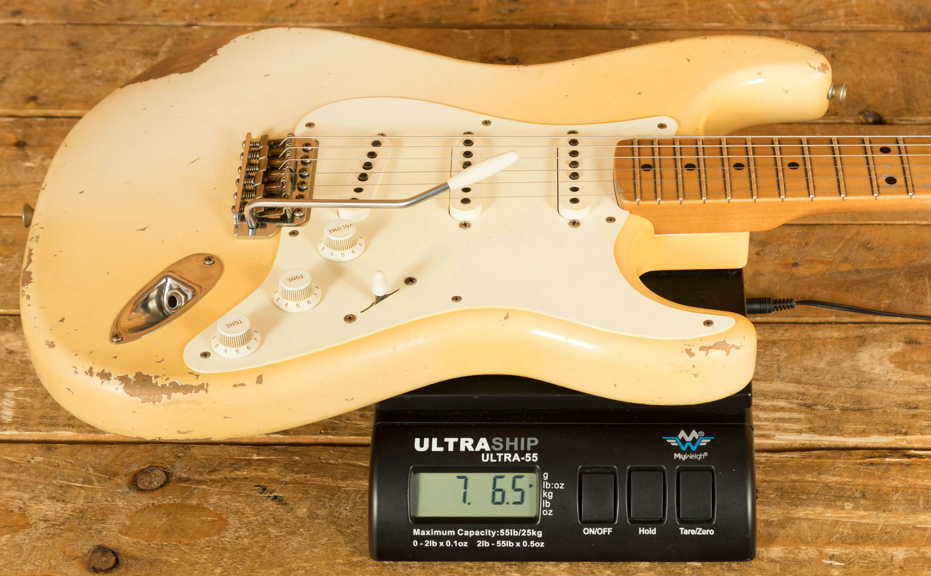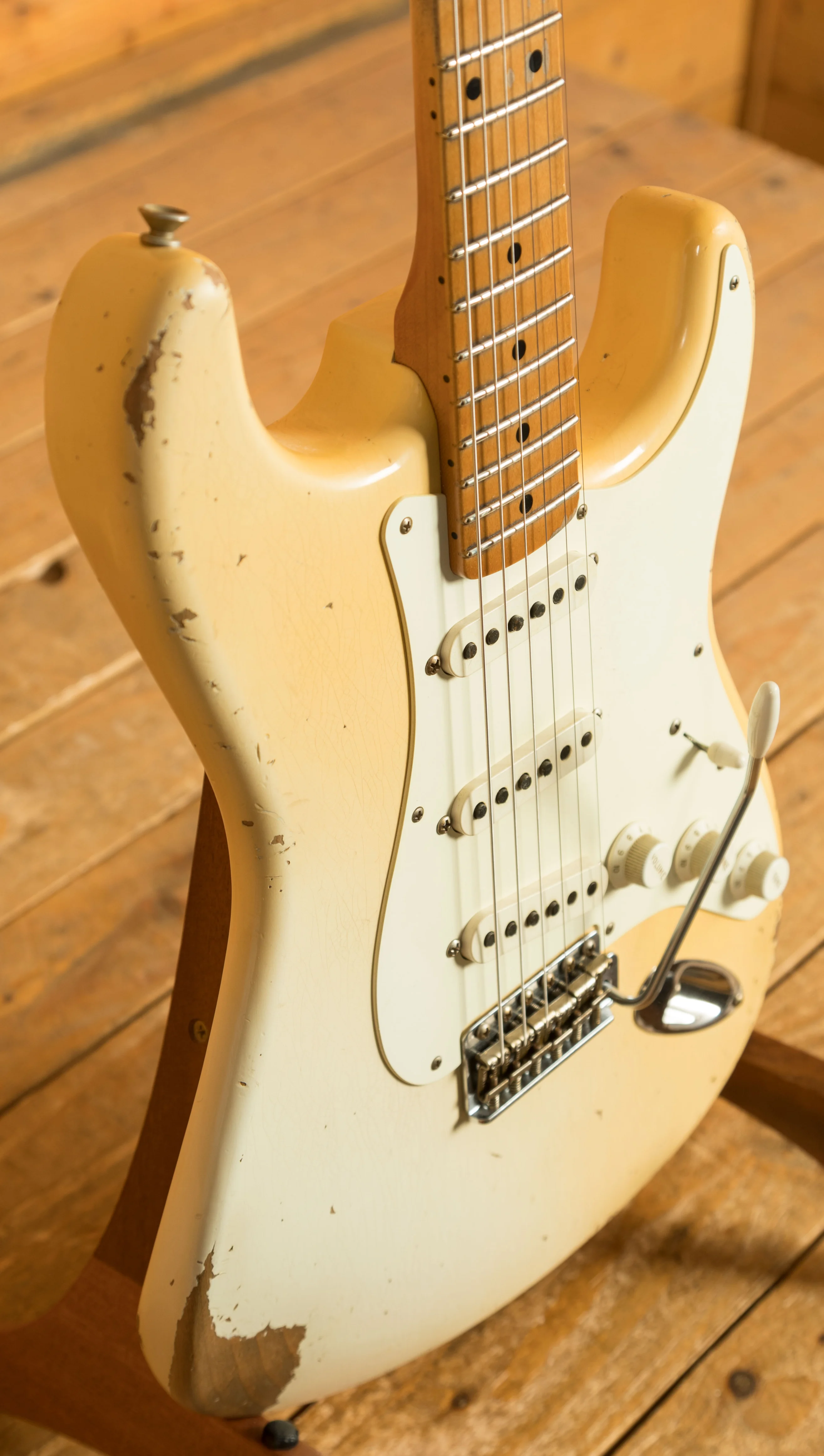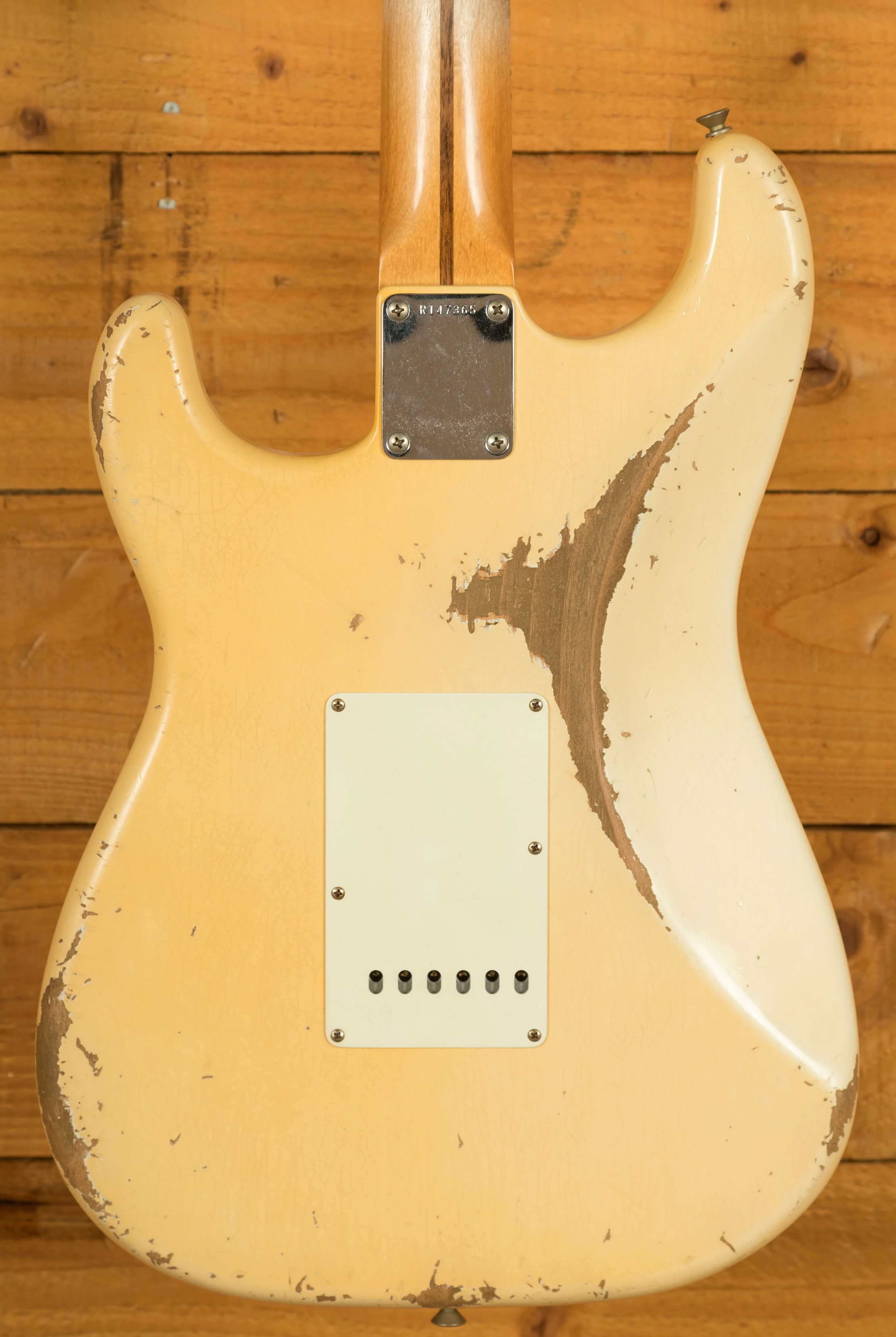 A sort for lightweight Alder body is finished in an Aged Olympic White nitro lacquer. Authentically aged, this finish will wear beautifully with time and develop its own character even further. The thin nitro finish also allows the natural resonance of the body to sing and sustain much more effectively.
