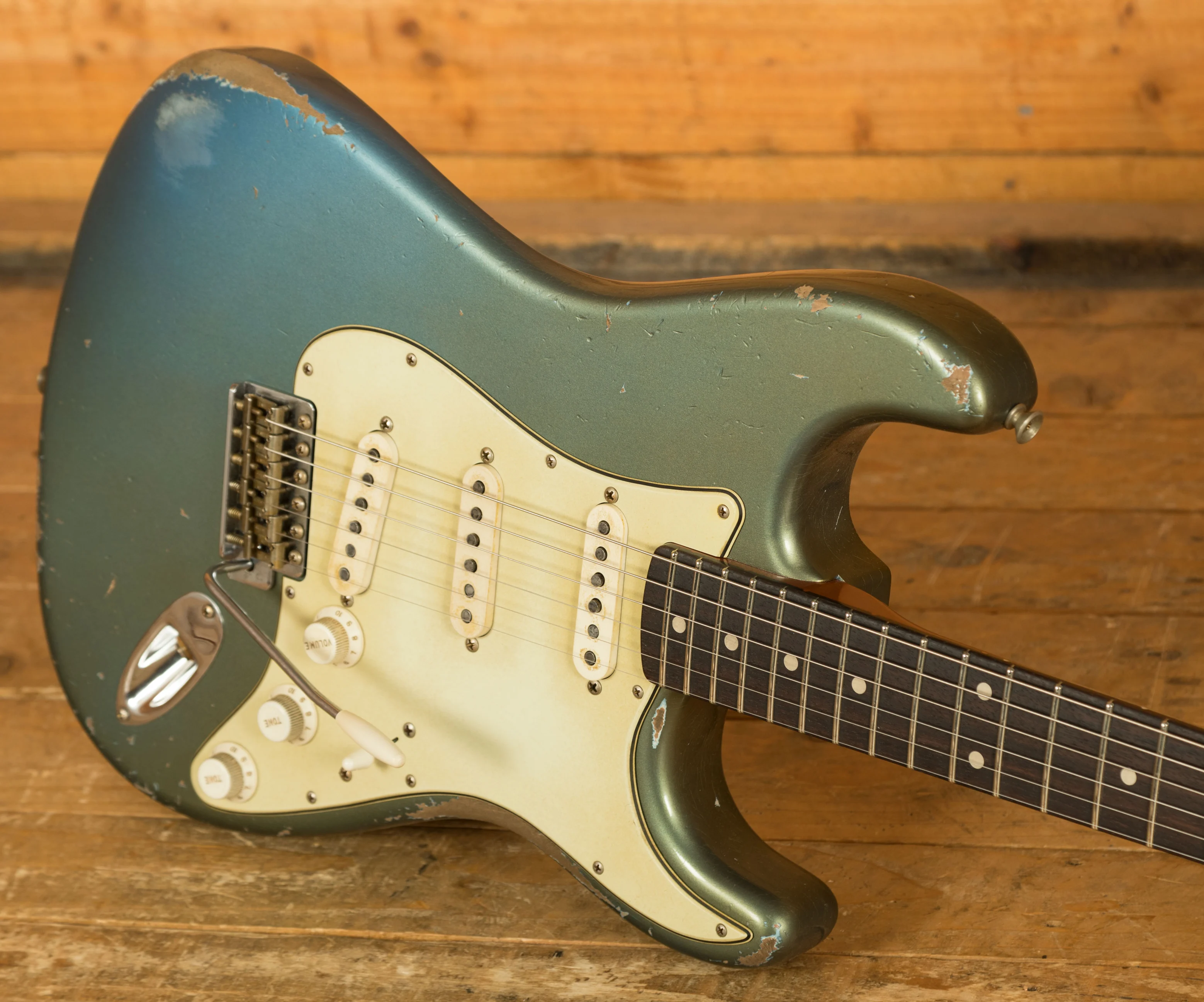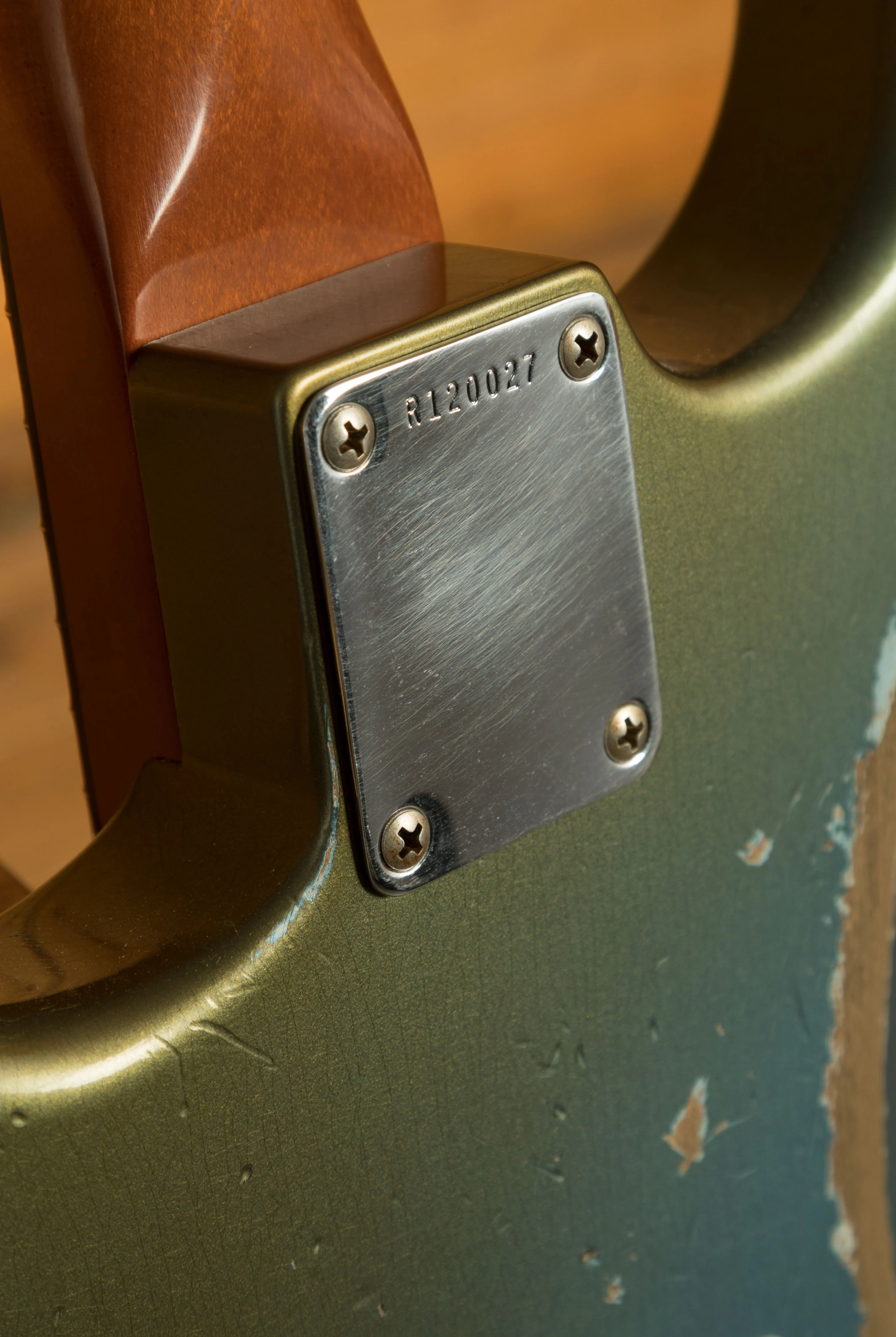 A sort for lightweight Alder body is finished in a Super Faded Aged Lake Placid Blue nitro lacquer. Authentically aged, this finish will wear beautifully with time and develop its own character even further. The thin nitro finish also allows the natural resonance of the body to sing and sustain much more effectively.
