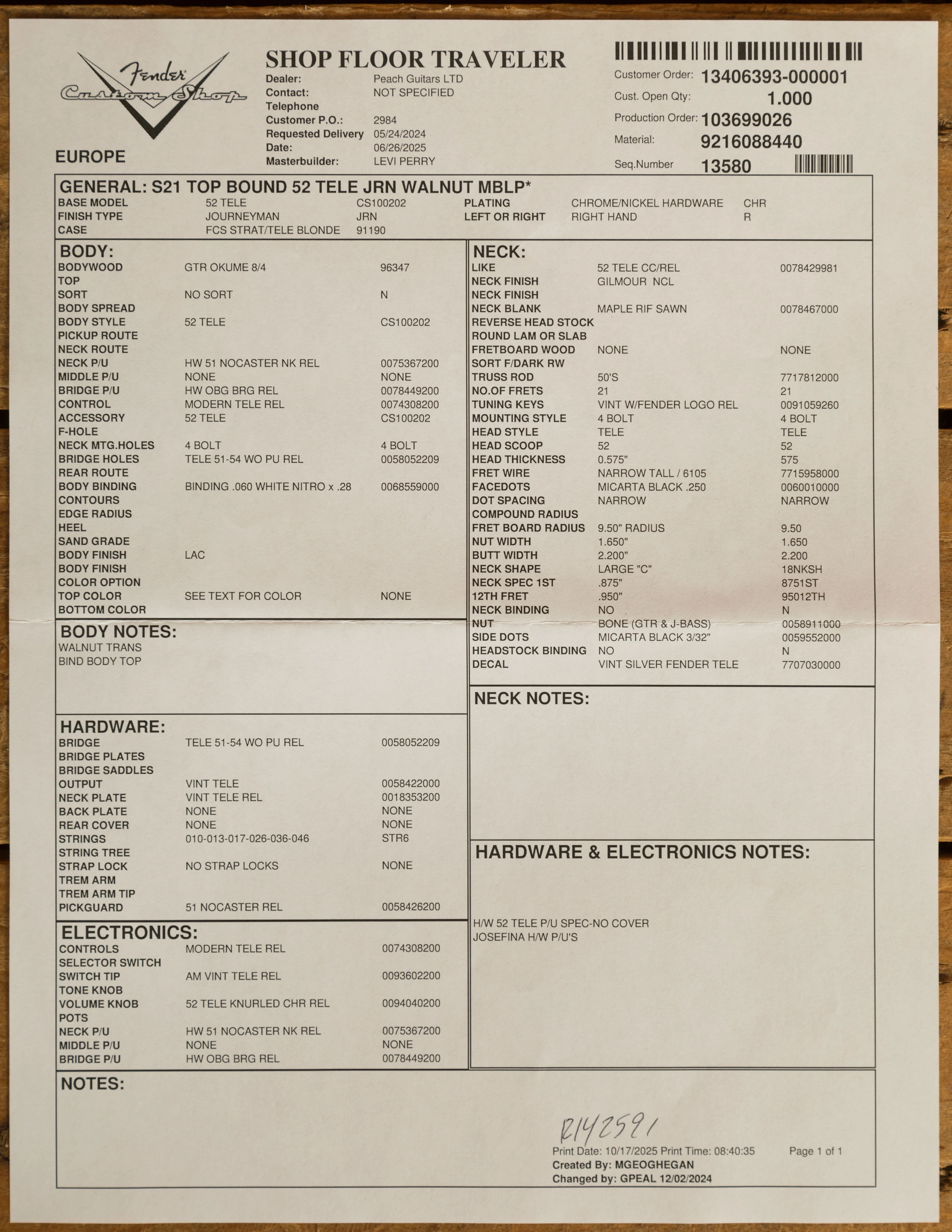 Masterbuilt Fenders are truly the cream of the crop and the Levi Perry '52 Tele is no exception. Unusually, this tele features an Okoume body in a Trans Walnut finish with white top binding - it's a unique piece that definitely stands out from the the crowd. The Large "C" Maple neck feels a treat to play, measuring .875" at the 1st fret and .950" at the 12th, and with a classic 9.5" radius it's a joy to play.