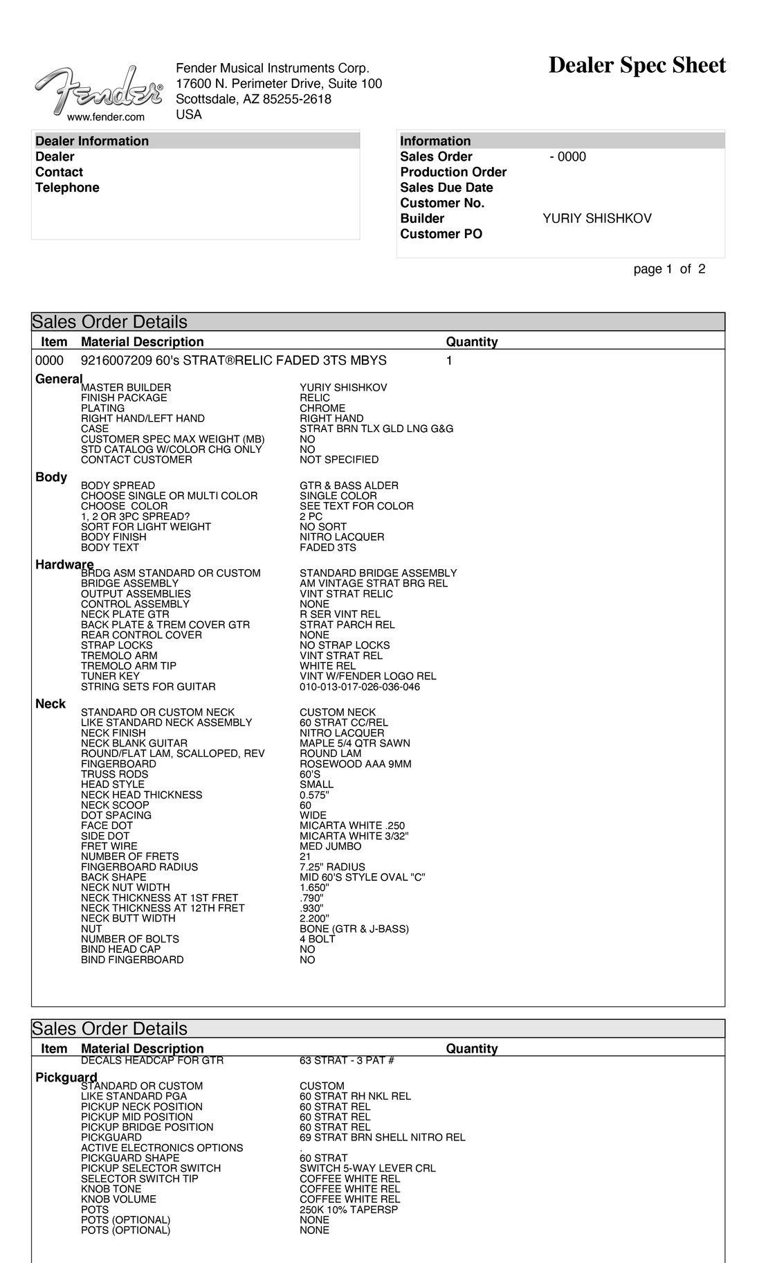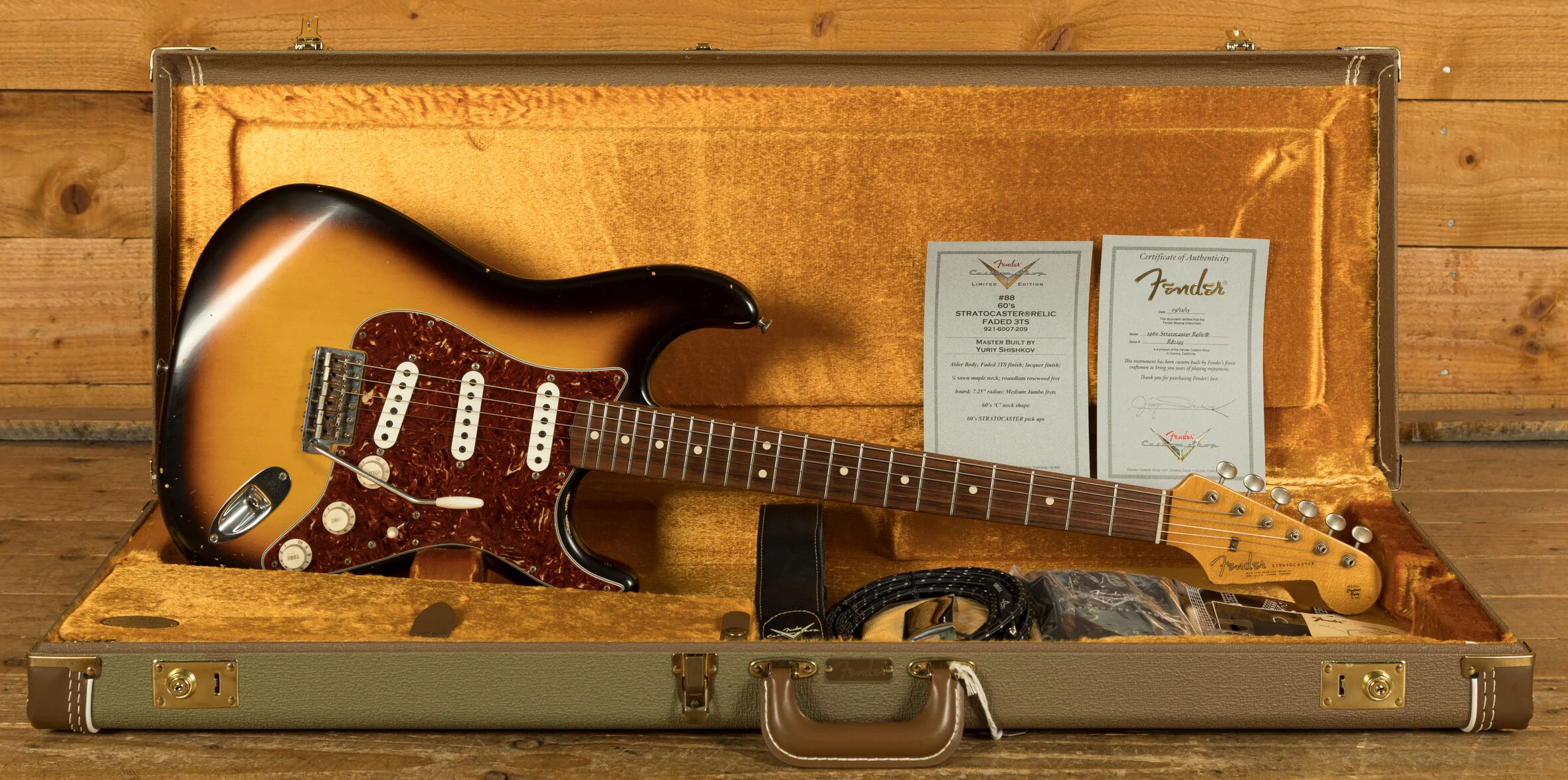 This Fender Custom Shop Masterbuilt '60s Strat Relic, crafted in 2015 by renowned Masterbuilder Yuri Shishkov is a tribute to the pre-CBS Stratocasters of the early 1960s. This guitar features a 2-piece alder body finished in a faded 3-Tone Sunburst nitrocellulose lacquer, showcasing the aged patina of a well-played vintage instrument through its Relic treatment. The quartersawn maple neck, carved to a Mid '60s Style Oval "C" profile (.790" at 1st fret, .930" at 12th), is paired with an AAA-grade rosewood fingerboard featuring a 7.25" radius, 21 medium jumbo frets, and clay dot inlays, offering a 25.5" scale length for an authentic ‘60s playing feel. The AAA-grade rosewood enhances the tonal warmth and visual appeal, while in good condition with light signs of use beyond its factory Relic finish, this Strat preserves its vintage charm while delivering the quintessential pre-CBS '60s Strat tone—bright, bell-like, and articulate with a warm, organic resonance. With Yuri Shishkov’s retirement, his Masterbuilt guitars are no longer available new, making this a rare collector’s piece.