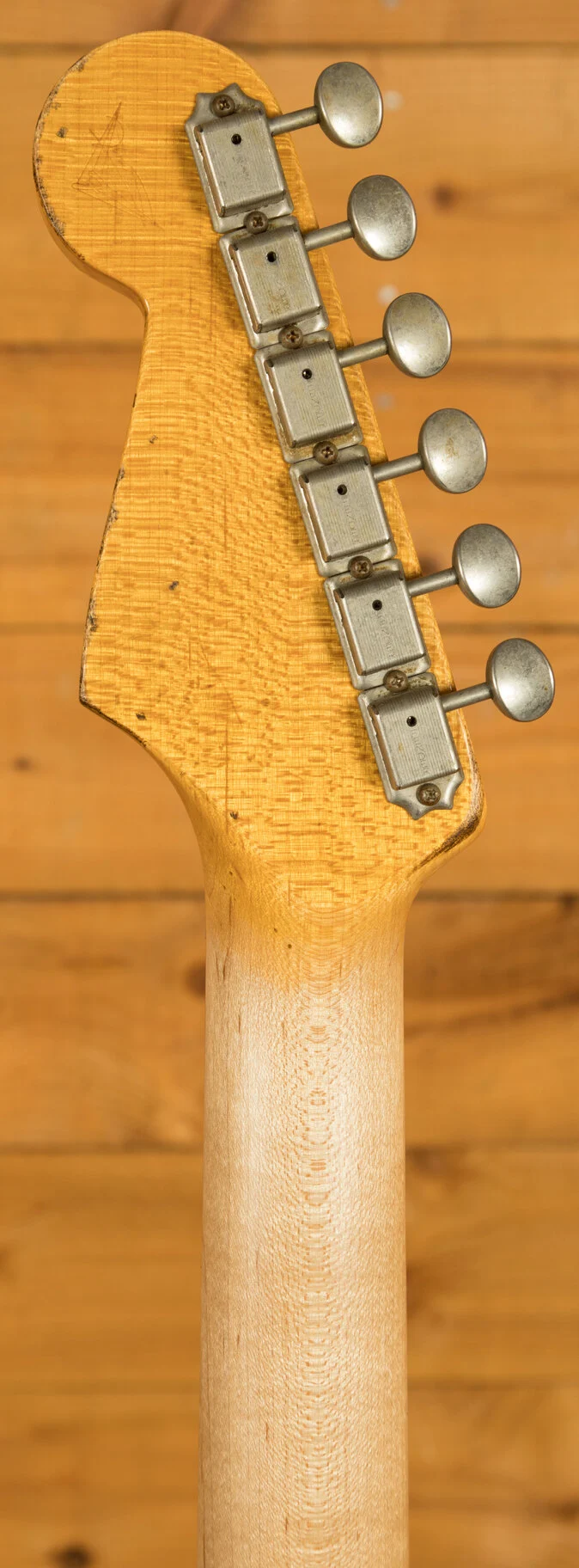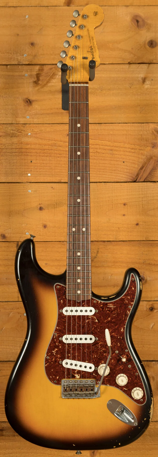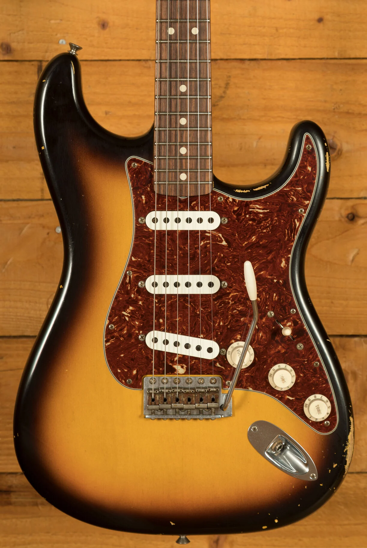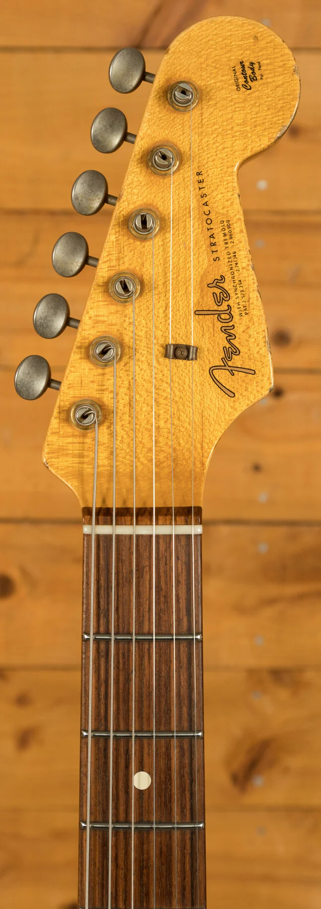 Pickups & Hardware: Standard '60s Strat single-coil pickups on a Torty guard with a 5-way switch, master volume, and two tone controls, complemented by a vintage-style synchronized tremolo with steel saddles and vintage-style tuning keys in relic’d nickel finish.