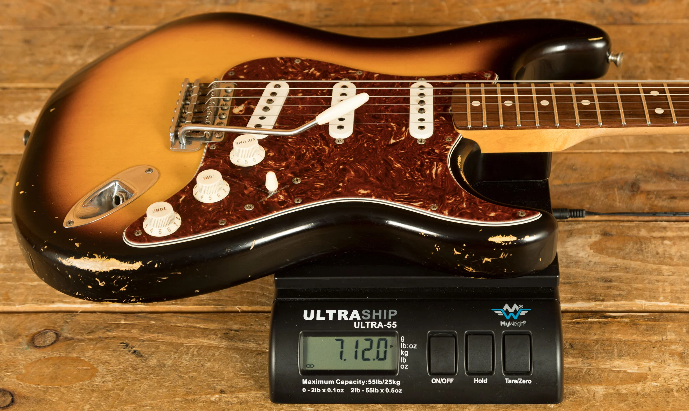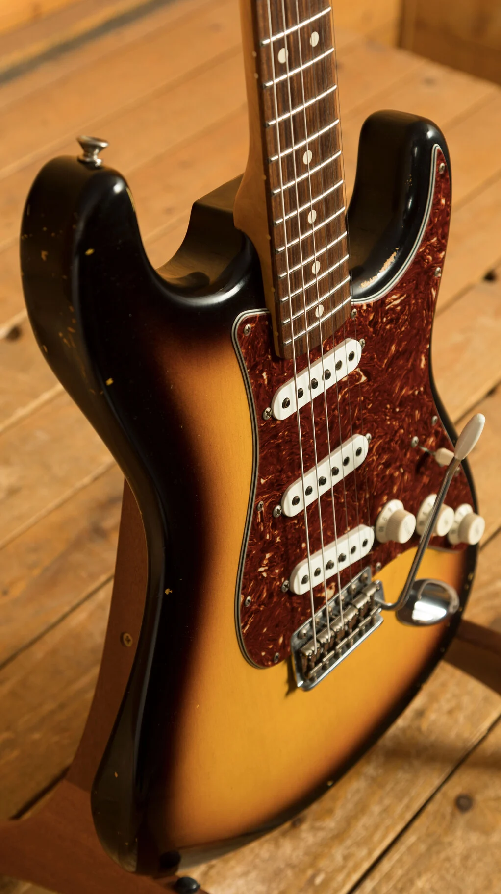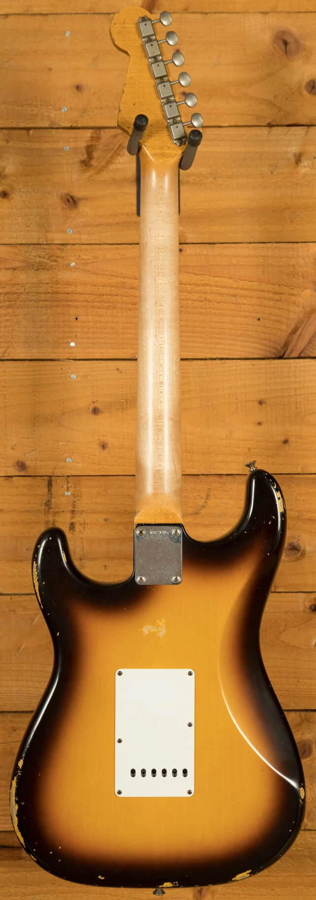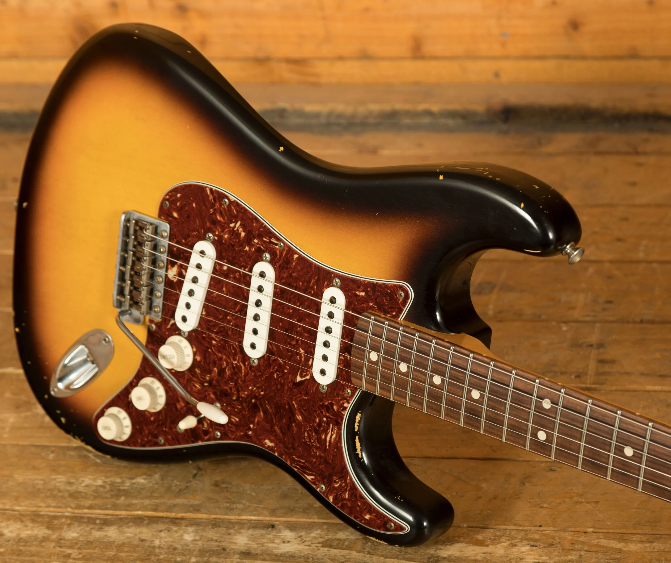Pickups & Hardware: Standard '60s Strat single-coil pickups on a Torty guard with a 5-way switch, master volume, and two tone controls, complemented by a vintage-style synchronized tremolo with steel saddles and vintage-style tuning keys in relic’d nickel finish.