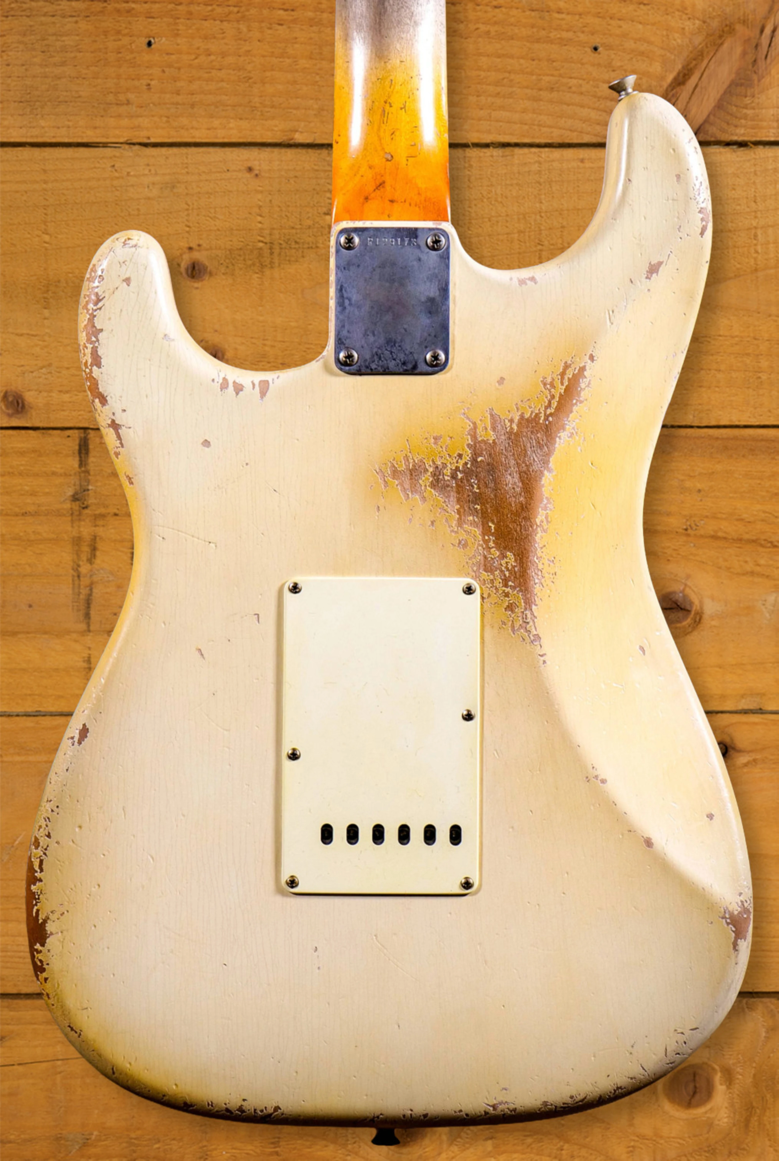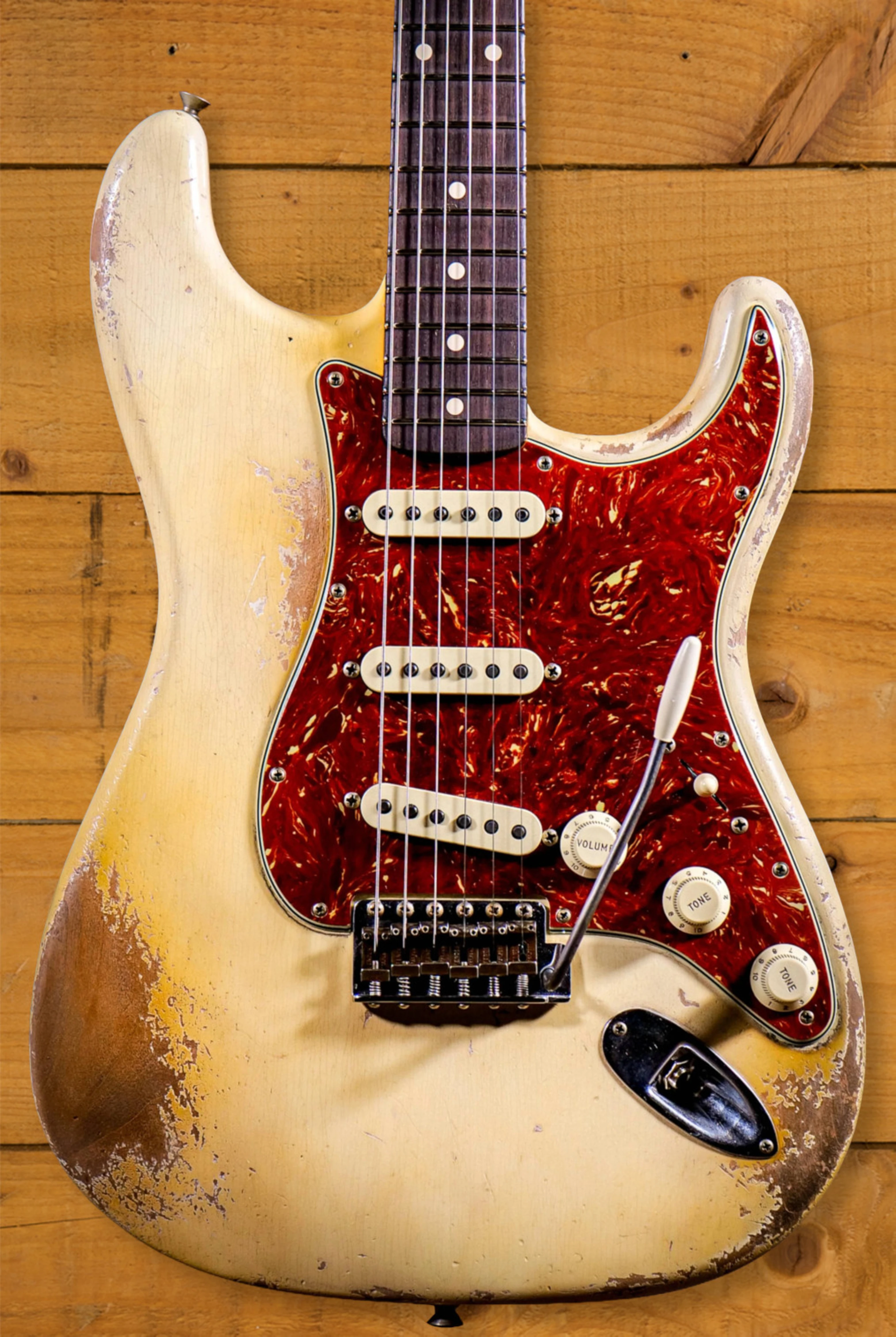 The sort of lightweight Alder body is finished in an awesome Aged Vintage White nitro lacquer, one of Fender's most popular custom finishes, it's a real beauty! This piece has received the whole Masterbuilt treatment, it sports an awesome Relic finish This finish will continue to wear beautifully with time and develop its own character even further. The thin nitro finish also allows the natural resonance of the body to sing and sustain much more effectively when compared to other finishes.