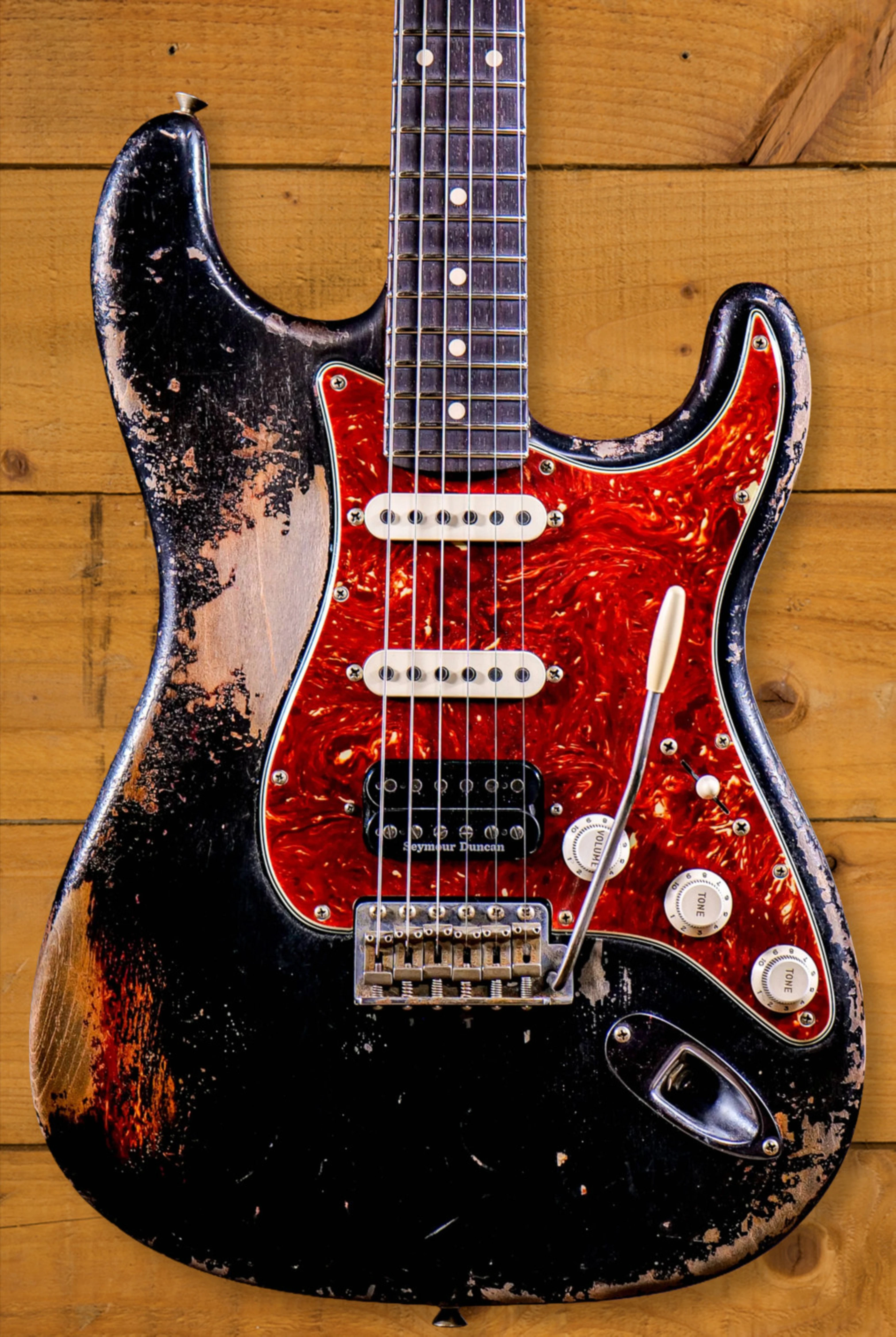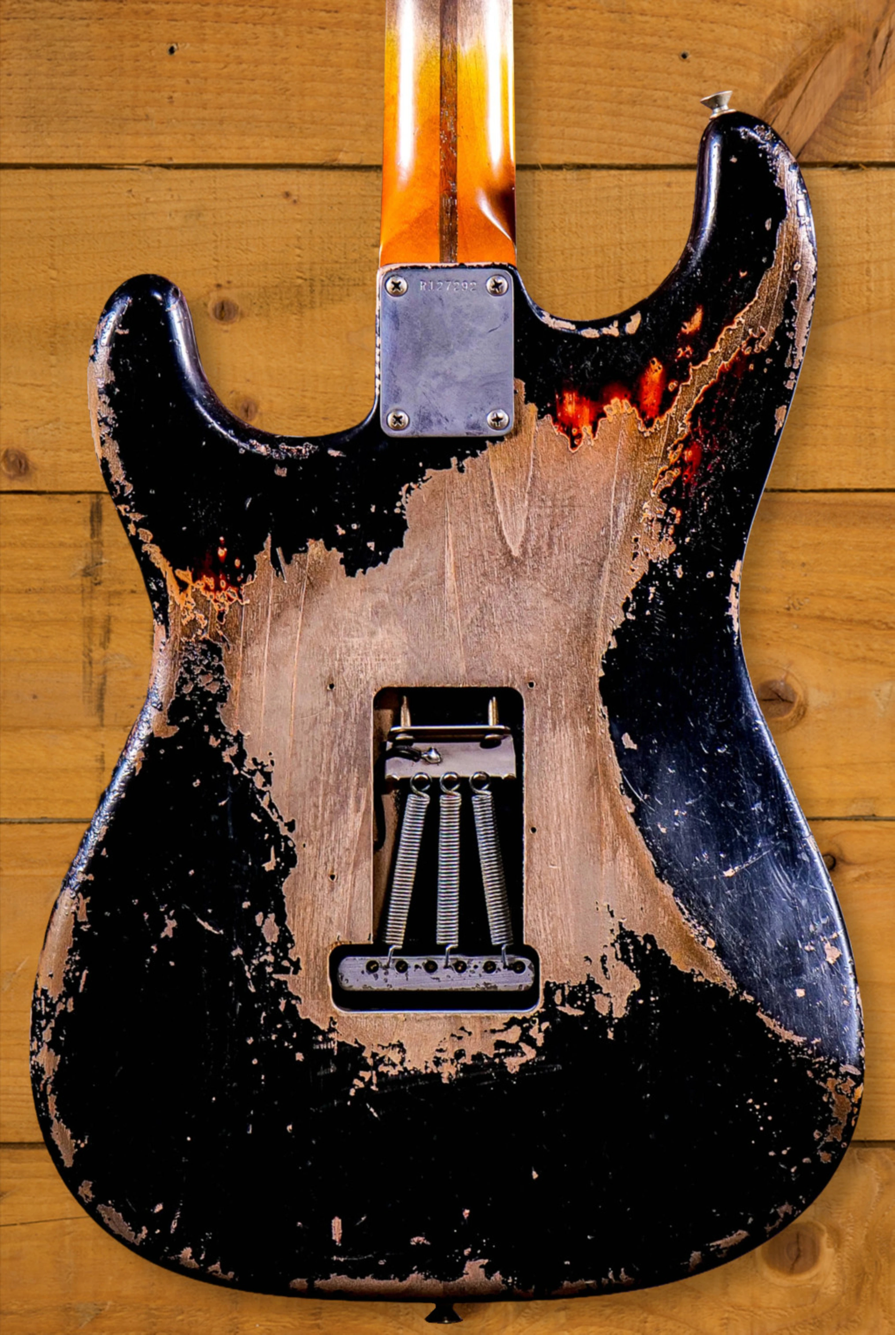 The sort of lightweight Alder body is finished in an awesome Black over 3-Tone Sunburst nitro lacquer, one of Fender's most popular custom finishes, it's a real beauty! This piece has received the whole Masterbuilt treatment, sporting an awesome relic finish. This finish will continue to wear beautifully with time and develop its own character even further. The thin nitro finish also allows the natural resonance of the body to sing and sustain much more effectively when compared to other finishes.