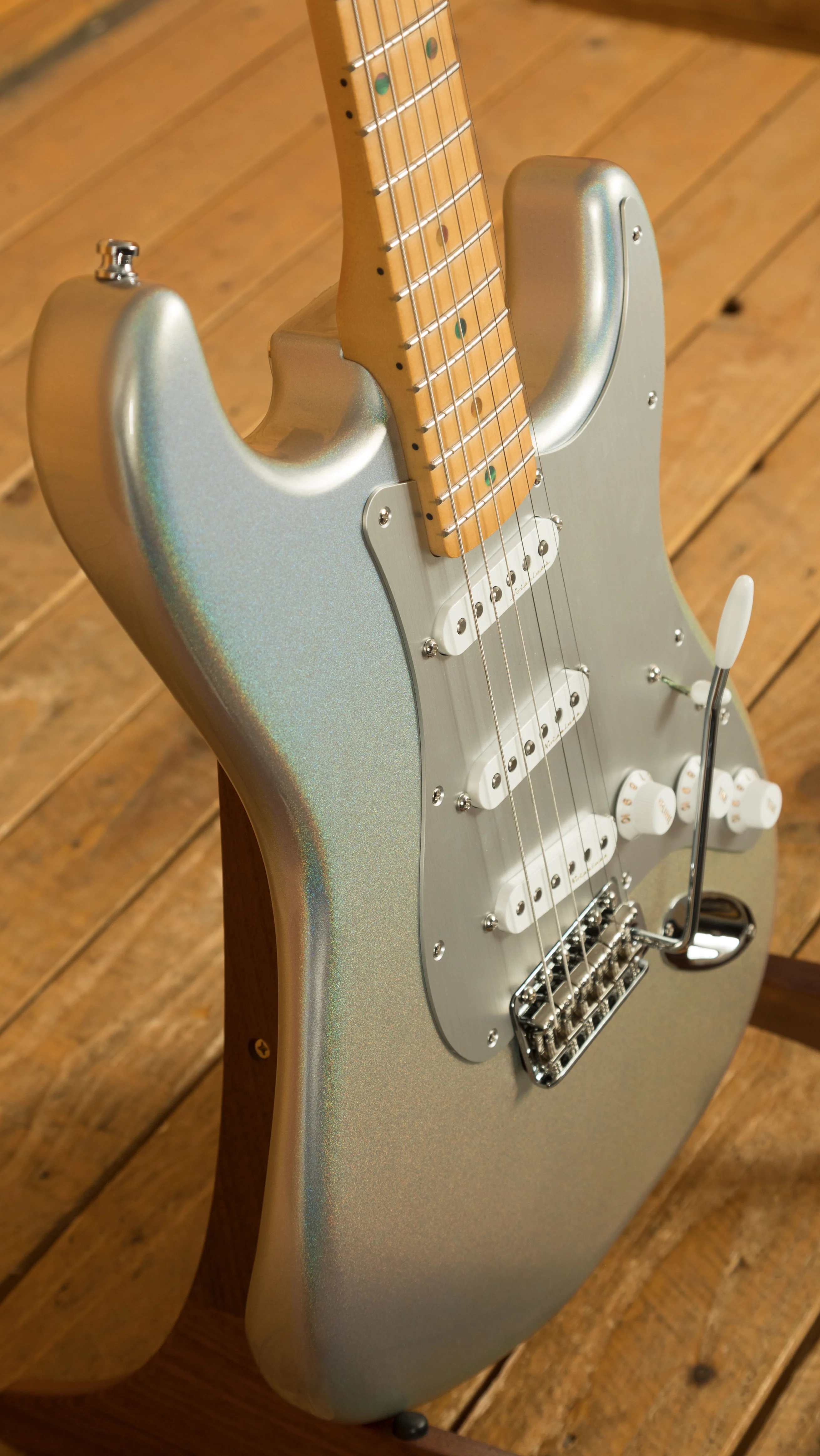 Constructed with an Alder body paired with a Maple neck and fingerboard, you know your in for some serious tone when these woods come together, Finished in a gorgeous Chrome Glow with stunning Chrome Hardware and Anodized aluminium pickguard. This guitar looks awesome and is sure to turn a heads in amazement.