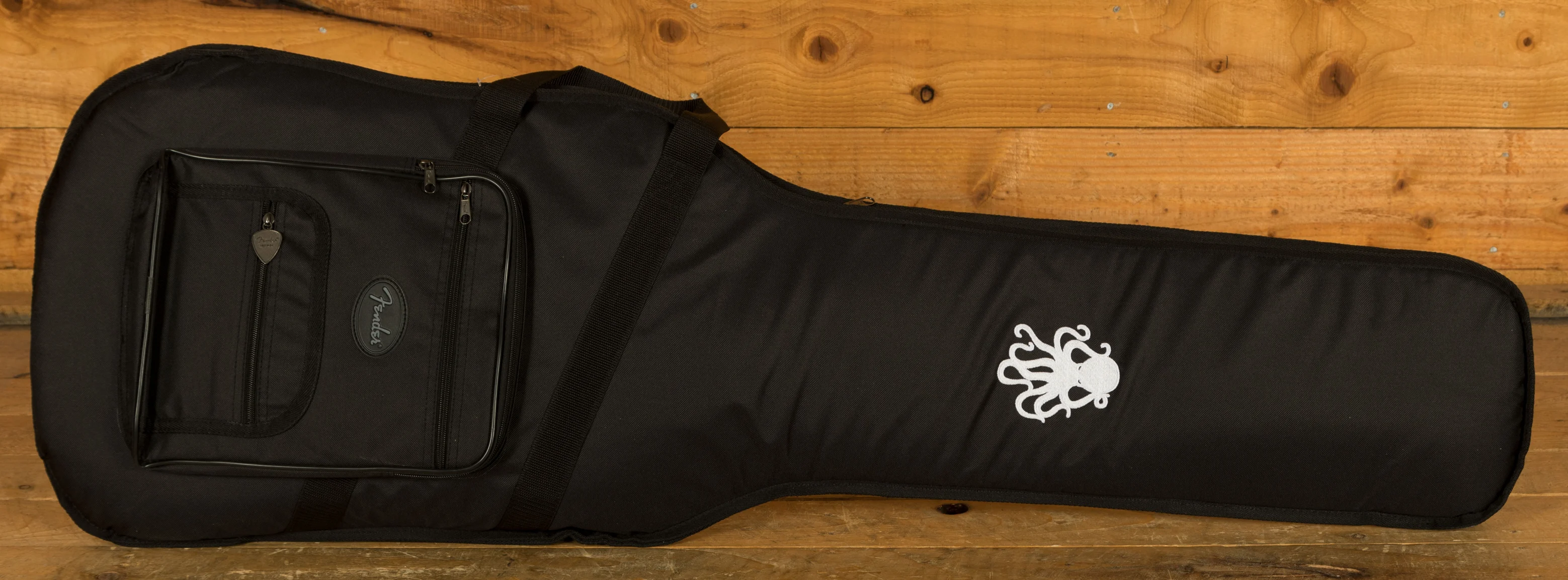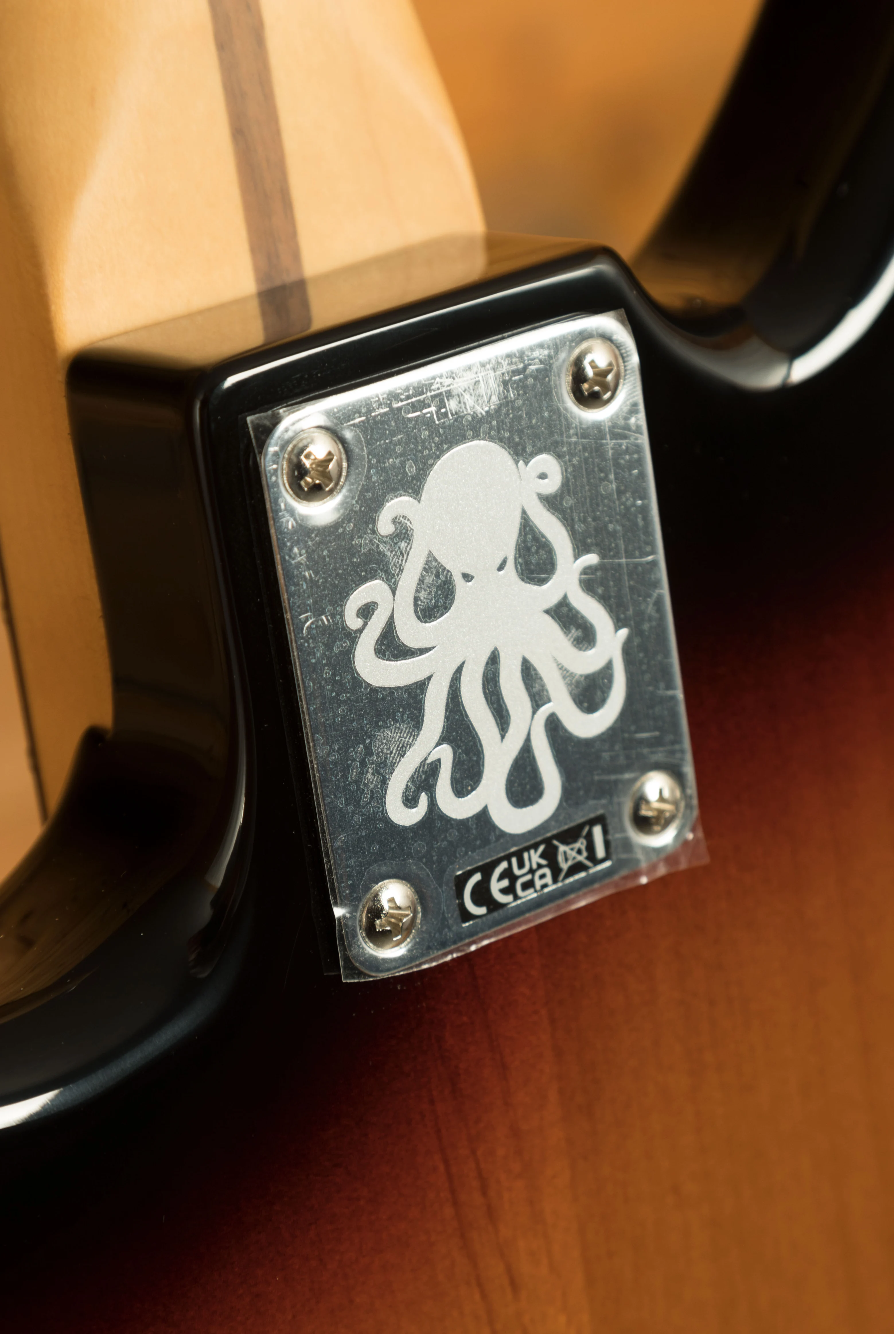 At the heart of this bass is the custom "C" maple neck, which is specially designed for comfort and ease of play. The sculpted profile of the neck allows for smooth transitions across frets, making it easier for players to maintain control and accuracy during fast or complex passages. In addition, the bass is equipped with a custom Mark Hoppus neck plate, featuring his iconic "Hi My Name is Mark" octopus logo, adding a personalised touch that fans will appreciate.