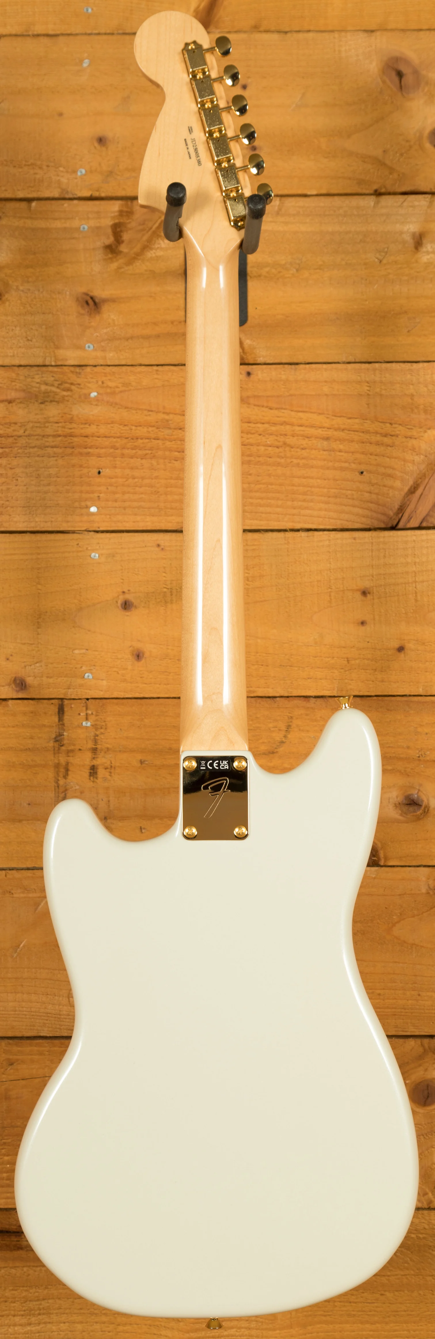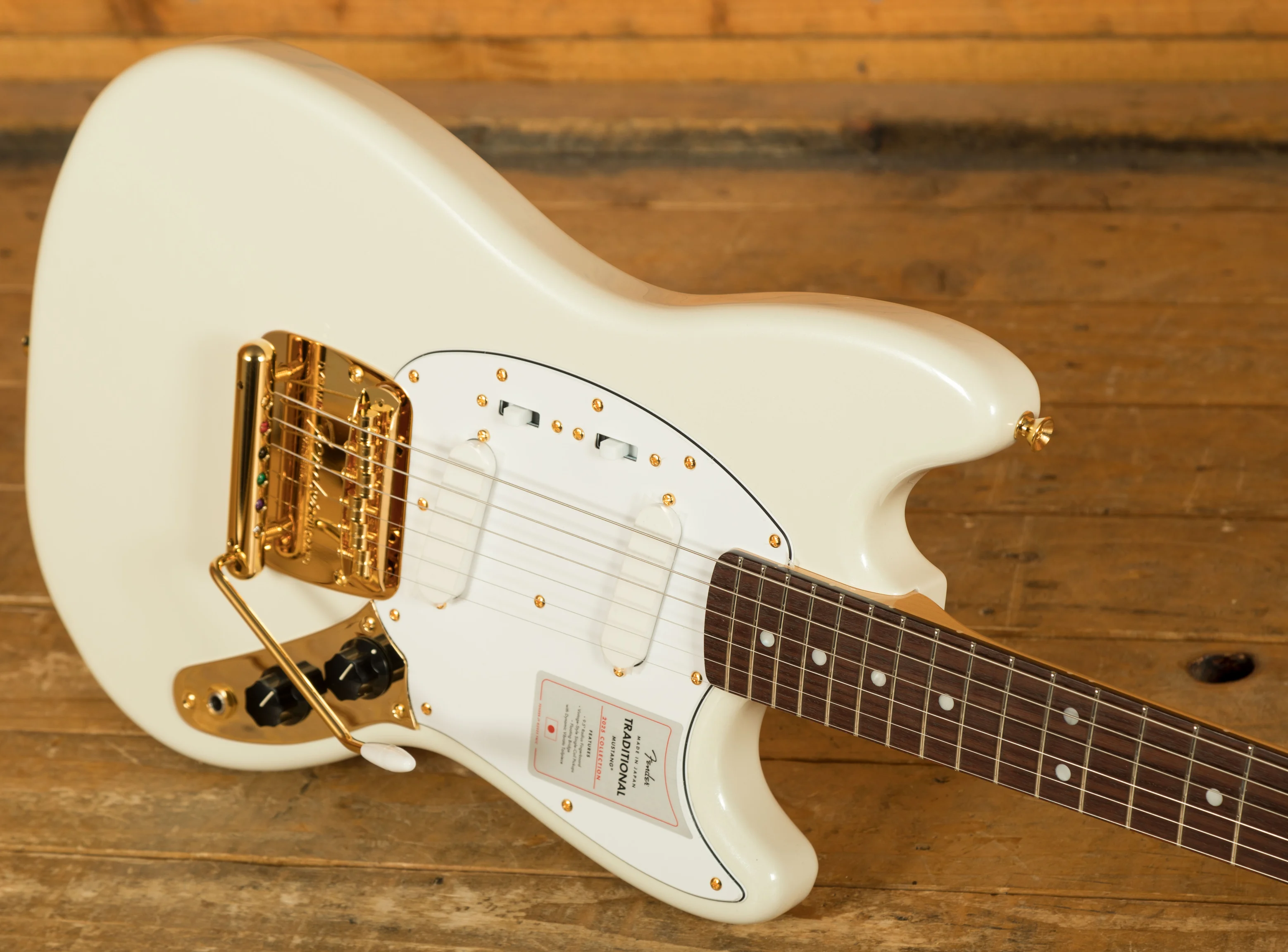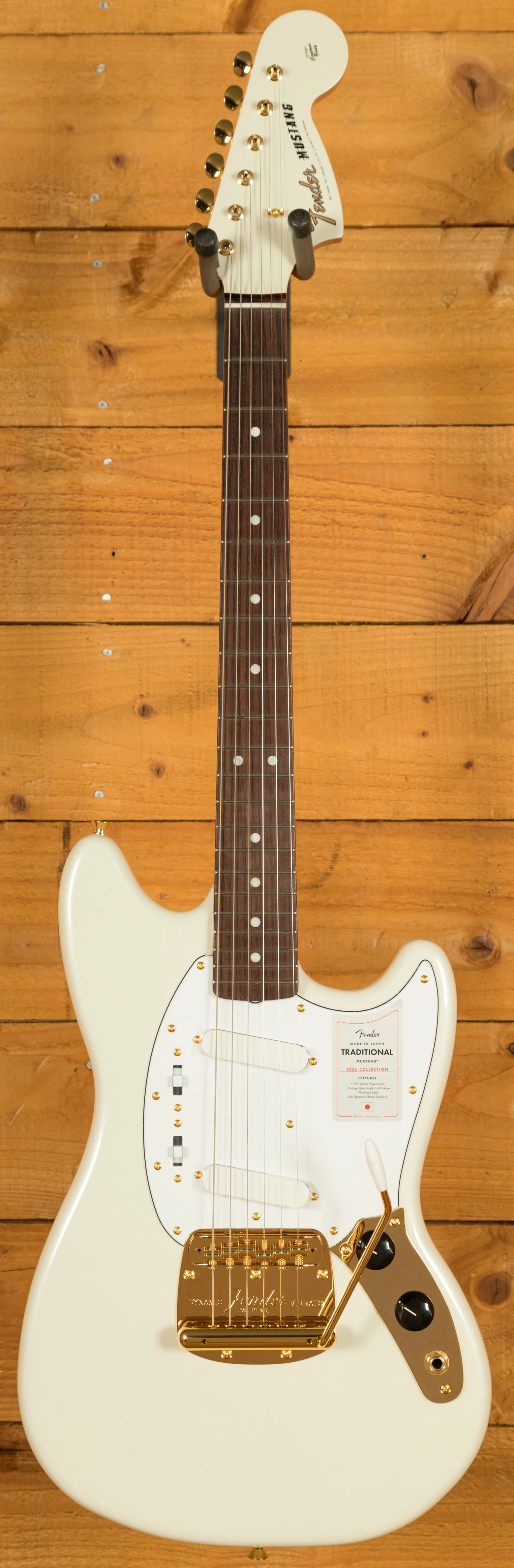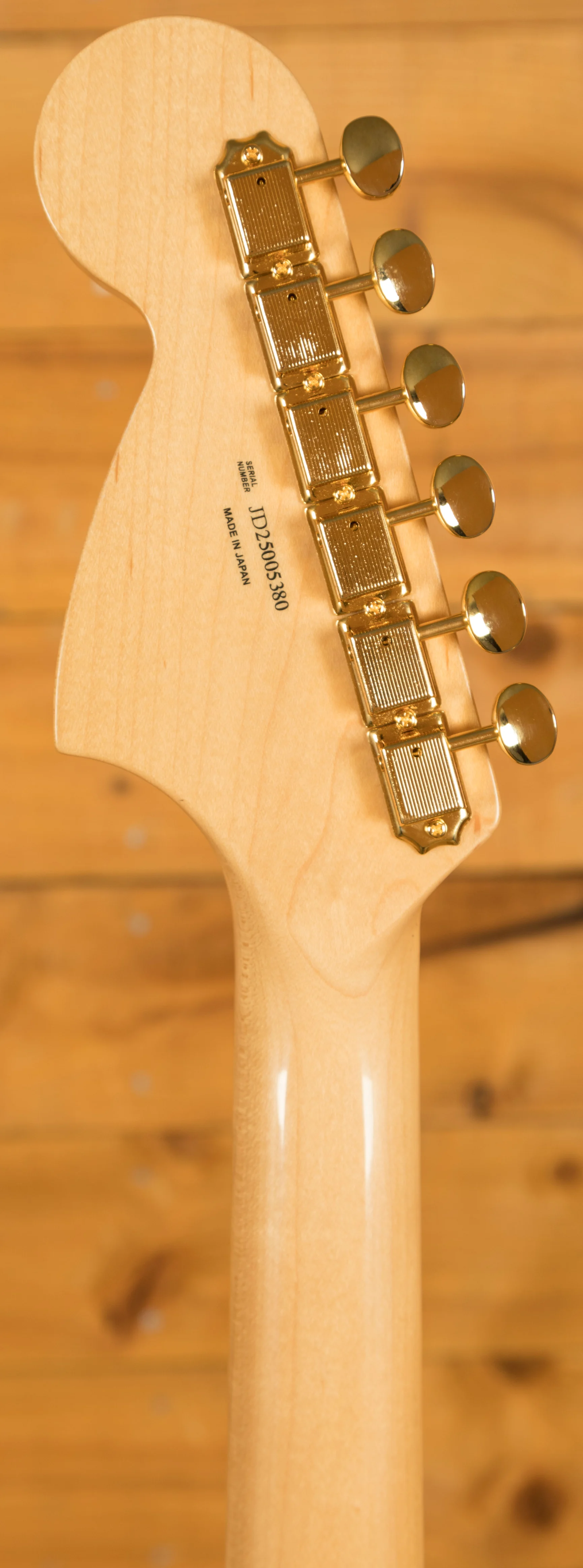 The 2025 Made in Japan Traditional 60s Mustang in White Pearl is a standout reissue that captures the quirky charm of Fender's original short-scale offset, now with refined Japanese craftsmanship and a luxurious aesthetic twist. This limited-edition model features a pearl-coated body and matching headstock, paired with gold hardware for a look that's both elegant and unmistakably rare.