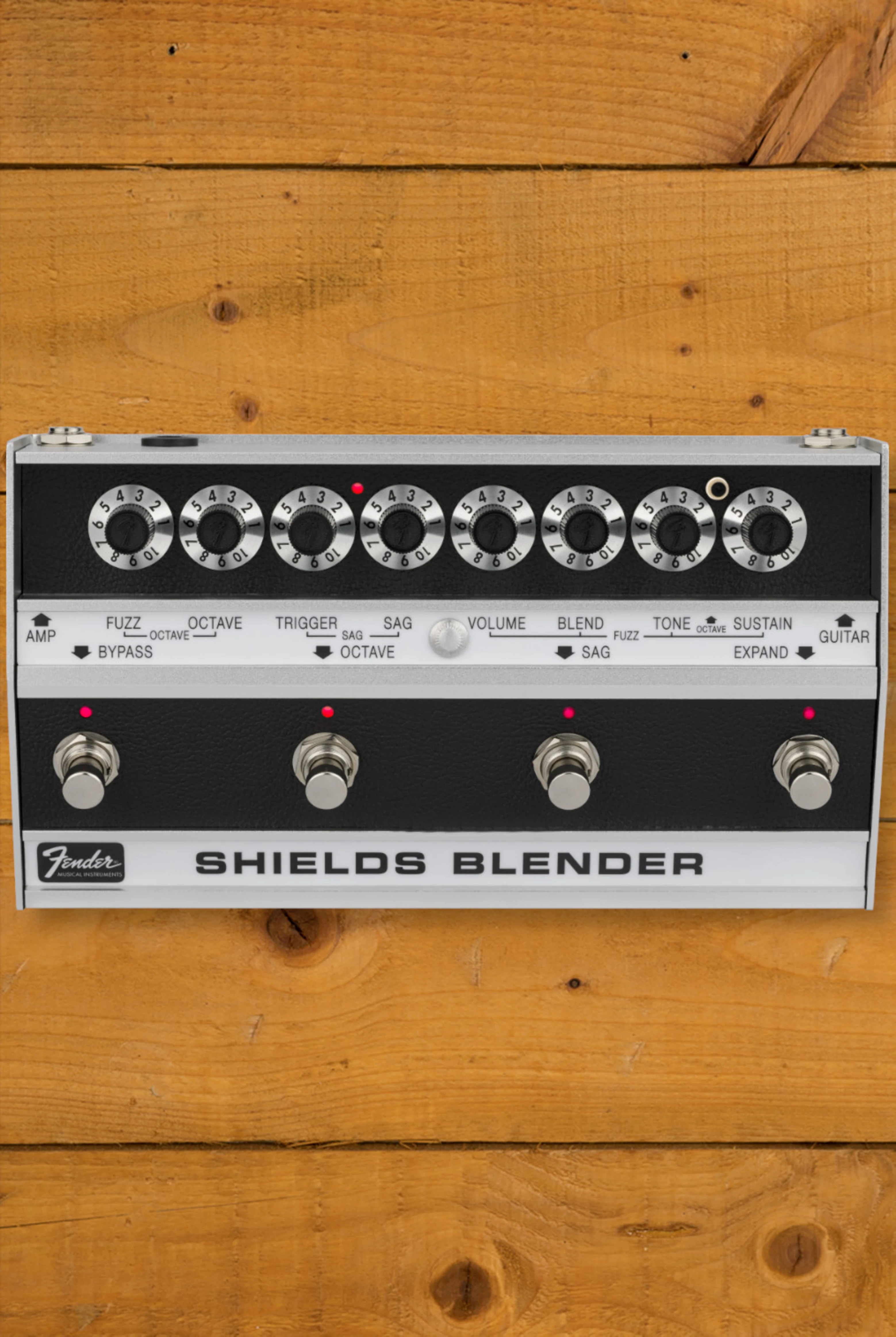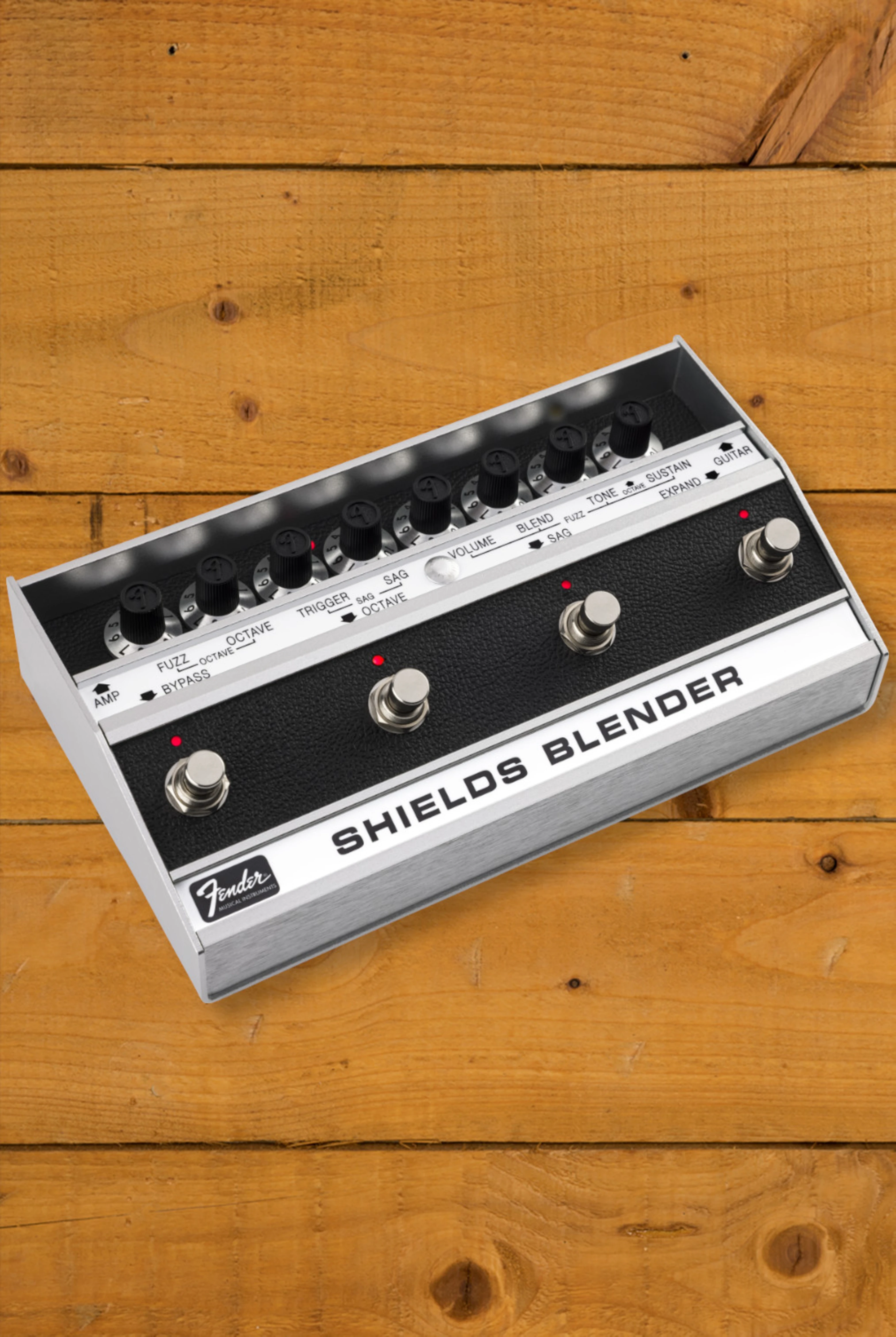 With four footswitches at your command, the Fender Shields Blender offers a wealth of fuzz tones and effects, whether you're playing to a massive audience or crafting your sound in the home studio.