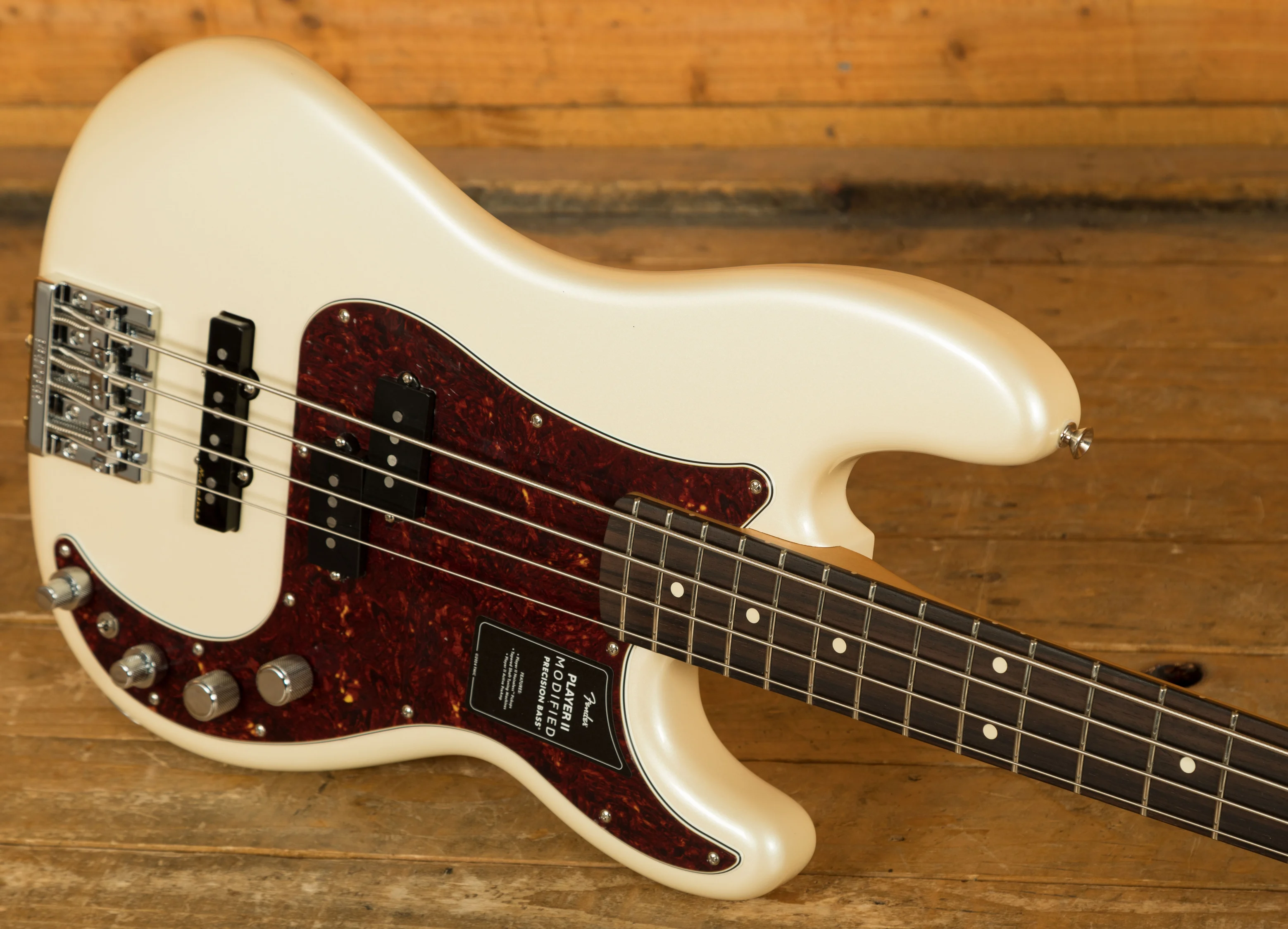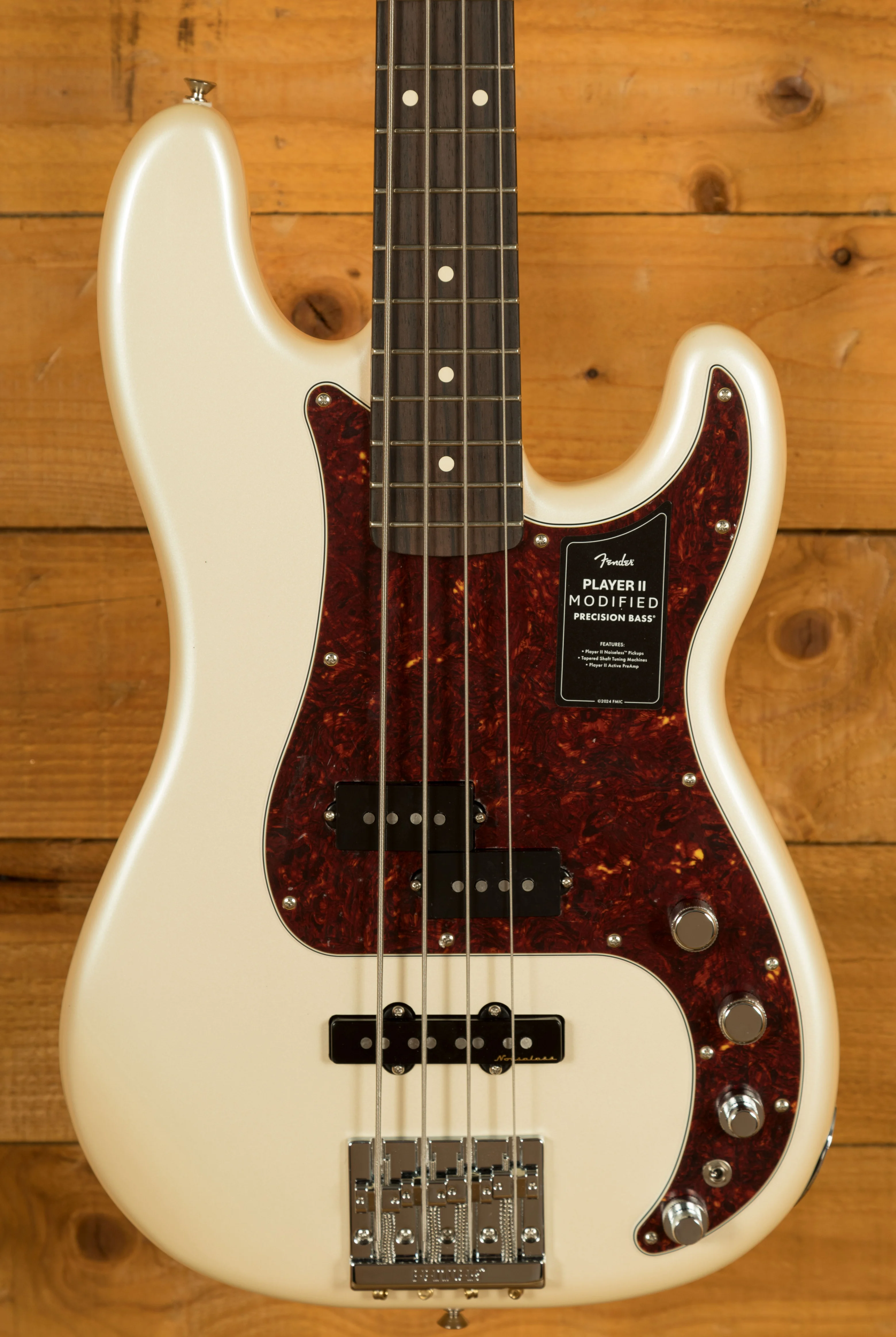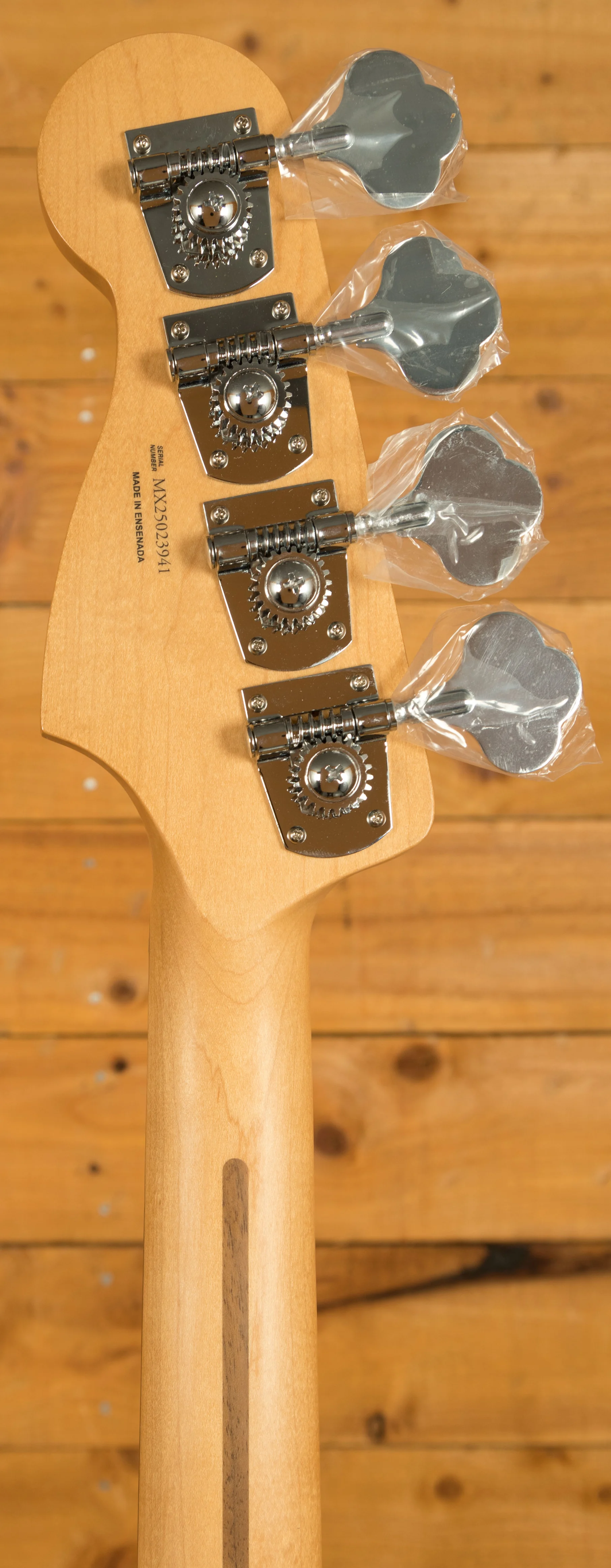 The Fender Player II Modified Precision Bass is designed for the modern bassist, offering a blend of classic design with updated features. The neck is built for comfortable and fast playing, featuring a Modern "C" profile, a satin urethane finish, and a 9.5-inch radius rosewood fingerboard. The fingerboard edges are rolled, and the neck is fitted with 20 medium jumbo frets, contributing to a smooth playing experience. The alder body, available in several finishes, provides the traditional Fender bass tone.