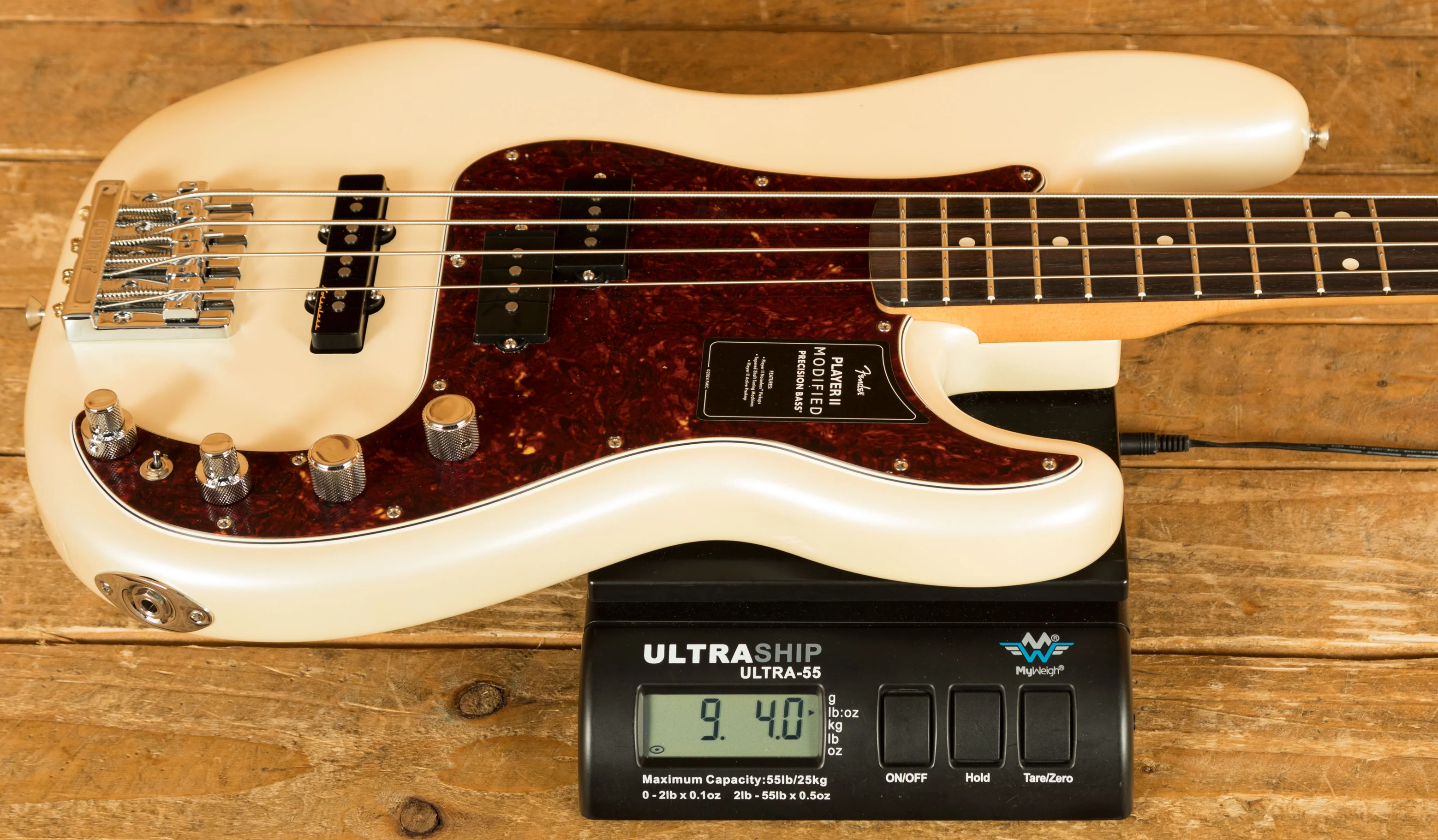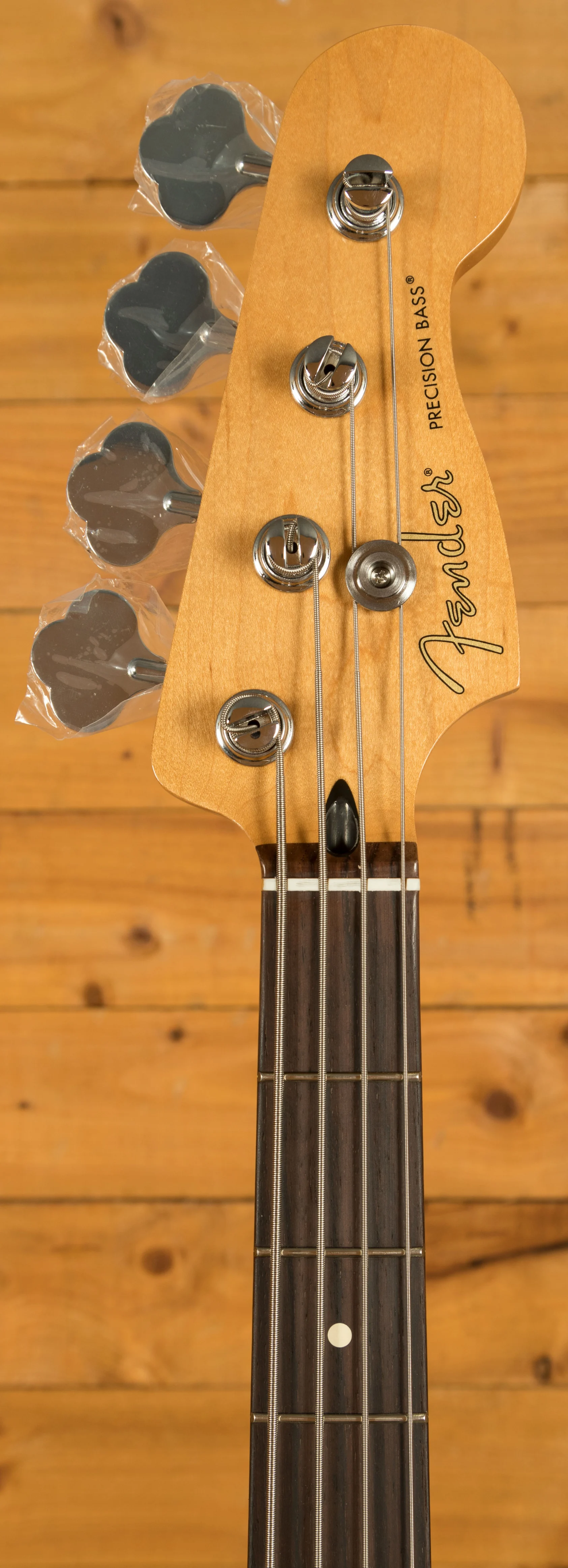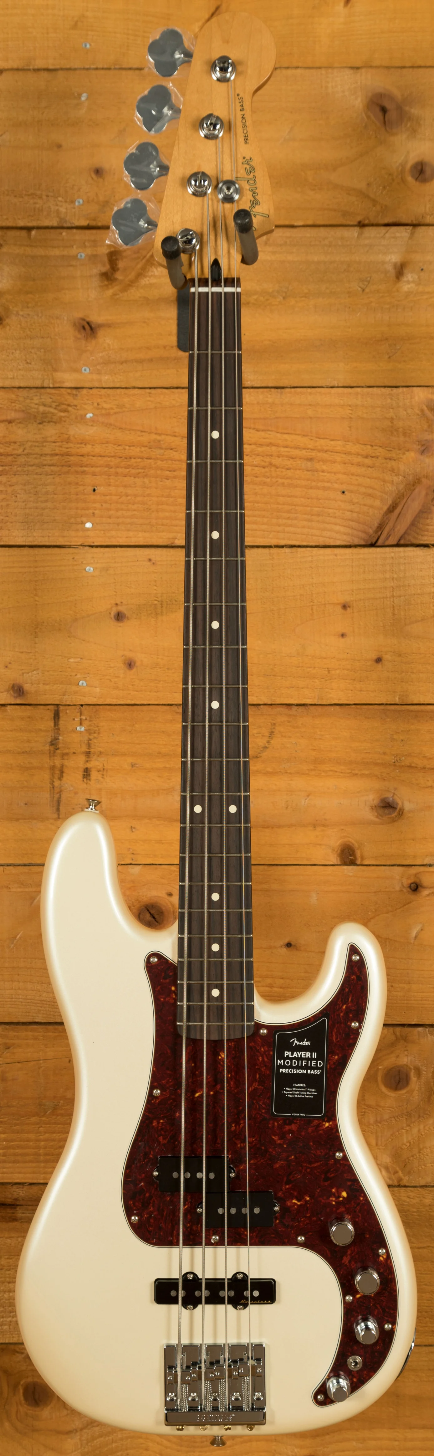 The Fender Player II Modified Precision Bass is designed for the modern bassist, offering a blend of classic design with updated features. The neck is built for comfortable and fast playing, featuring a Modern "C" profile, a satin urethane finish, and a 9.5-inch radius rosewood fingerboard. The fingerboard edges are rolled, and the neck is fitted with 20 medium jumbo frets, contributing to a smooth playing experience. The alder body, available in several finishes, provides the traditional Fender bass tone.