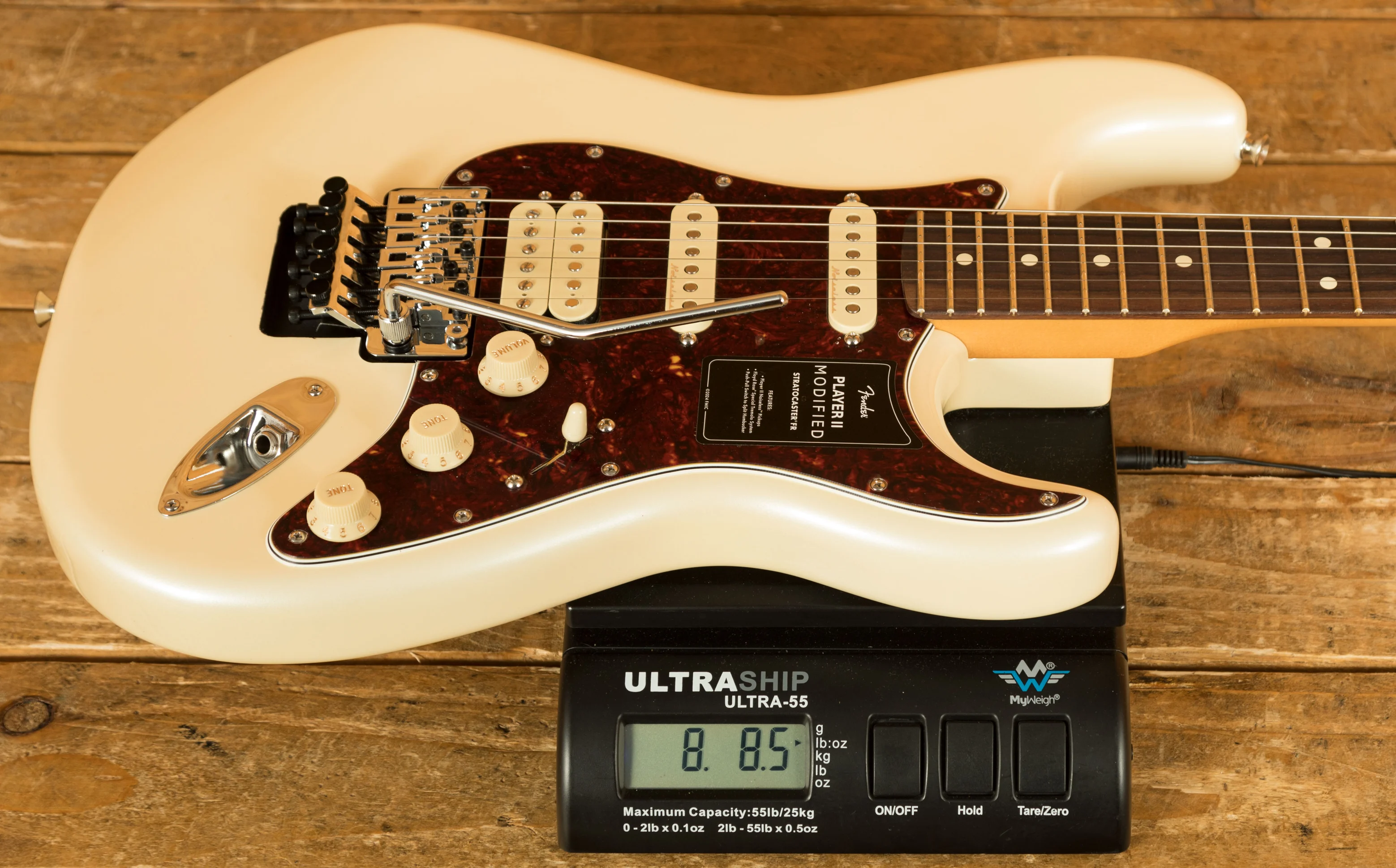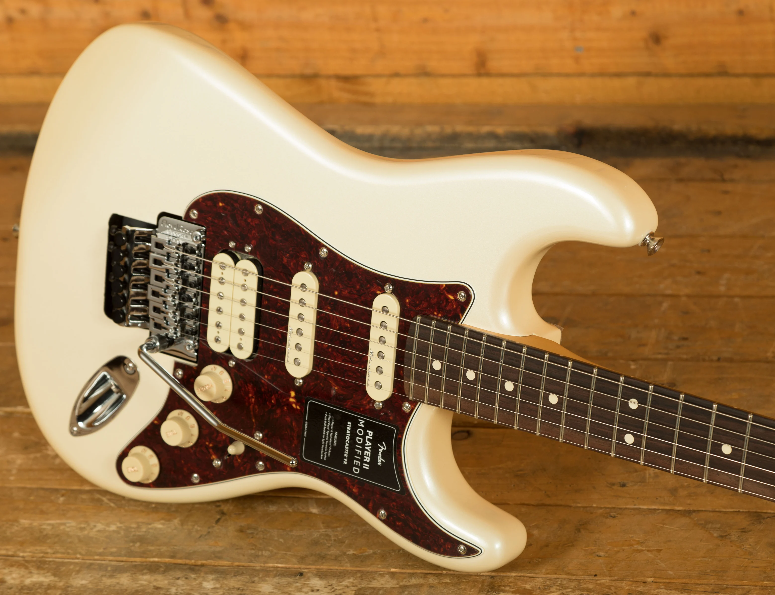 The Fender Player II Modified Stratocaster HSS Floyd Rose is built for guitarists who want professional-grade performance with modern enhancements. Its alder body delivers the clear, resonant tone that has defined Fender instruments for decades, while the selection of new finishes offers players fresh, eye-catching options. The Modern "C"-profile neck with a smooth satin urethane finish on the back provides effortless playability, and the 12"-radius rosewood fingerboard with rolled edges and 22 medium jumbo frets ensures fast runs, comfortable chords, and clean bends without fret buzz. This combination of build quality and ergonomic design makes it a reliable choice for both stage and studio work.