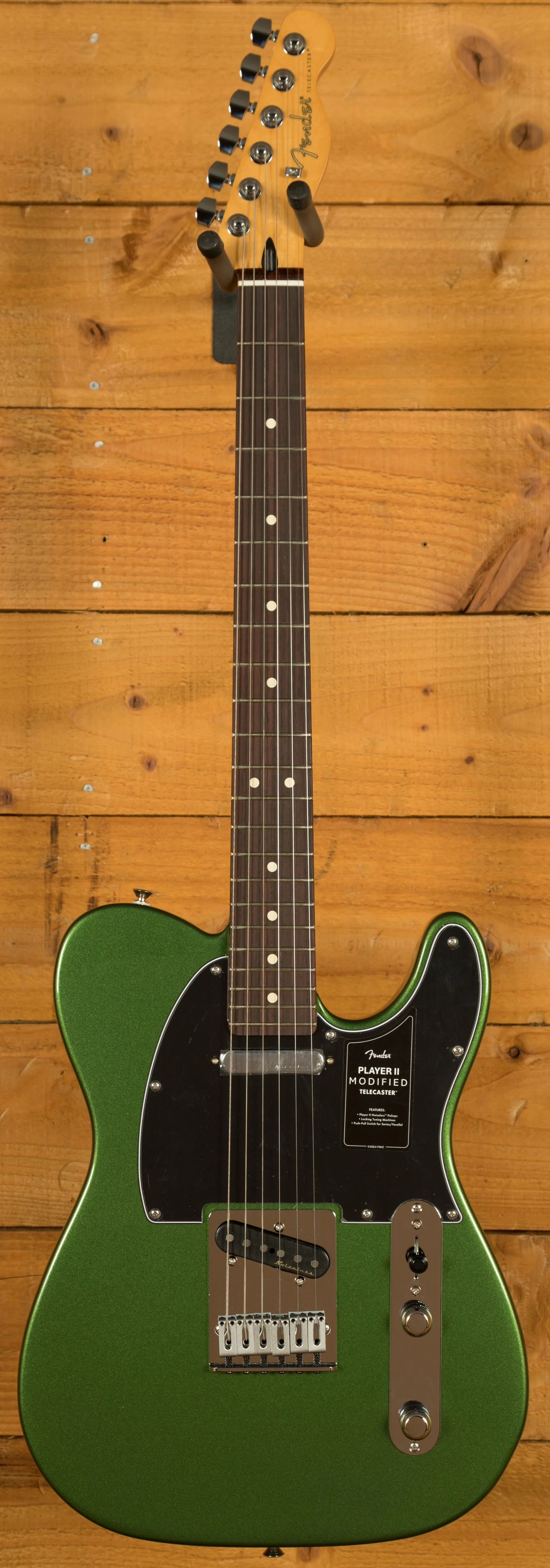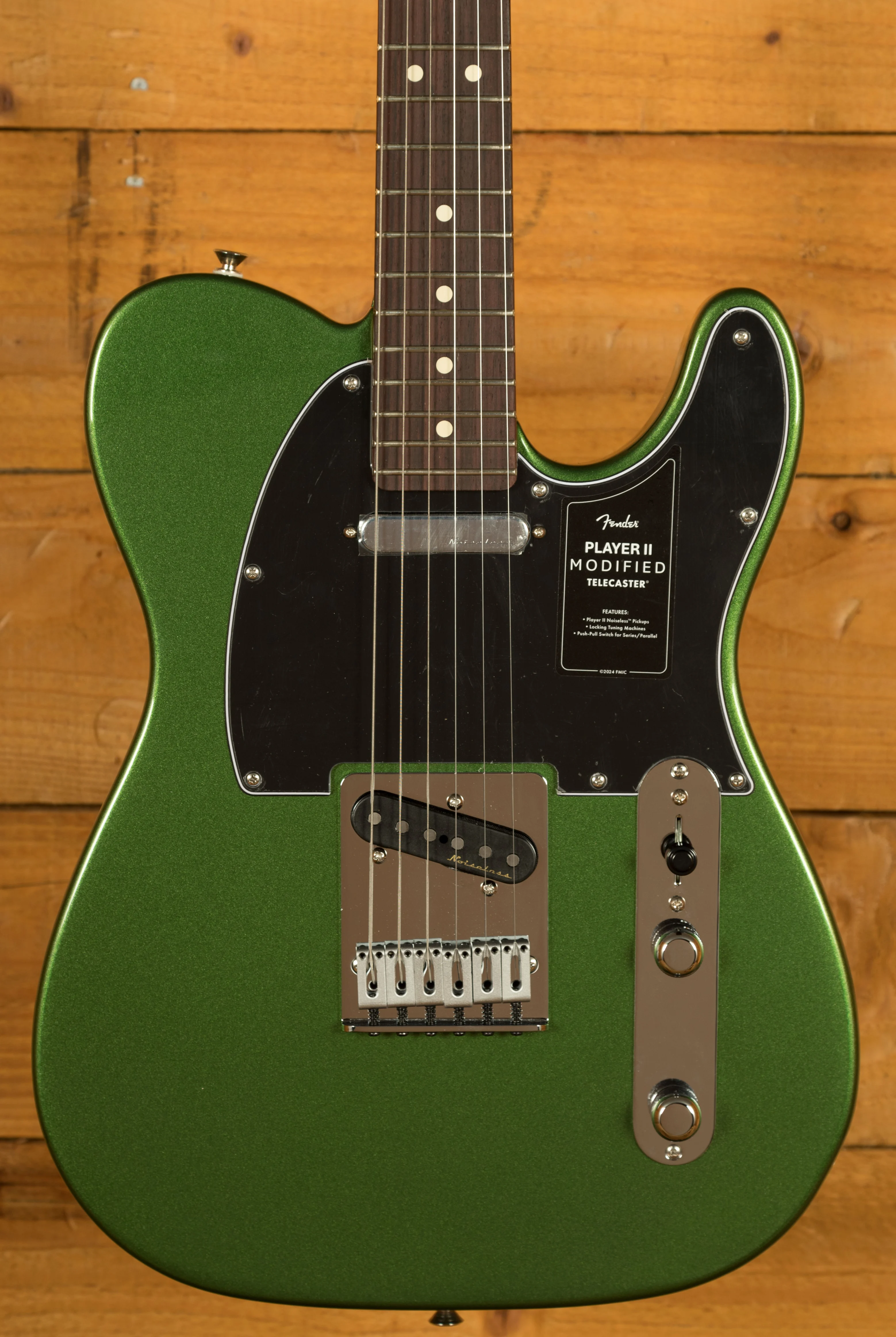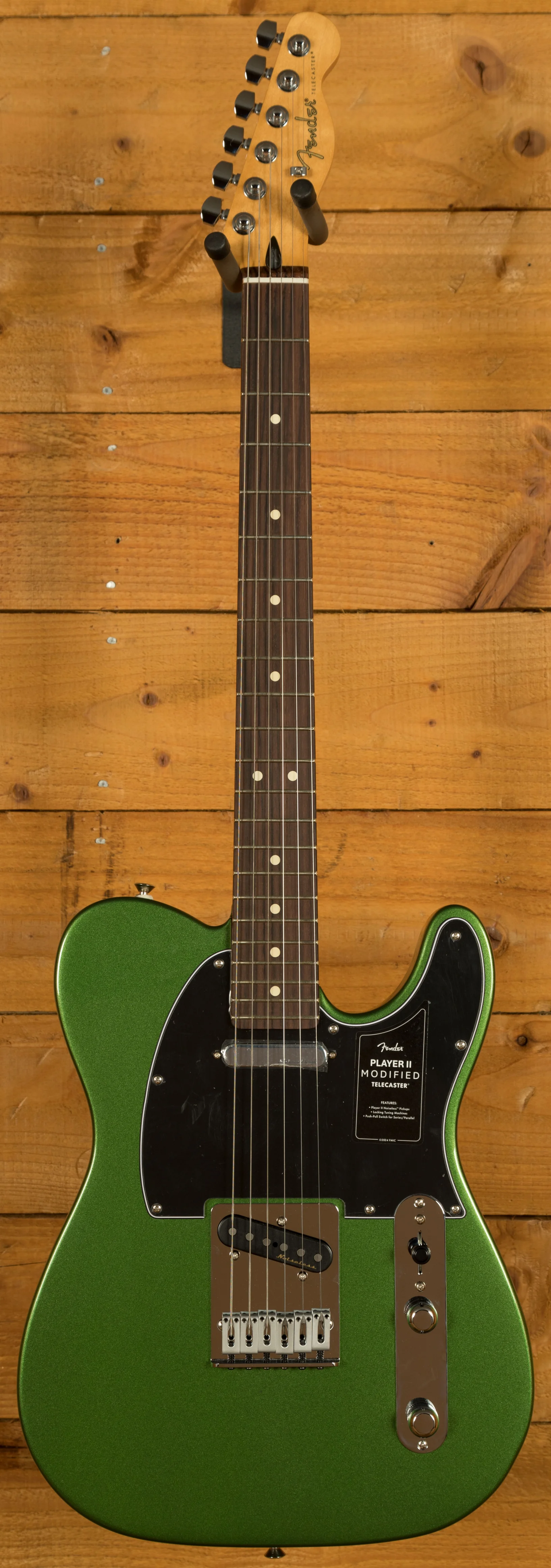 The Fender Player II Modified Telecaster is a modern take on a classic guitar design, engineered to meet the needs of contemporary players. This instrument focuses on practical upgrades that enhance playability and tonal versatility. The neck features a Modern "C" profile, designed for comfortable and efficient playing, and is finished with a satin urethane coating for a smooth feel. The 9.5-inch radius rosewood fingerboard includes 22 medium jumbo frets and rolled edges, contributing to a comfortable playing experience.