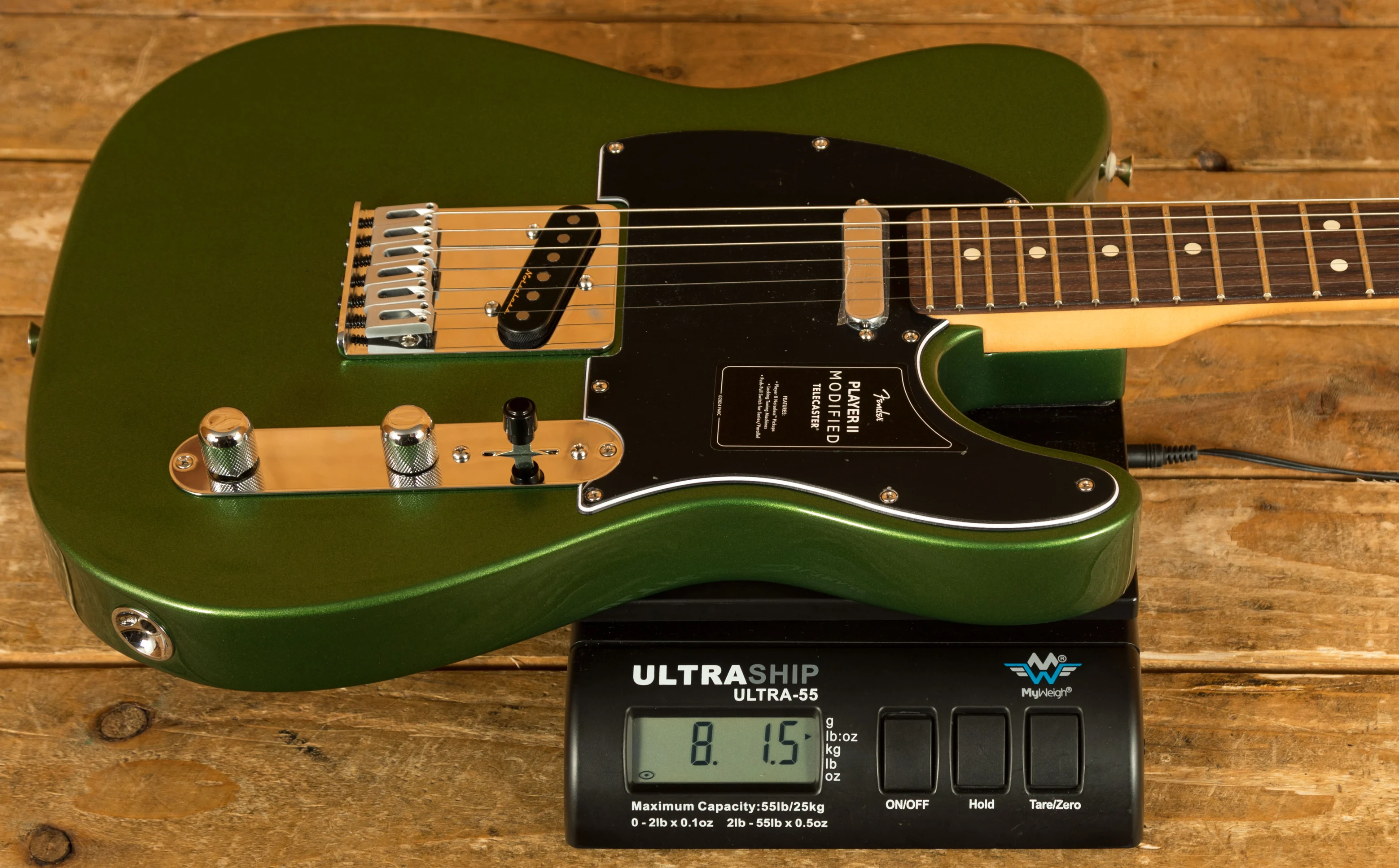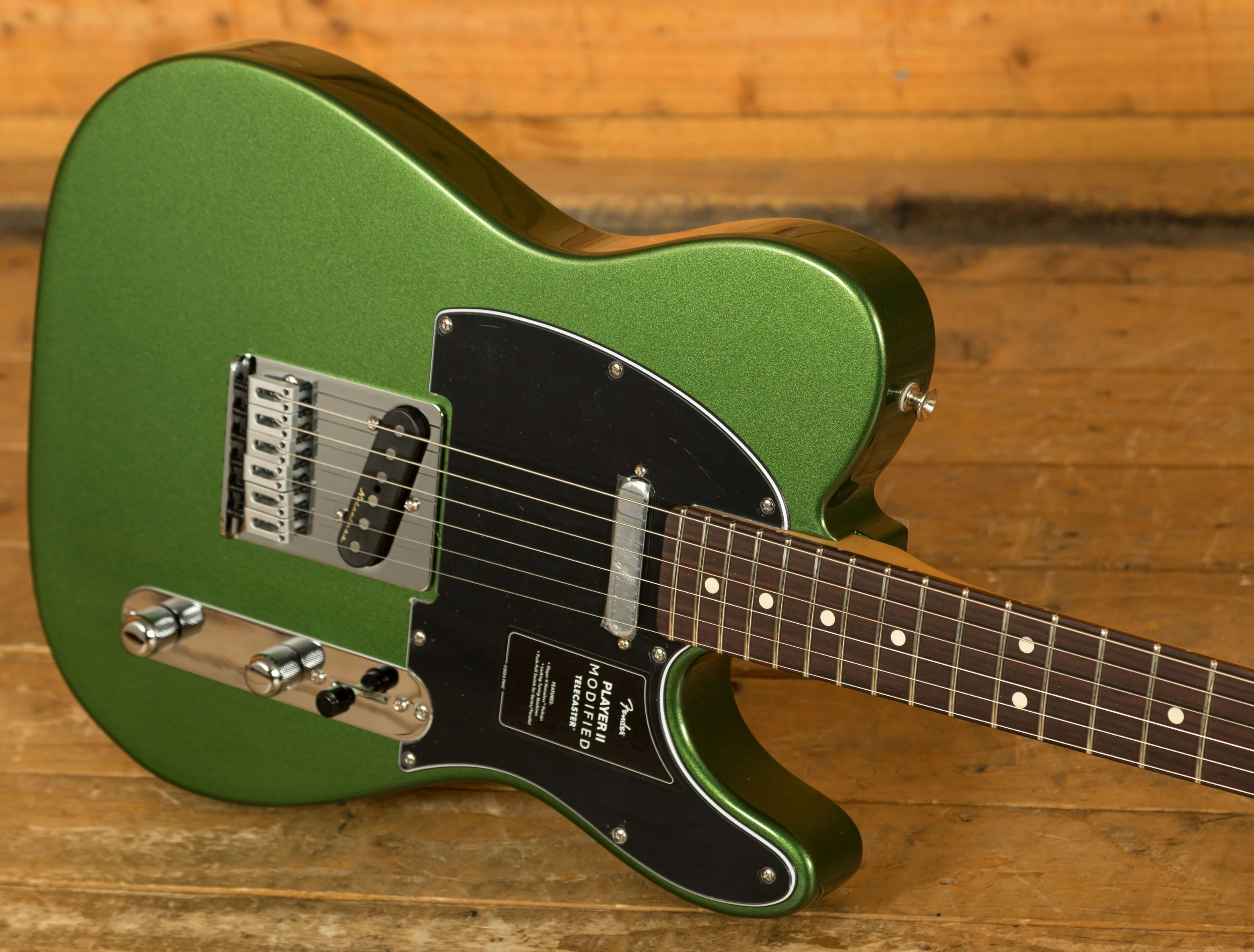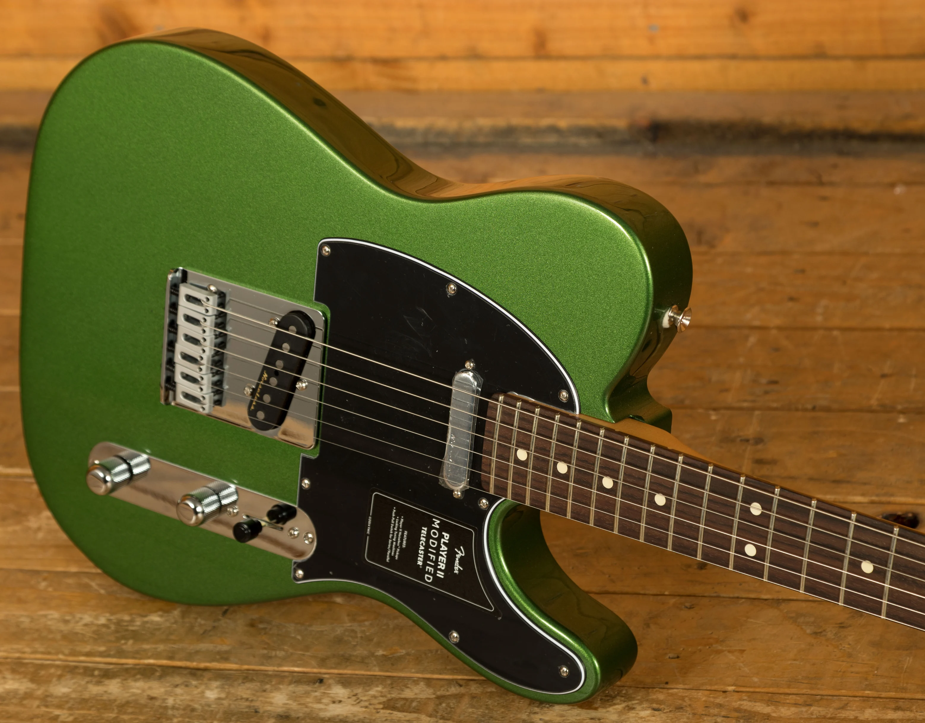 The Fender Player II Modified Telecaster is a modern take on a classic guitar design, engineered to meet the needs of contemporary players. This instrument focuses on practical upgrades that enhance playability and tonal versatility. The neck features a Modern "C" profile, designed for comfortable and efficient playing, and is finished with a satin urethane coating for a smooth feel. The 9.5-inch radius rosewood fingerboard includes 22 medium jumbo frets and rolled edges, contributing to a comfortable playing experience.