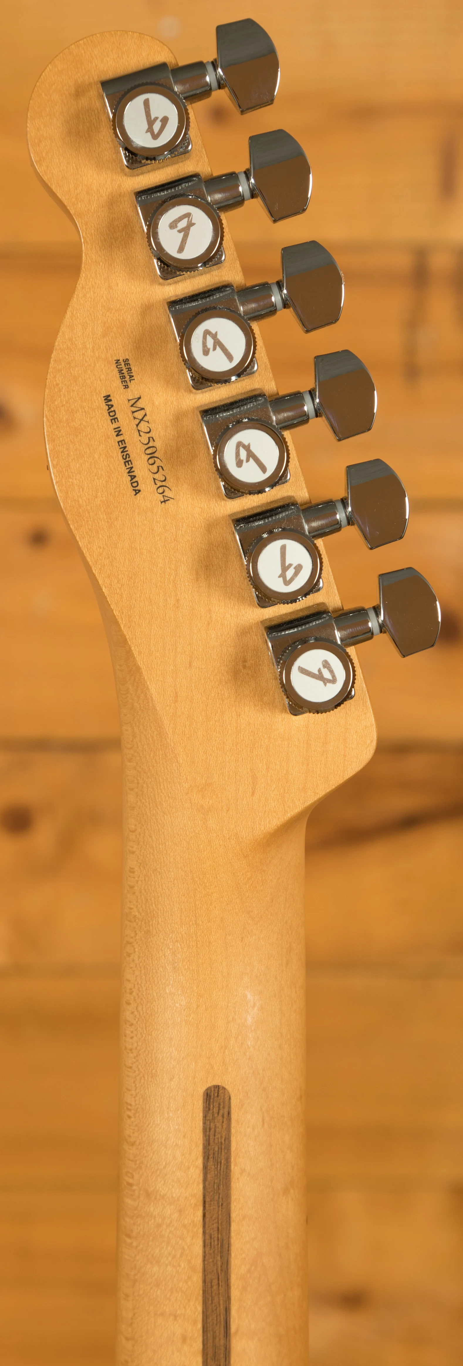 Upgraded electronics include a push/pull tone switch for coil splitting and a treble bleed circuit, which maintains high-end clarity when adjusting the volume. The modern Telecaster bridge features six block brass saddles, enhancing intonation and sustain. Short post locking tuning machines improve tuning stability and make string changes easier. A Graph Tech TUSQ nut and modern string tree further contribute to tuning stability and smooth string travel.