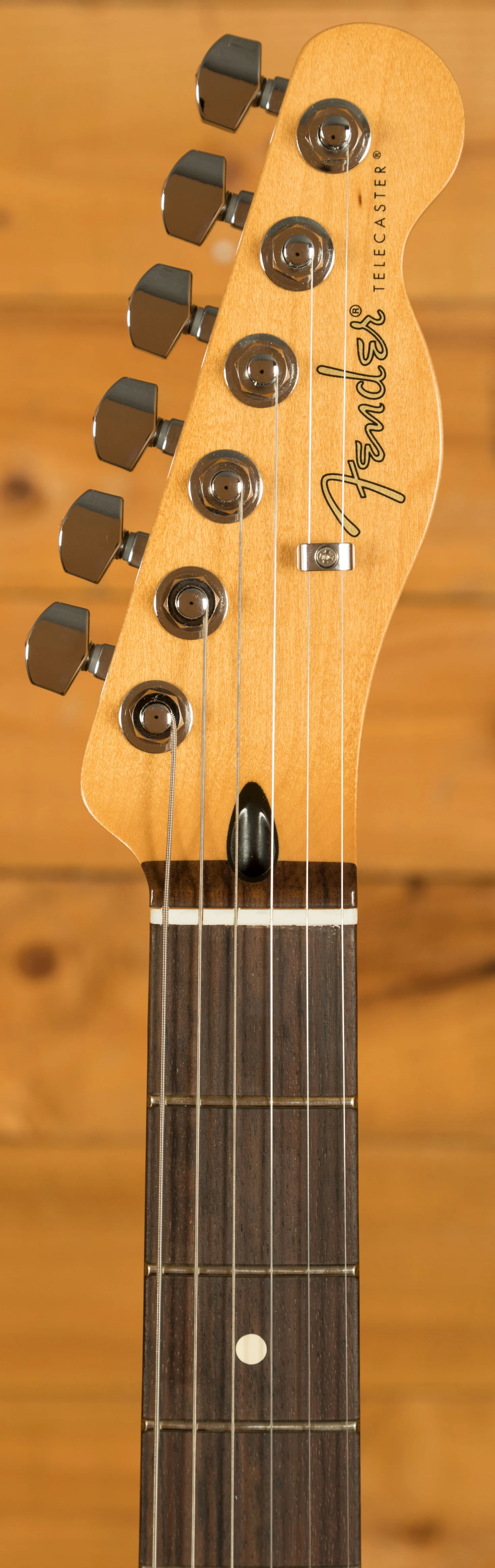 Upgraded electronics include a push/pull tone switch for coil splitting and a treble bleed circuit, which maintains high-end clarity when adjusting the volume. The modern Telecaster bridge features six block brass saddles, enhancing intonation and sustain. Short post locking tuning machines improve tuning stability and make string changes easier. A Graph Tech TUSQ nut and modern string tree further contribute to tuning stability and smooth string travel.