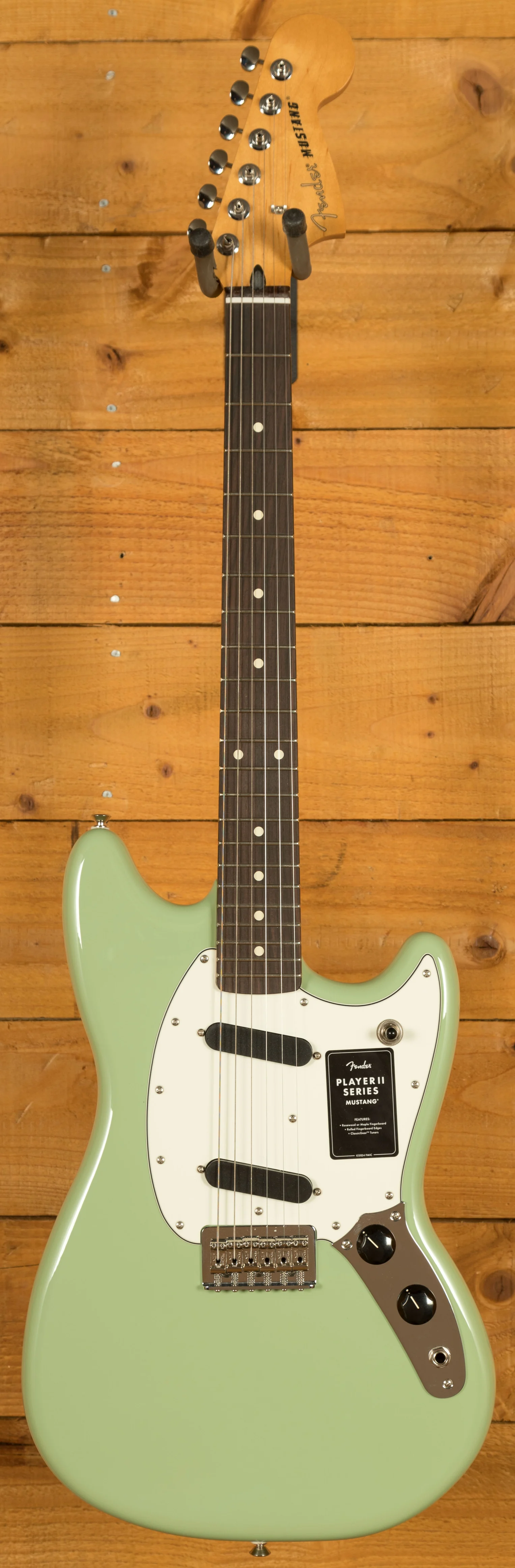 The Player II Mustang offers iconic Fender sound and style with contemporary updates designed to enhance your performance. This stage-ready guitar features a fast and fluid Modern "C" neck profile with a silky satin urethane finish, a 9.5" radius fingerboard with smooth rolled edges, and 22 medium jumbo frets. Choose between a classic rosewood or maple fingerboard for a comfortable and versatile playing experience.