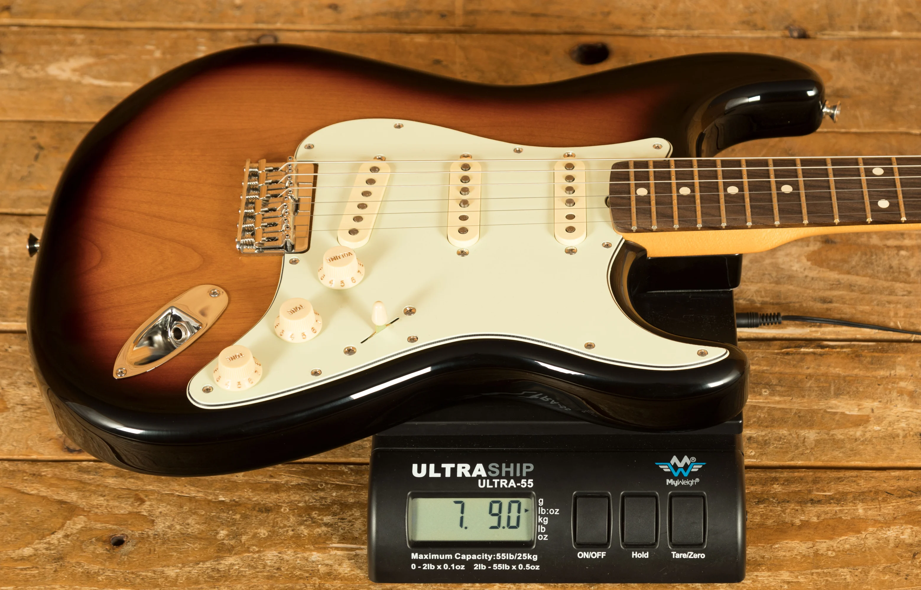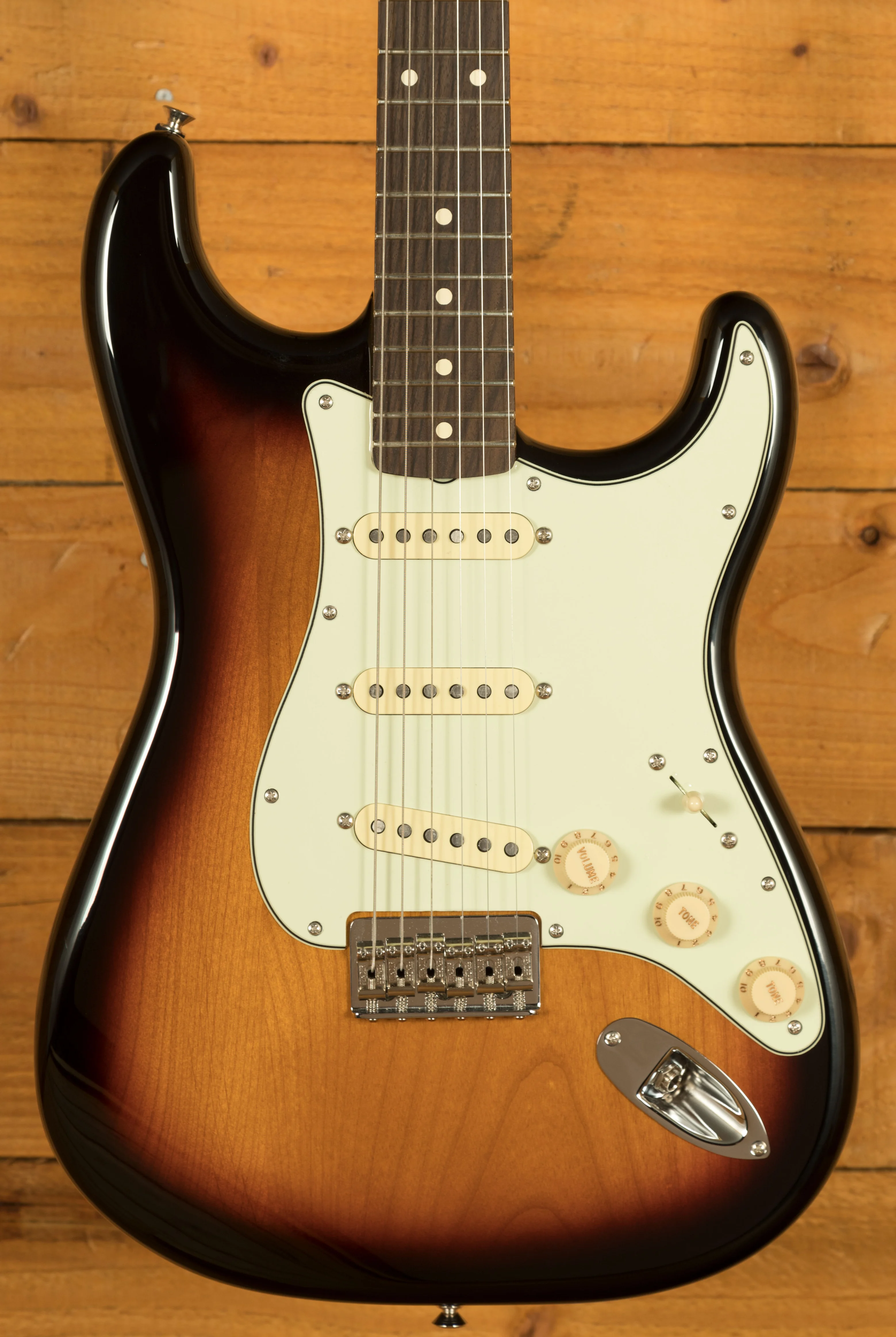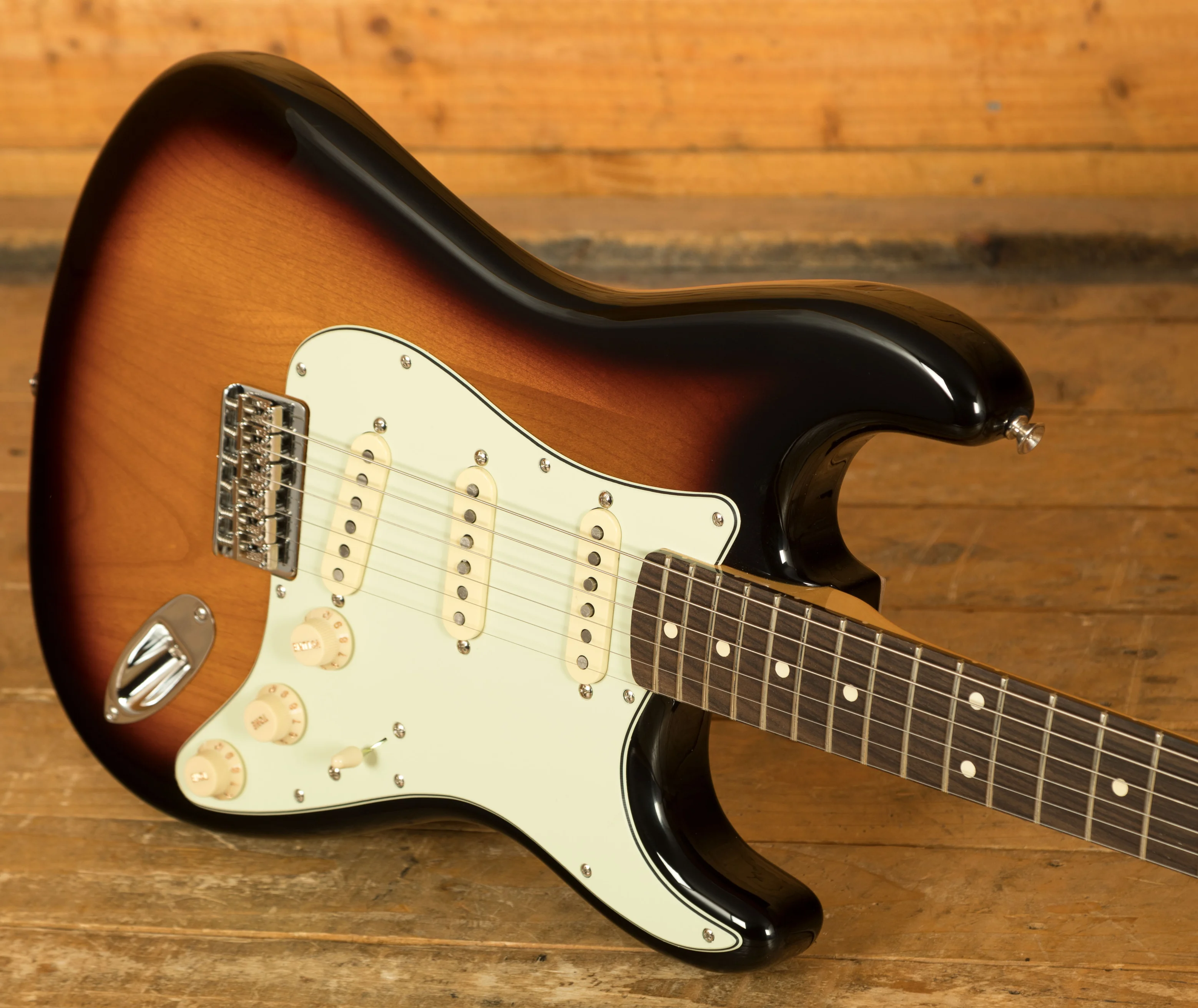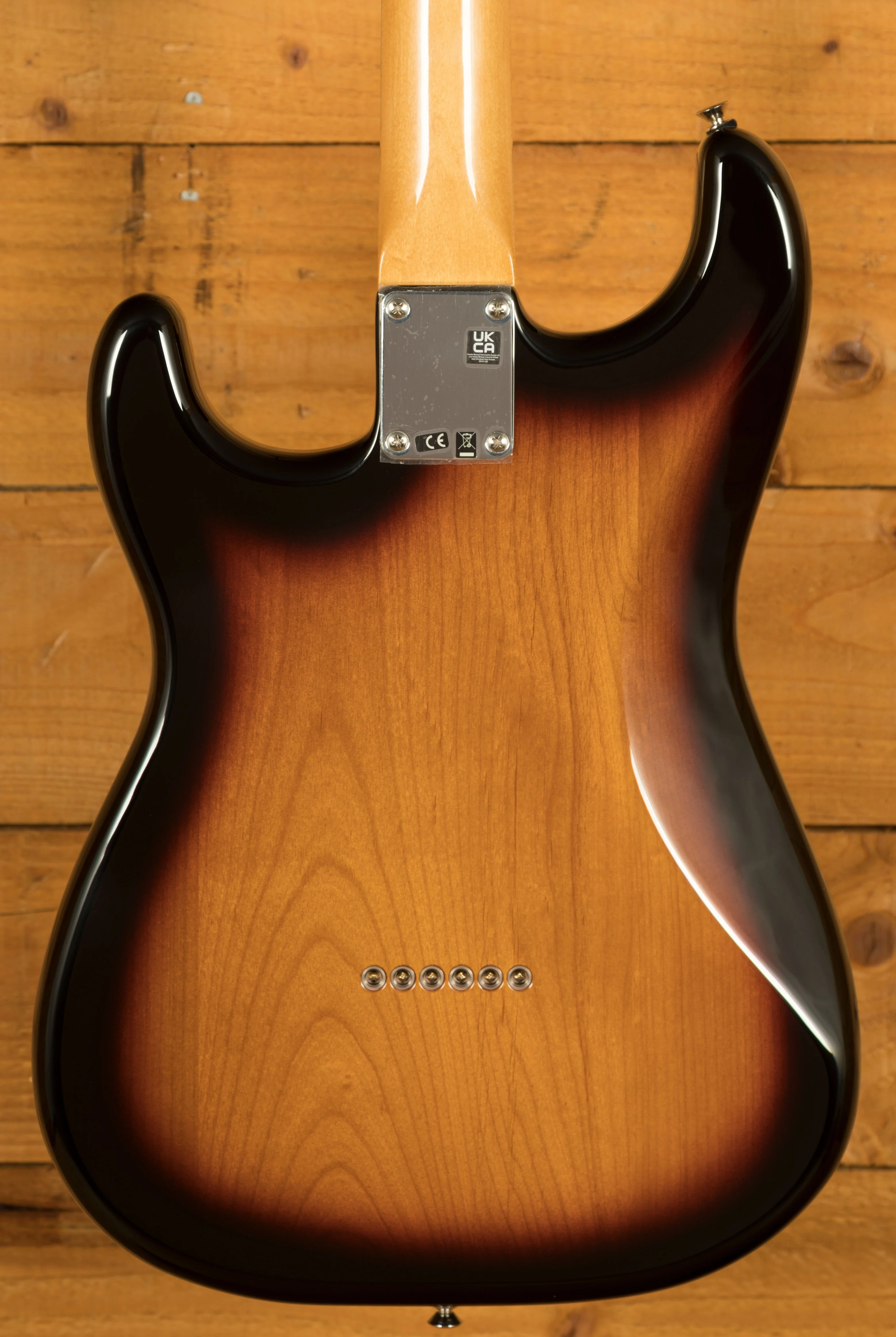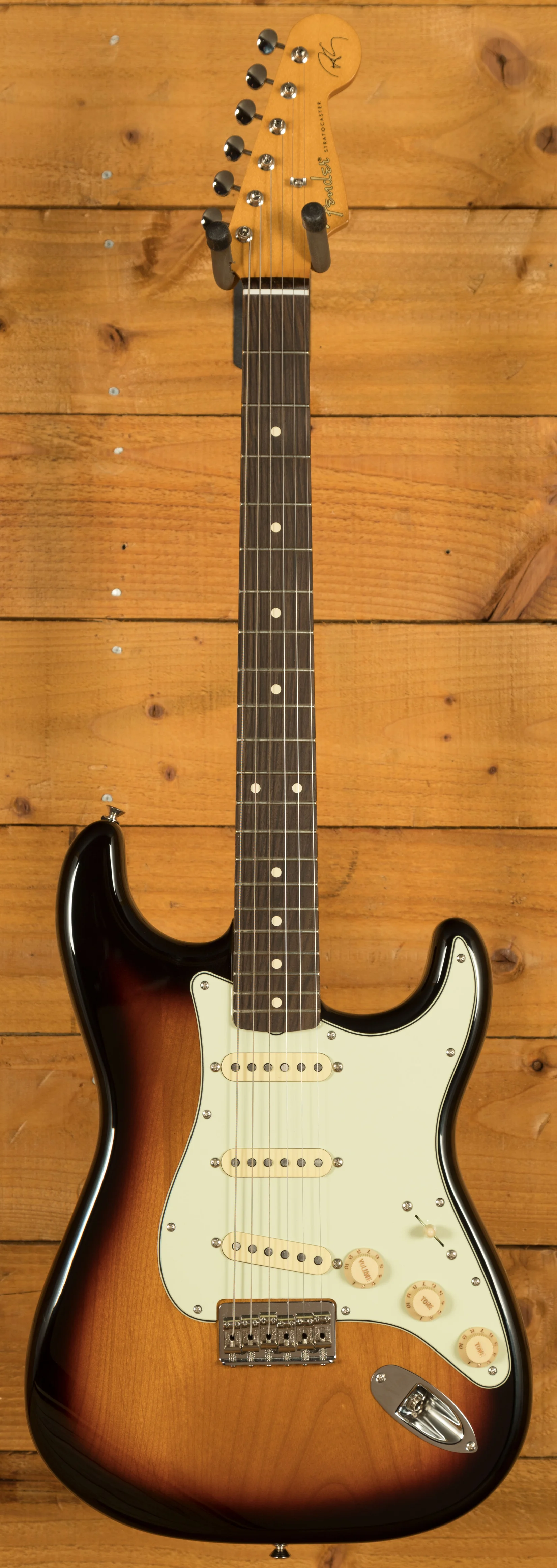 The 3-Colour Sunburst finish paired with the three-ply mint green pickguard exudes classic Fender aesthetics. Chrome hardware, vintage-style tuners, and white plastic parts complete the timeless look. As an added touch, Robert Cray's signature adorns the headstock, marking this instrument as a piece of blues history.
