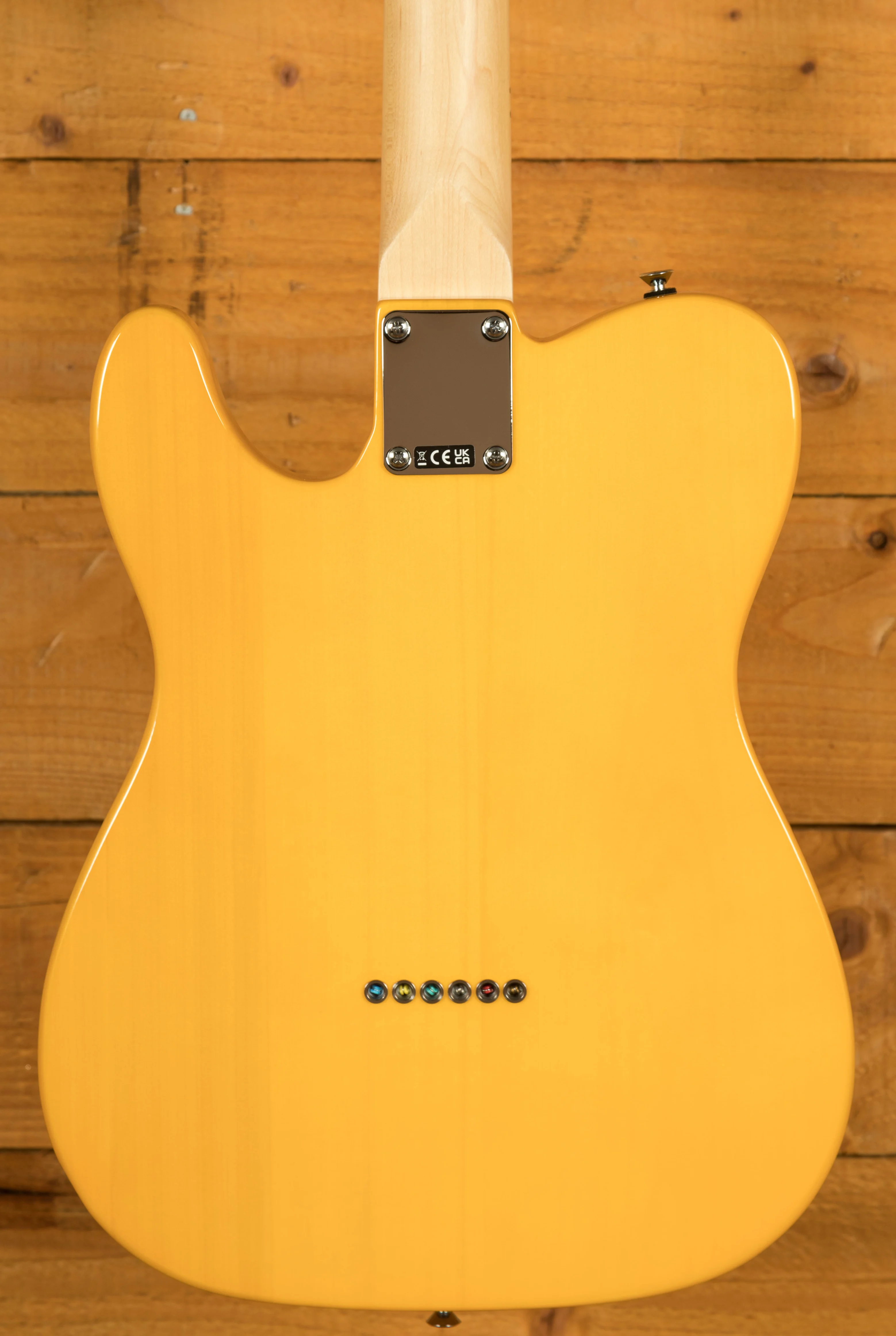 The string-through-body Tele bridge with satin chrome saddles is a key component of the Telecaster's iconic tone and sustain. This design allows for optimal transfer of string vibrations to the body, resulting in a resonant and full sound. The satin chrome saddles provide smooth string contact and contribute to the guitar's overall aesthetic appeal.