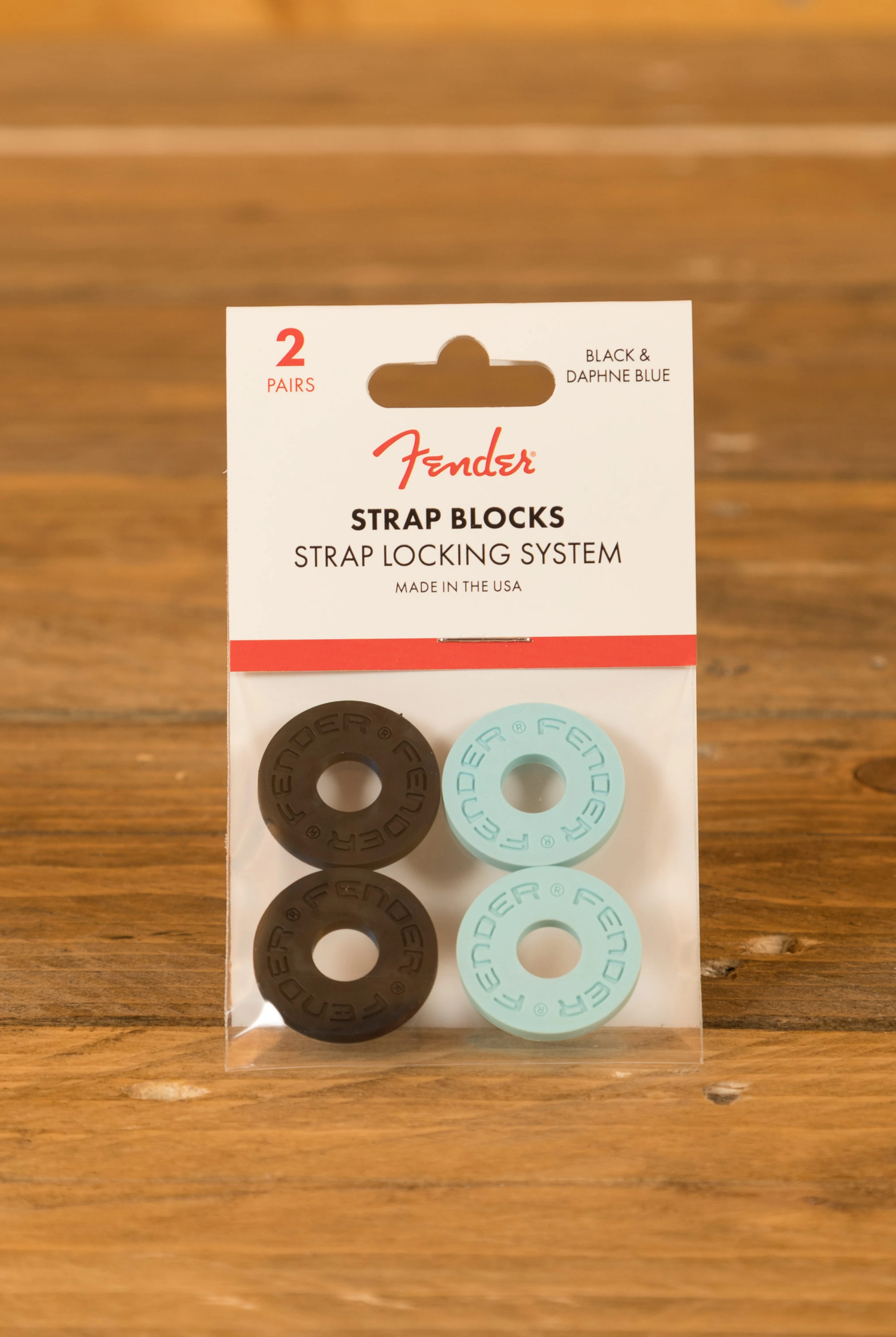 The most reliable and hassle-free instrument strap lock system ever devised. No need to remove or replace existing strap buttons on your guitar; just slip easily installed Strap Blocks over the existing strap buttons and that’s it—you’re ready to go, with your strap locked securely in place.