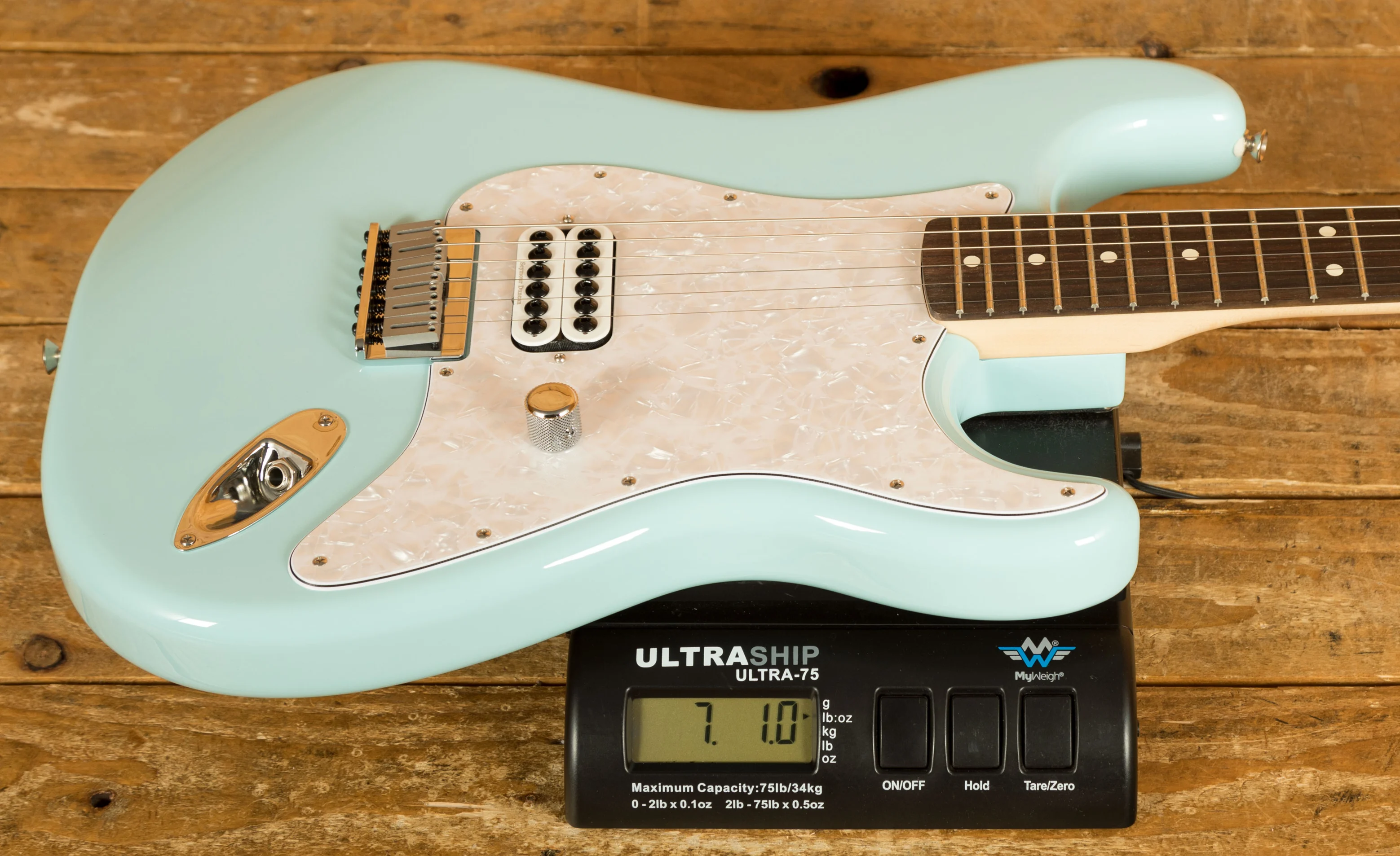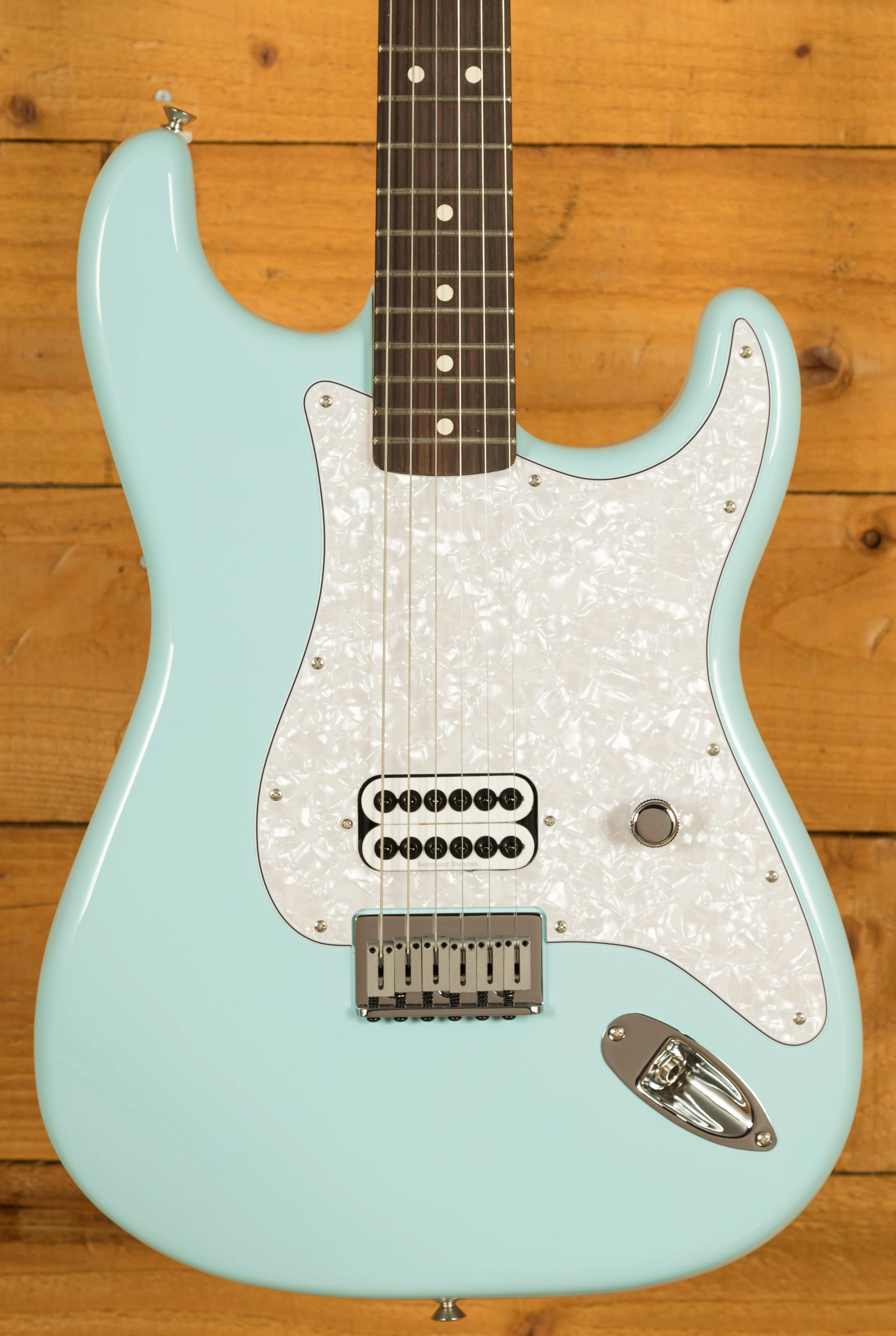 The Tom DeLonge Stratocaster boasts a Seymour Duncan Invader humbucker for immense output and turbo-charged tone thats perfect for chunky power chords and crunchy riffs. But it's not all about powerthe streamlined control setup consisting of a single master volume combined with a treble bleed circuit preserves the guitars natural high-end, ensuring sparkly cleans and chime-y edge-of-breakup tones!