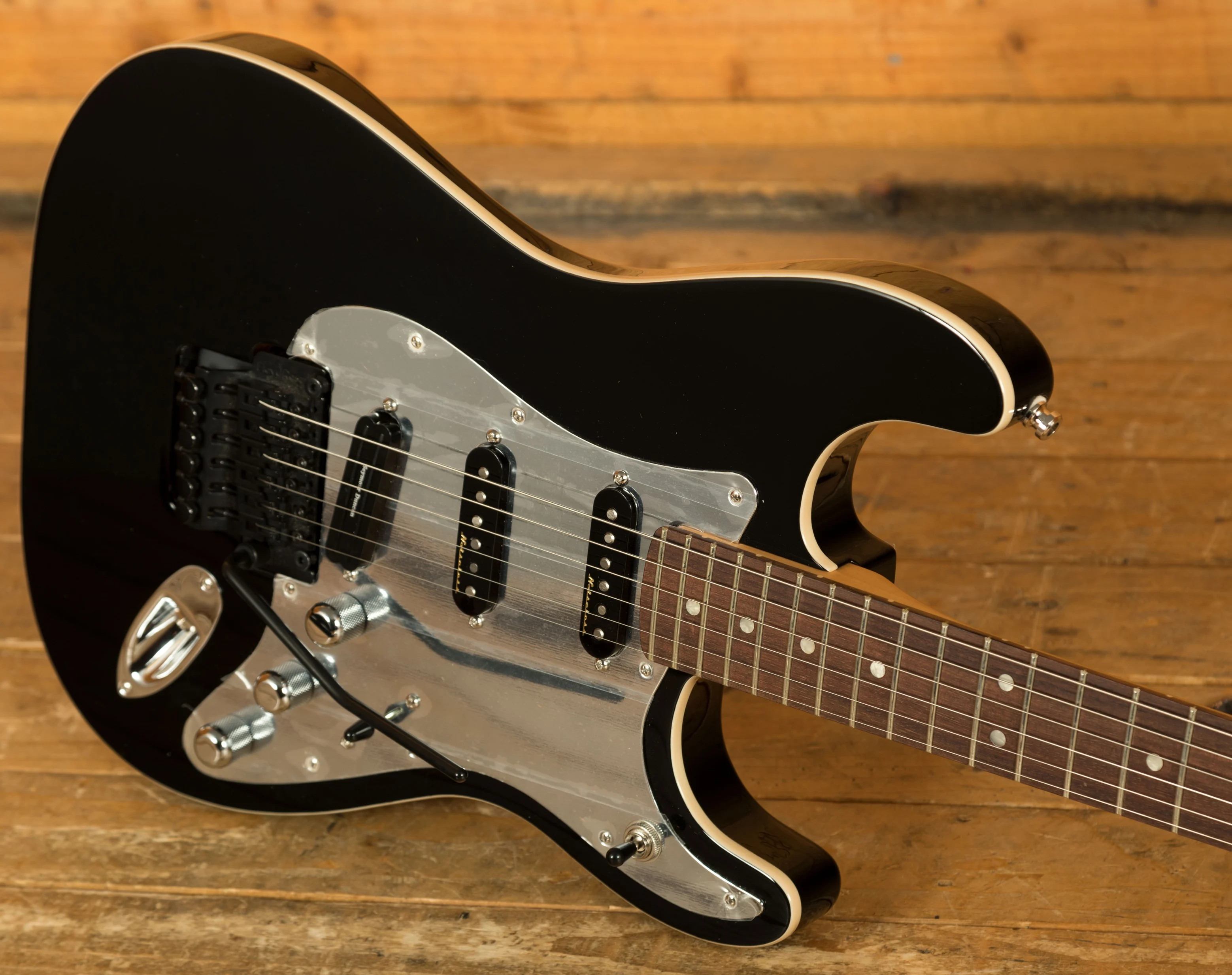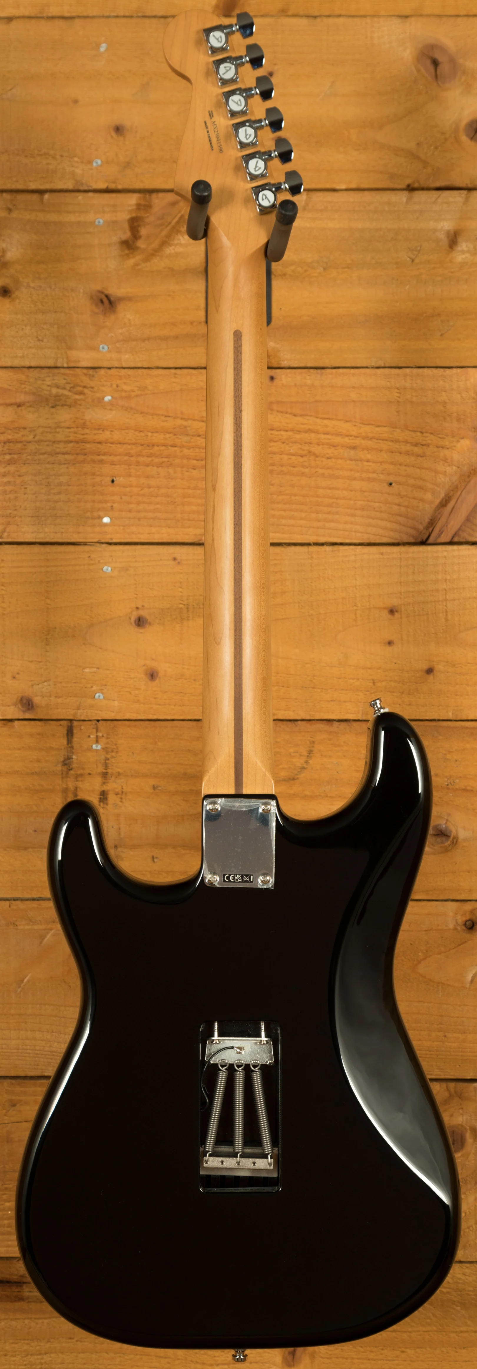 The Tom Morello Soul Power Stratocaster, based on the modified Designer Series Strat used during his time in Audioslave, features a classic Alder body finished in a gloss black with a 1-ply mirrored chrome pickguard. It really captures that classic Morello feel and even includes the iconic "Soul Power" body decal in the case.