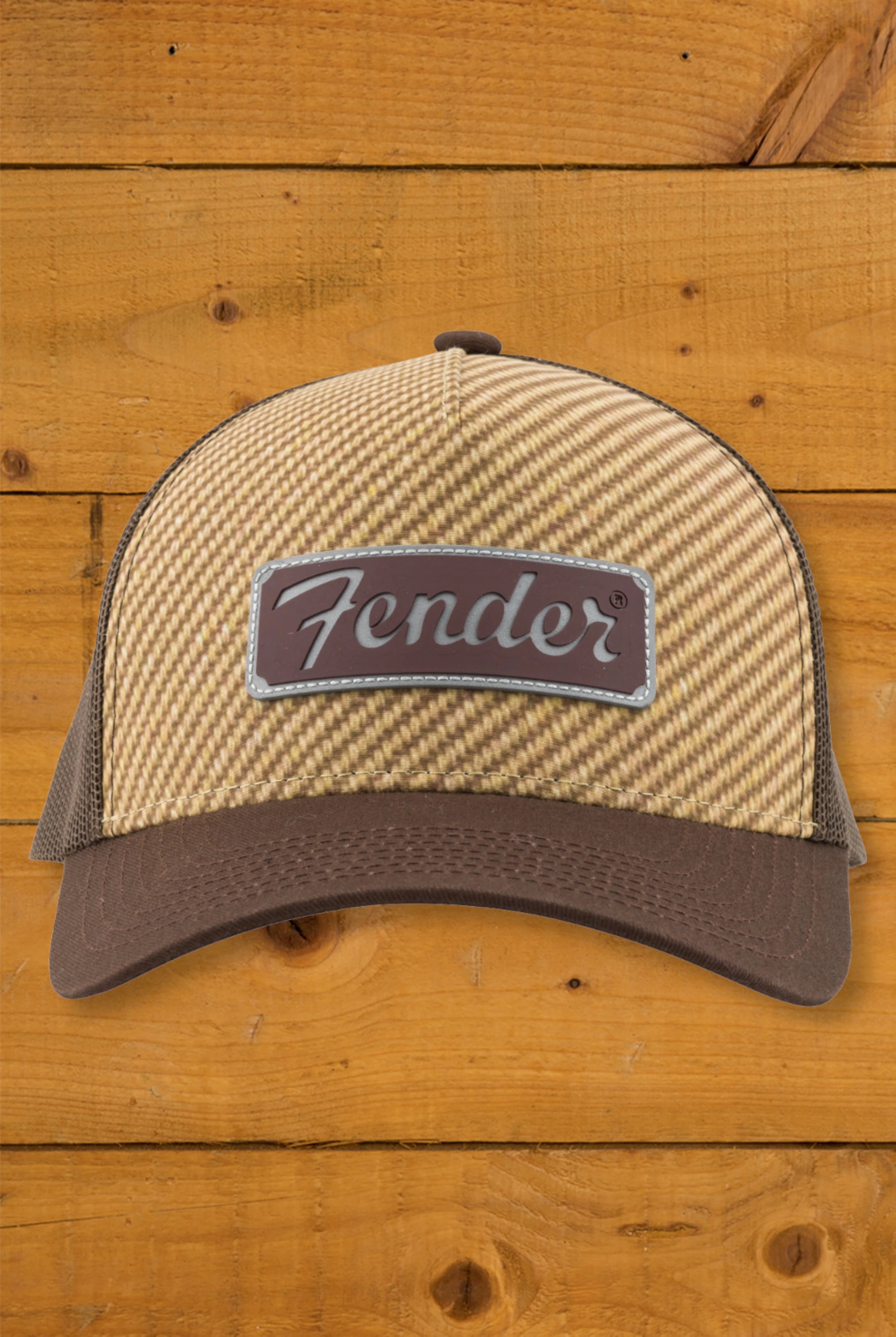 Designed with a sublimated tweed fabric front, this hat captures the essence of Fender's legendary amplifier styling, complemented by a vintage-inspired rubber Fender transition logo badge. The 5-panel construction, brown bill, and brown mesh back provide a comfortable, breathable fit, ensuring effortless wear throughout the day.