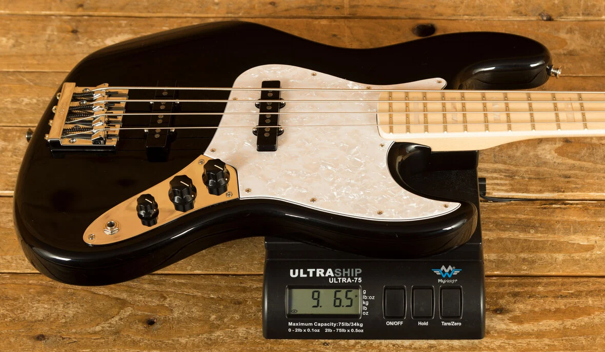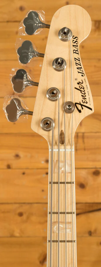 Key features of the Geddy Lee Jazz Bass include a one-piece maple neck with a 9.5"-radius maple fingerboard boasting 20 medium jumbo frets. The custom "C" neck shape provides a comfortable yet substantial feel, ideal for extended playing sessions. Elegant white binding and pearloid block inlays enhance the instrument's aesthetic appeal, complementing the antique white pearloid pickguard.