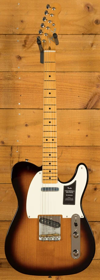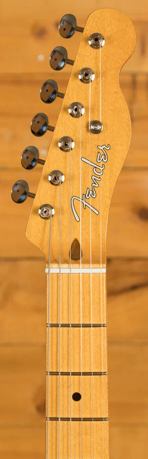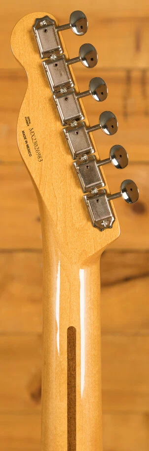 Under the hood lies a pair of vintage-style '50s pickups, delivering the crystal-clear chime and raw, steely twang that defined Fender's reputation. The vintage-style 3-saddle bridge, equipped with barrel brass saddles, faithfully reproduces the twang characteristic of the '50s era. Enhancing the package further are the vintage-style tuning machines, offering classic aesthetics along with a finer gear ratio for improved tuning stability.