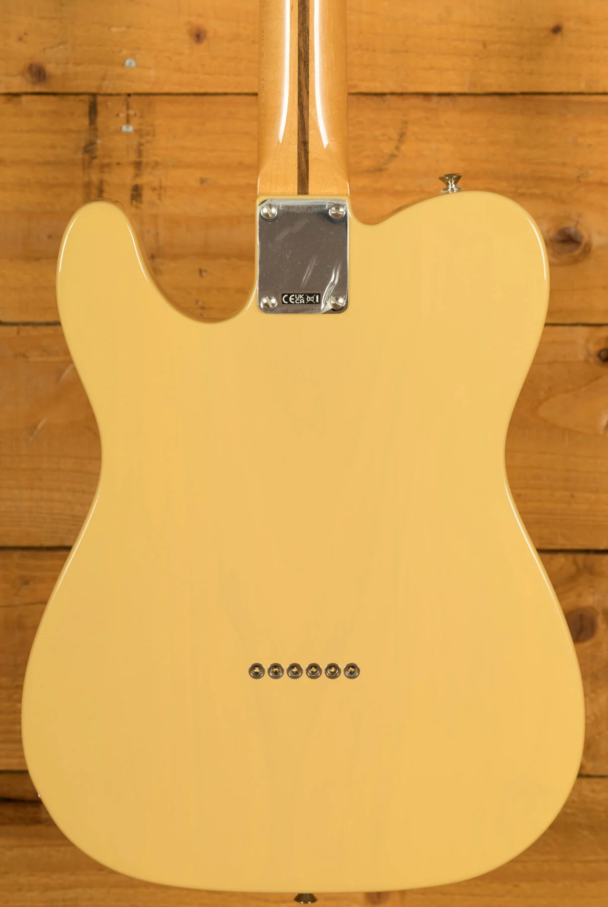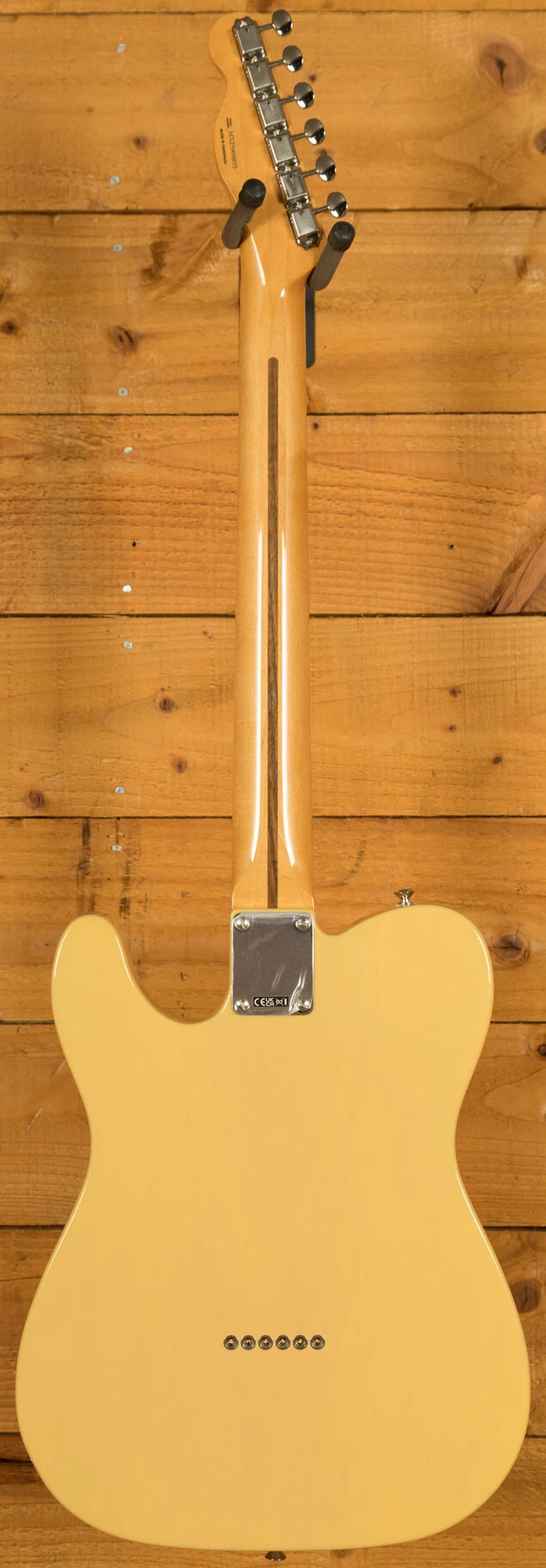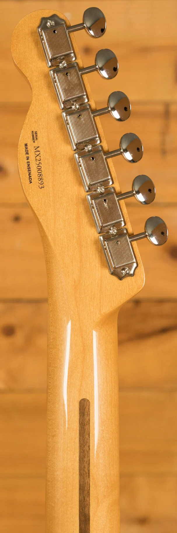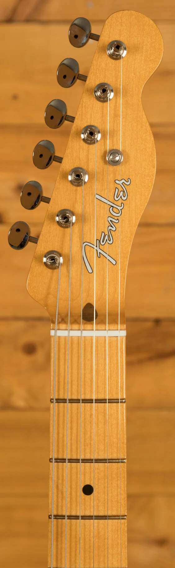 Under the hood lies a pair of vintage-style '50s pickups, delivering the crystal-clear chime and raw, steely twang that defined Fender's reputation. The vintage-style 3-saddle bridge, equipped with barrel brass saddles, faithfully reproduces the twang characteristic of the '50s era. Enhancing the package further are the vintage-style tuning machines, offering classic aesthetics along with a finer gear ratio for improved tuning stability.