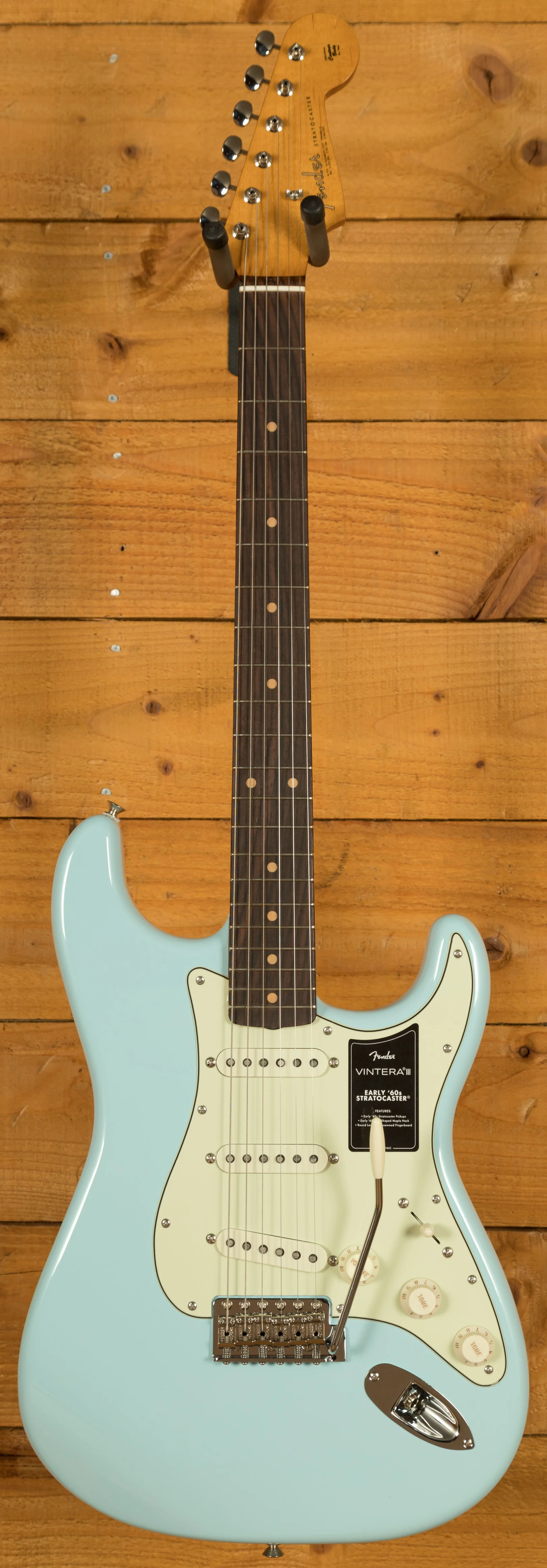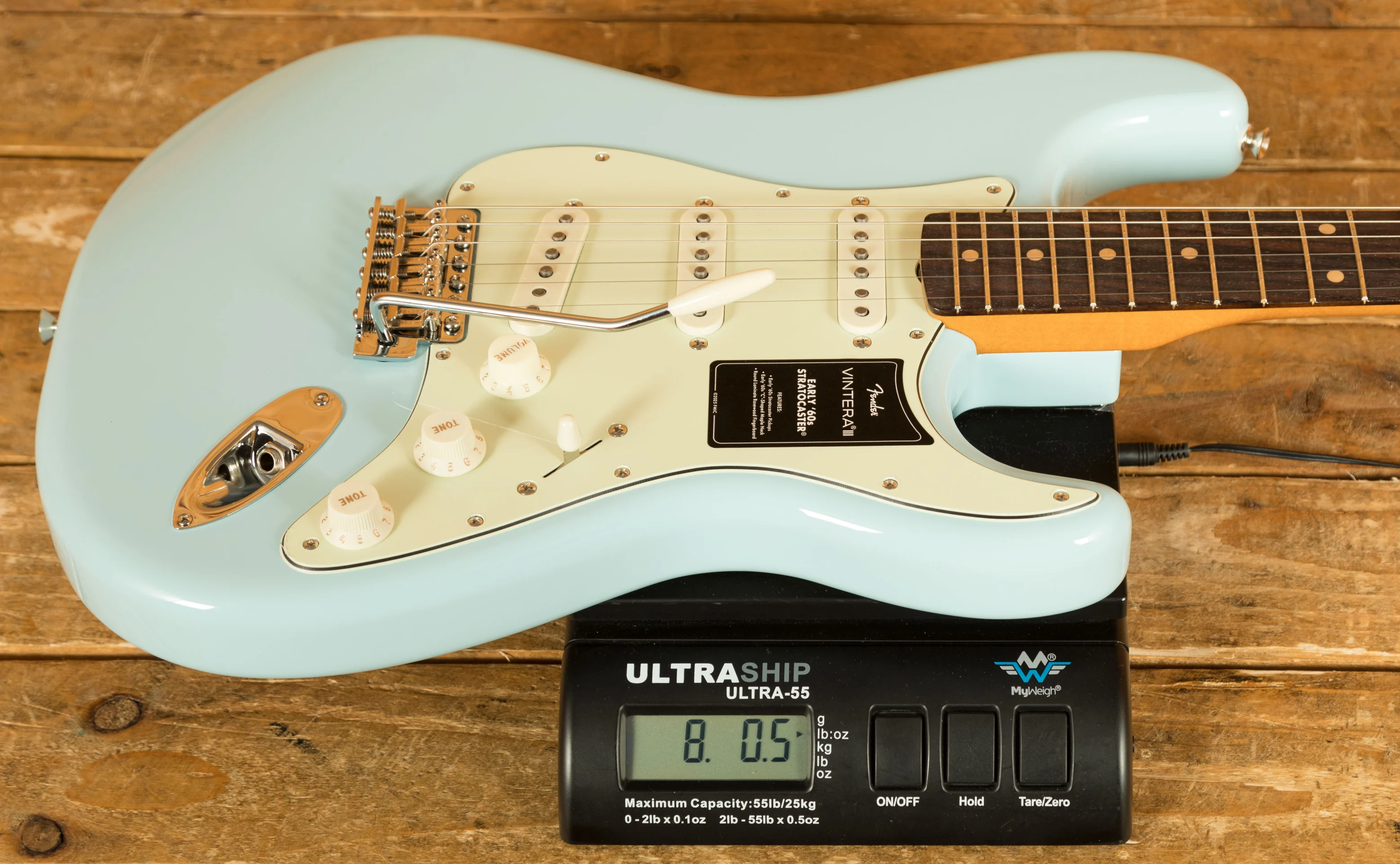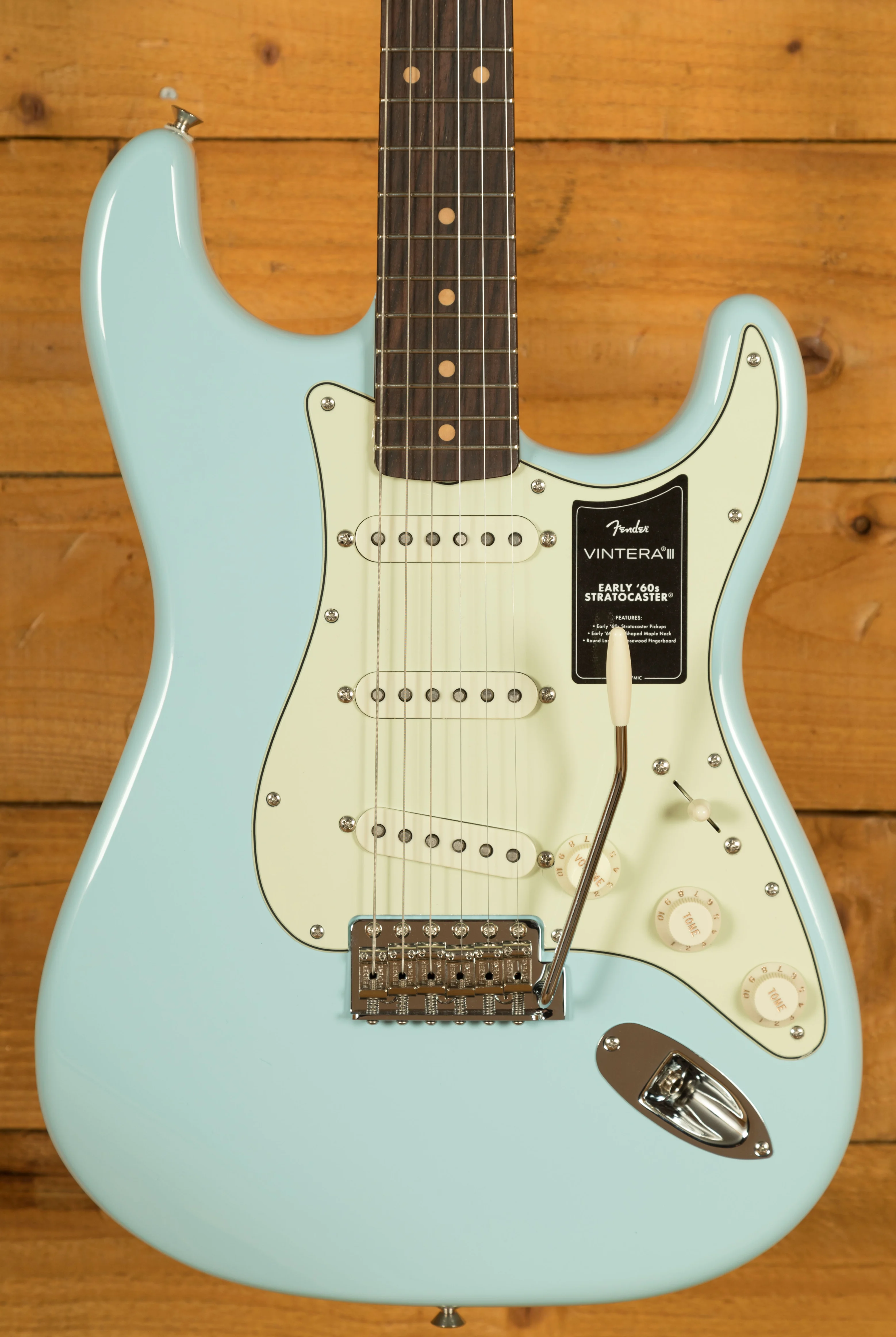The Fender Vintera III Early '60s Stratocaster pairs an alder body with a maple neck and round-laminated rosewood fingerboard to deliver the unmistakable Fender tone - punchy, resonant, and crystal clear. Its authentic Early '60s "C"-shaped neck feels instantly familiar, while the 7.25" radius and vintage-tall frets provide a comfortable, vintage-style playing experience with added ease for bends and vibrato. Three Early '60s-spec pickups capture the bright, articulate, glass-like tones that defined the era, offering chime, clarity, and classic Strat character.