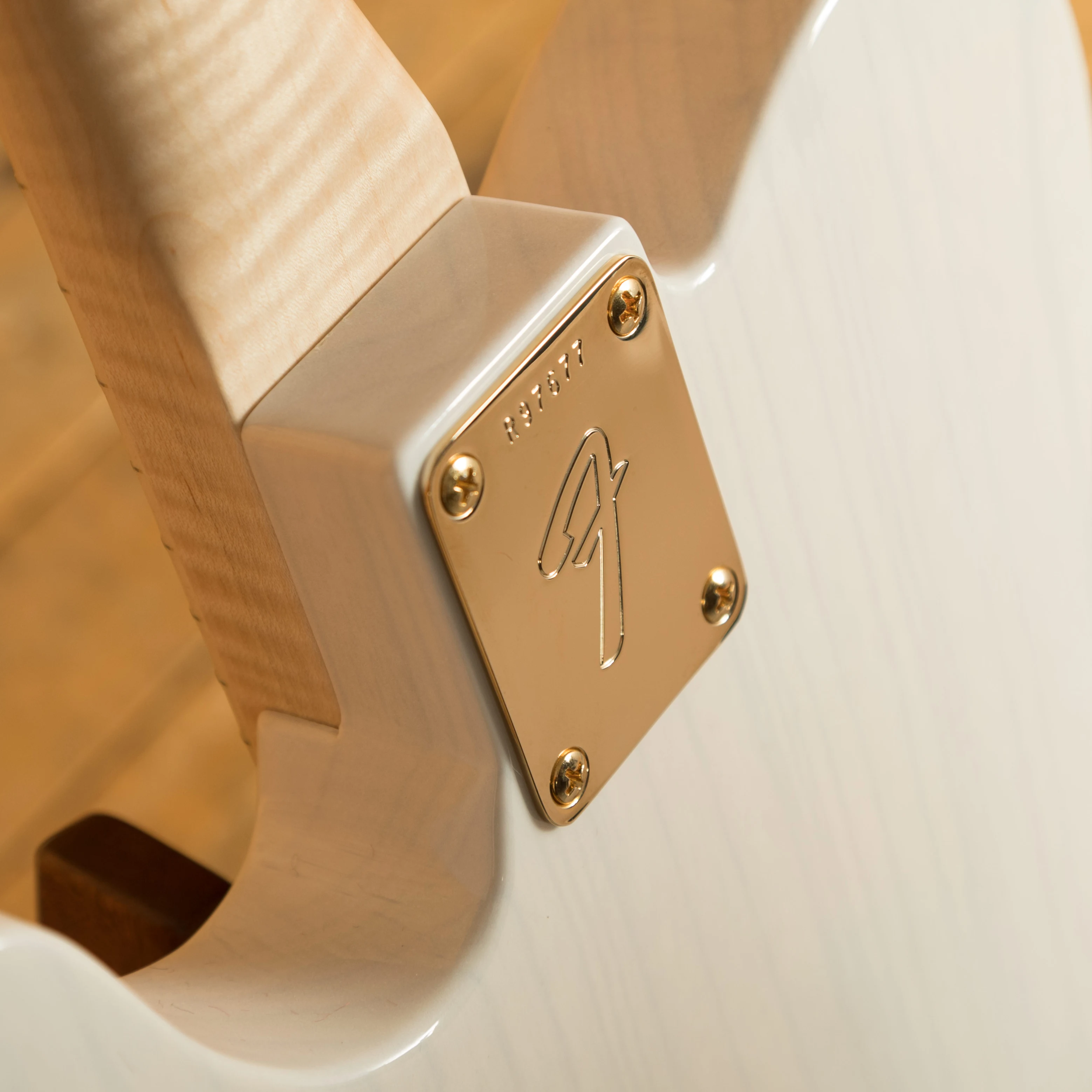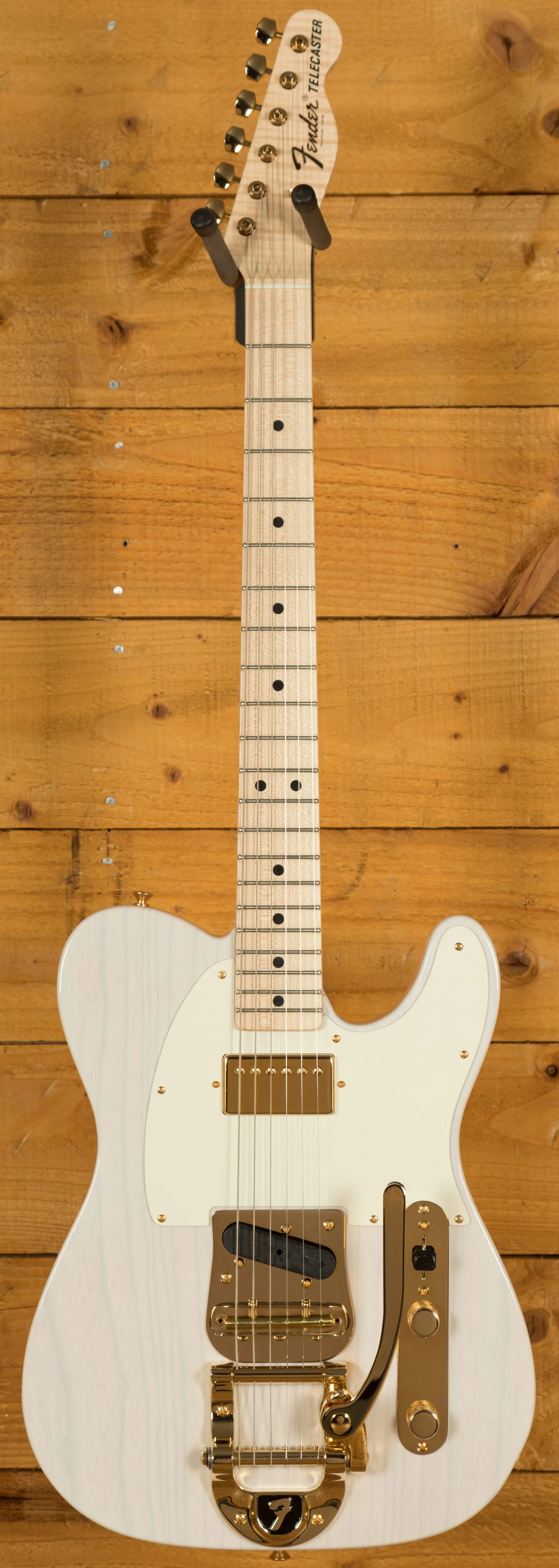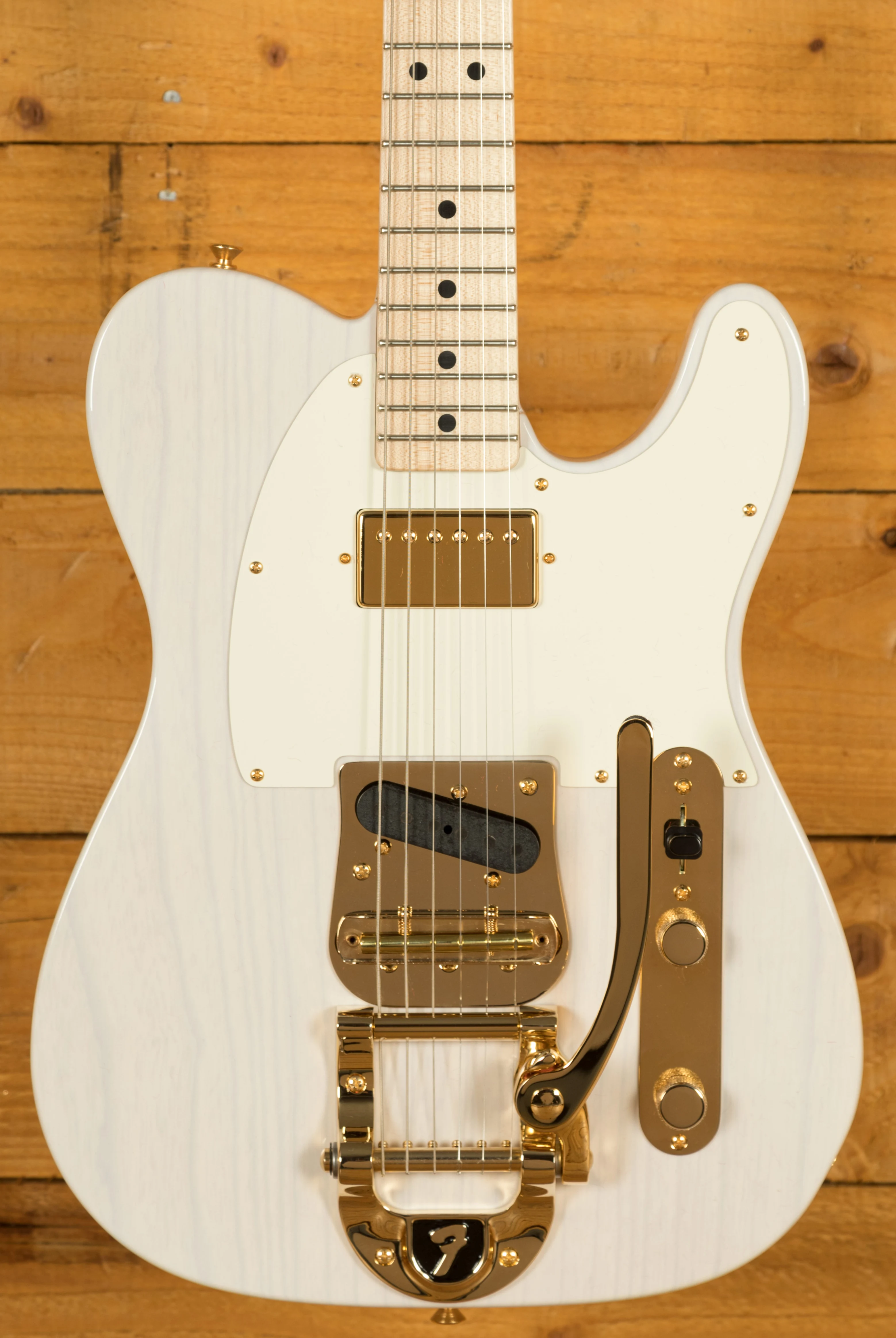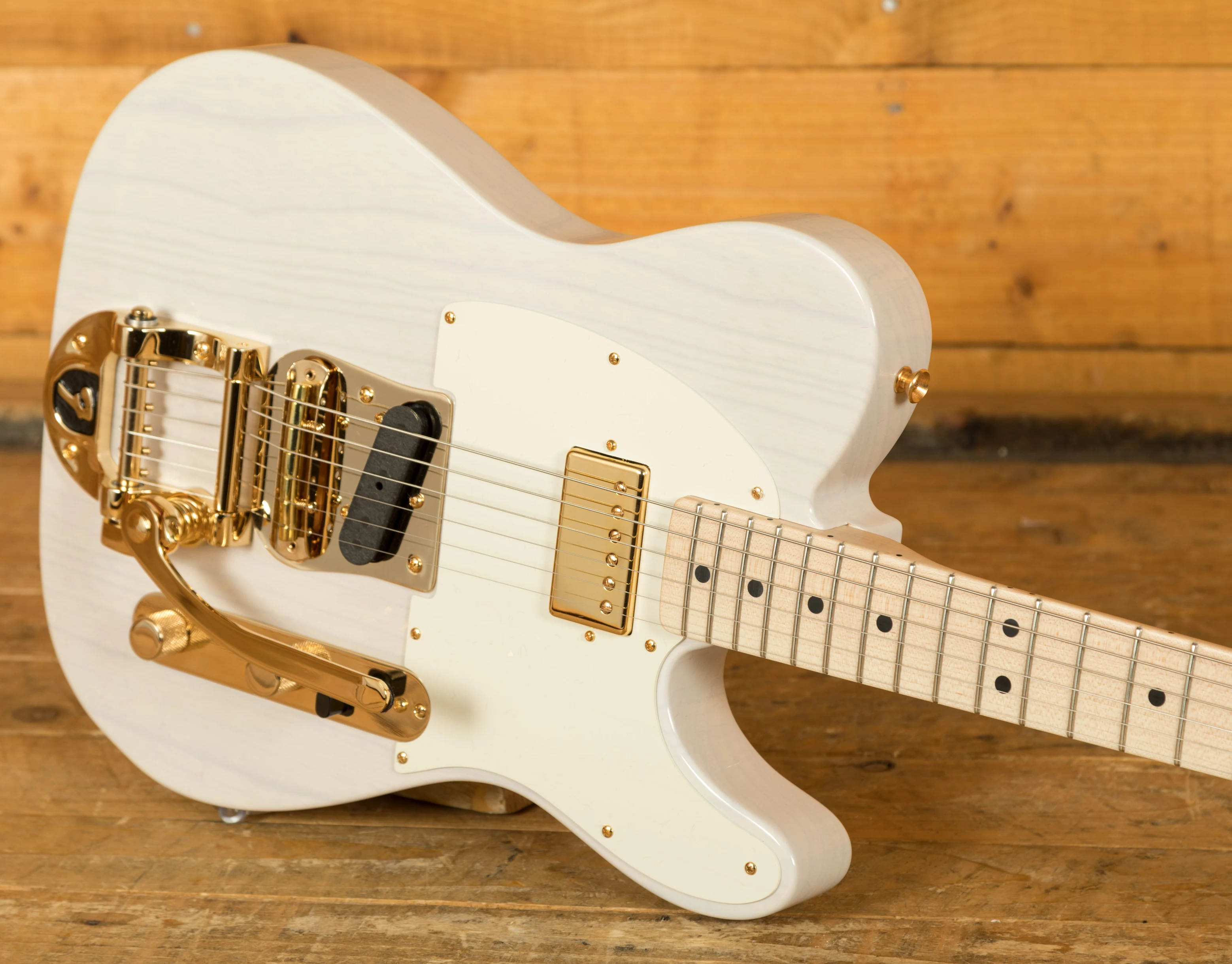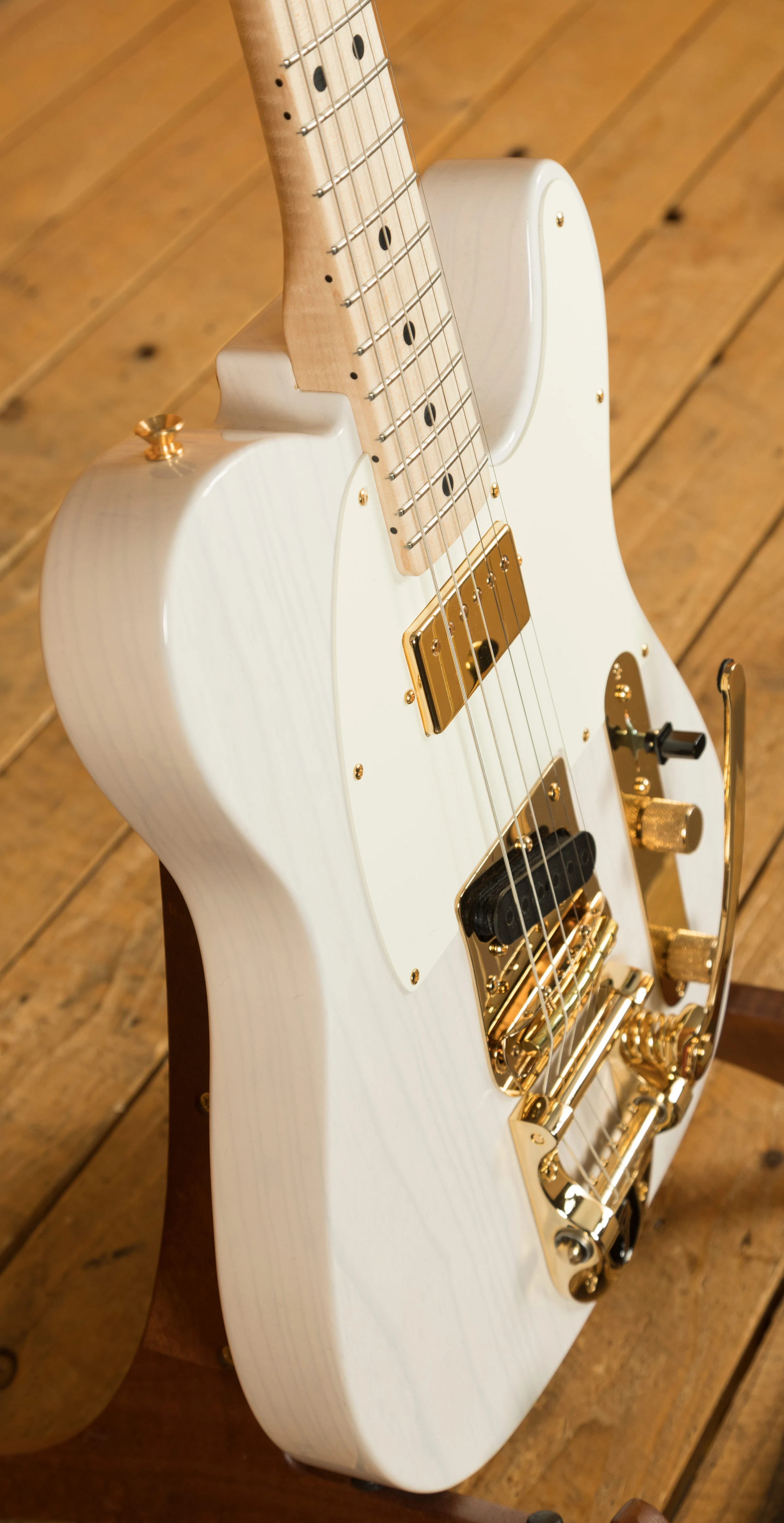 An Ash body is finished in a majestic White Blonde, as this is a transparent colour you can really appreciate the beauty of the wood grain. This finish will wear beautifully with time and develop its own character even further. It also allows the natural resonance of the body to sing and sustain much more effectively compared with other finishes. The NOS finish gives the appearance of a New Old Stock guitar, one that has been perfectly preserved since leaving the factory and doesn't feature any kind of ageing or relic work. With gold hardware across the board this beauty really does stand out.