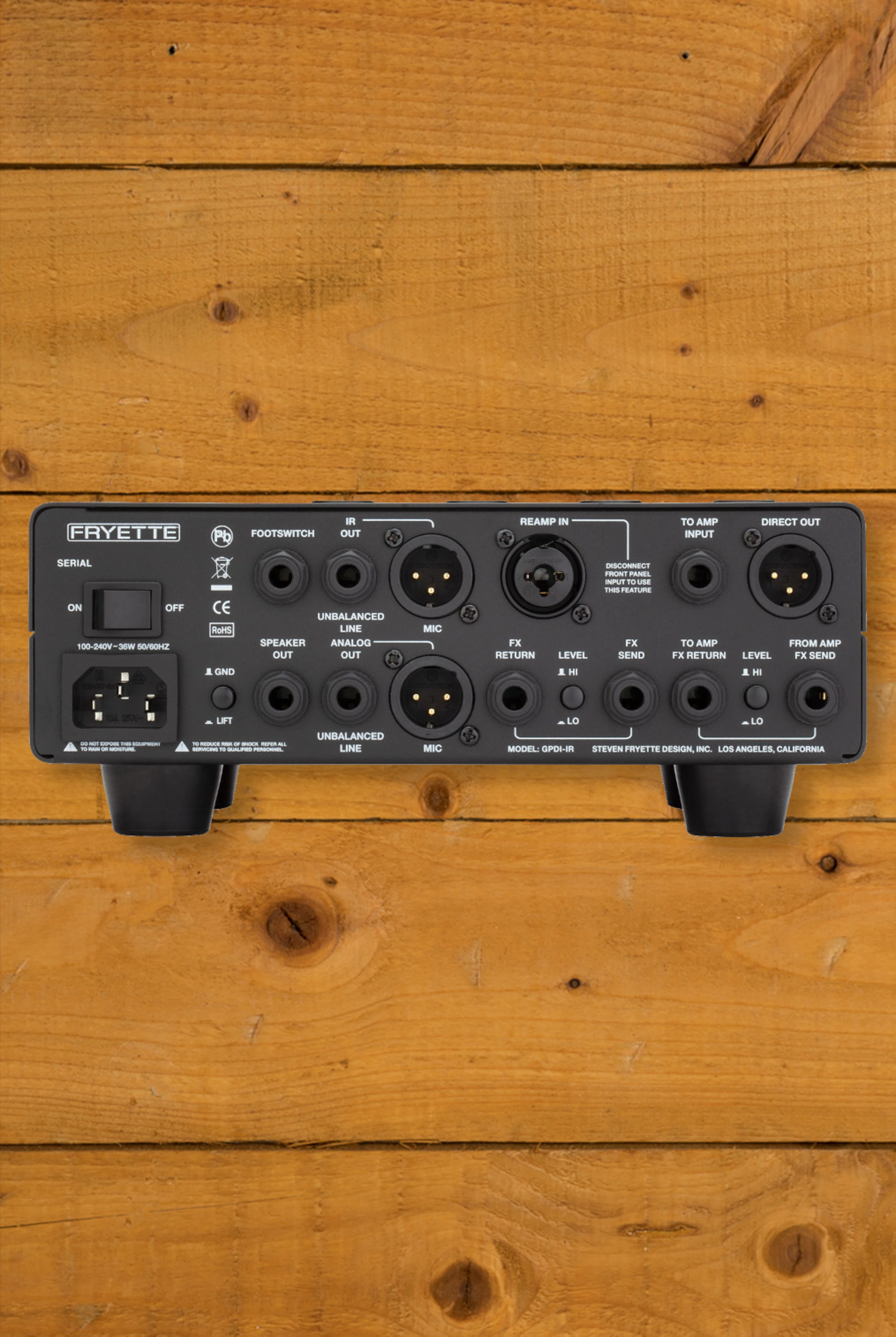 The GPDI/IR offers two integrated cabinet simulation options for maximum flexibility. The built-in digital IR loader includes memory for 16 cabinet impulse responses, with 8 preloaded Fryette cabinets and the ability to add custom IRs via the front-panel USB port. Additionally, the tunable all-analog cabinet filter delivers zero-latency response and expansive dynamic range. Users can engage either option individually, combine them for added tonal shaping, or bypass them entirely to use external IRs.