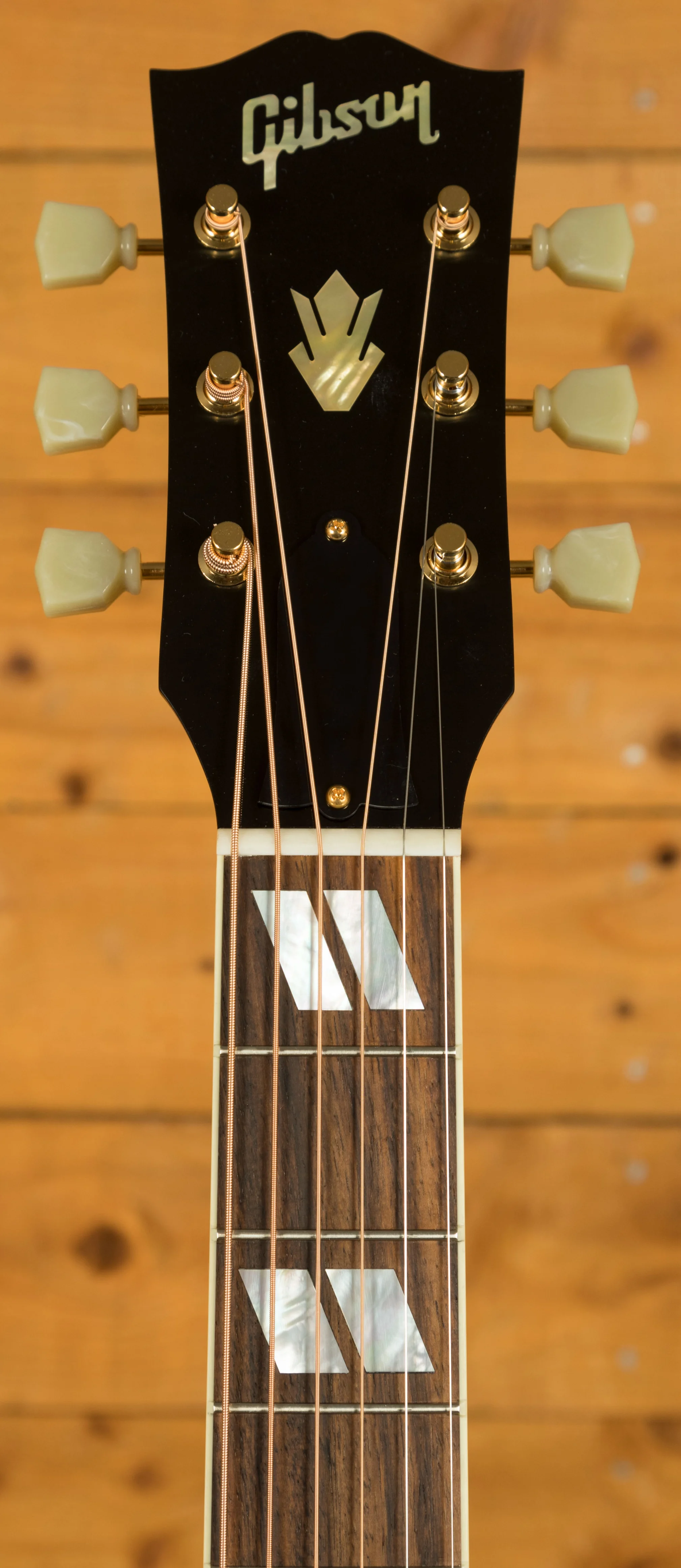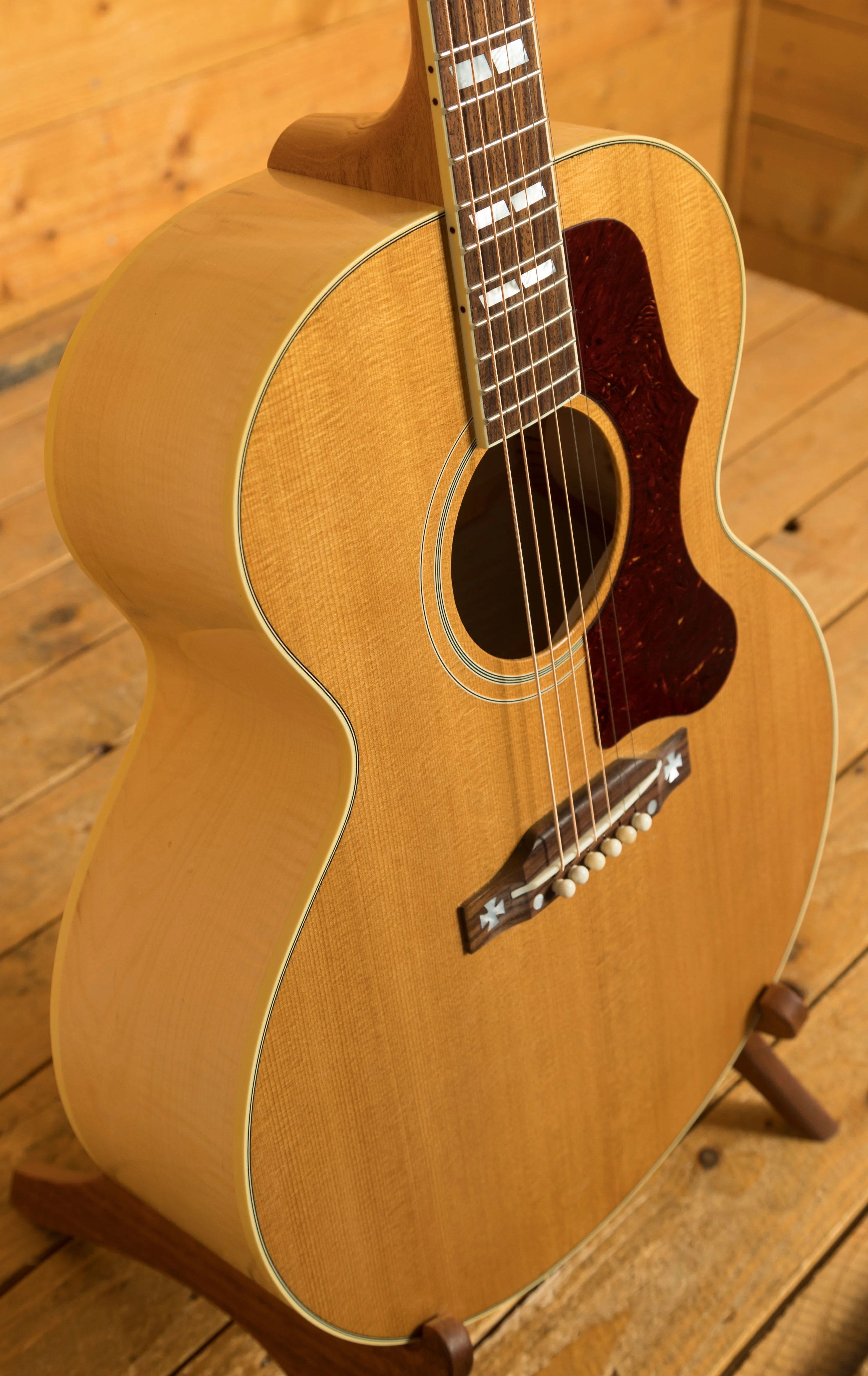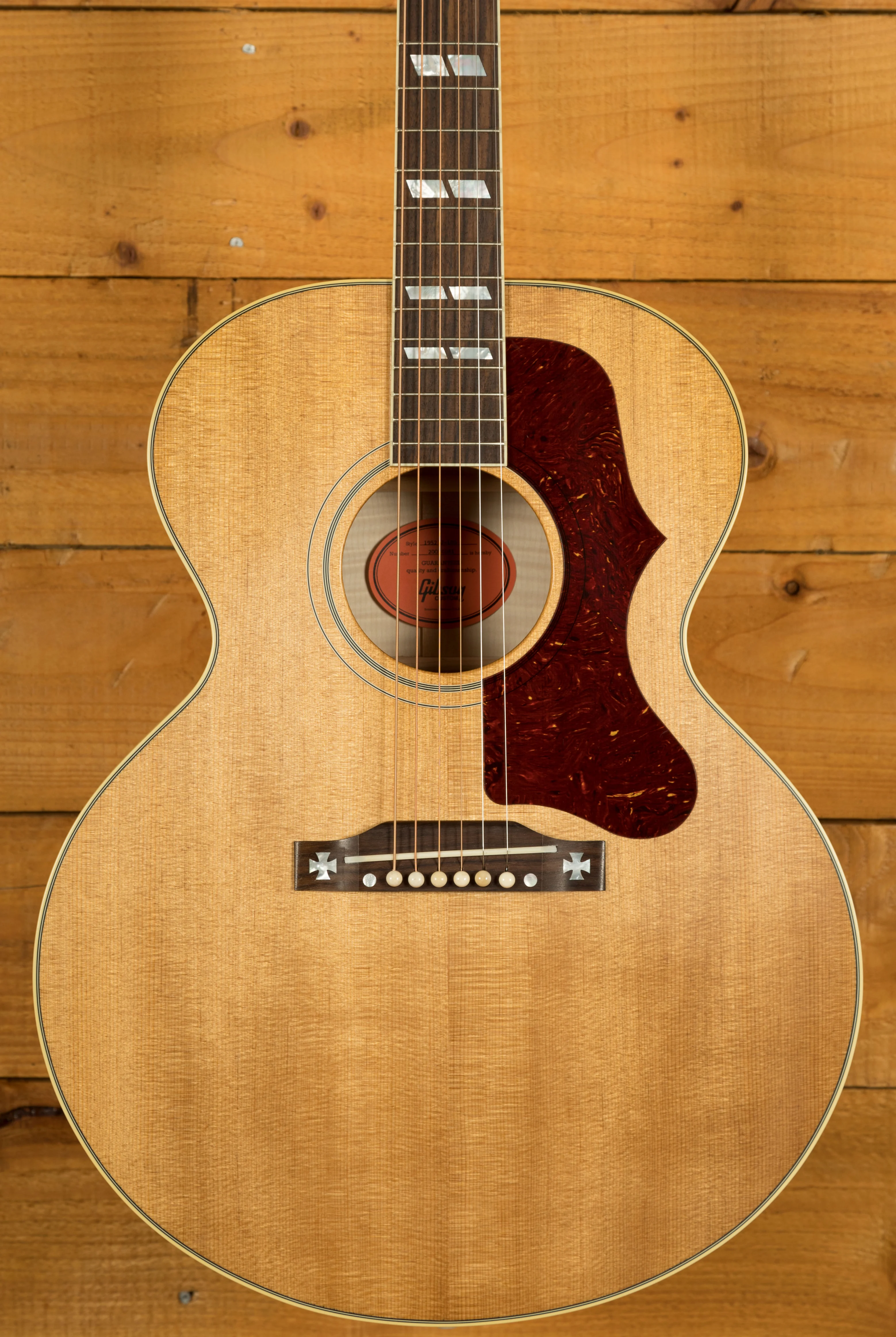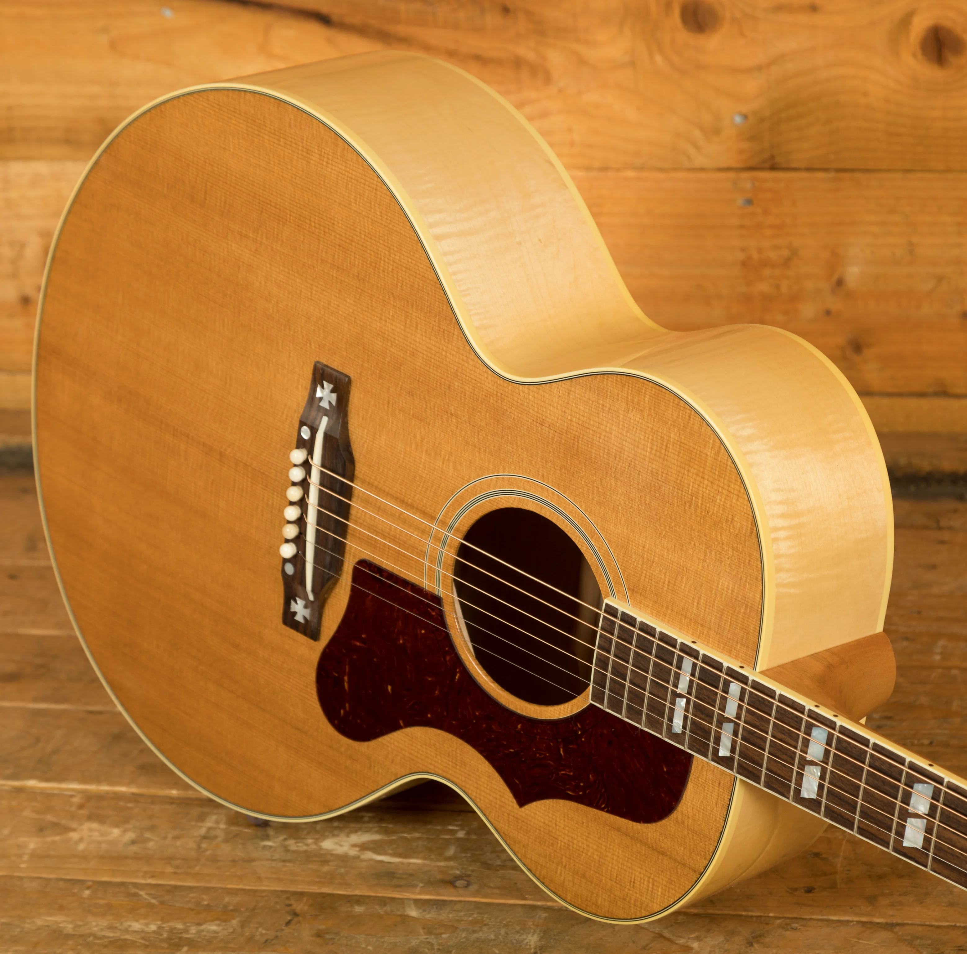 The Gibson 1952 J-185 Antique Natural is a meticulously crafted acoustic guitar, a reissue of the original J-185 model from 1952. This guitar is designed for players seeking a high-quality instrument with vintage aesthetics and performance. The J-185's slightly smaller jumbo body shape, compared to the SJ-200, offers a comfortable playing experience without sacrificing projection.
