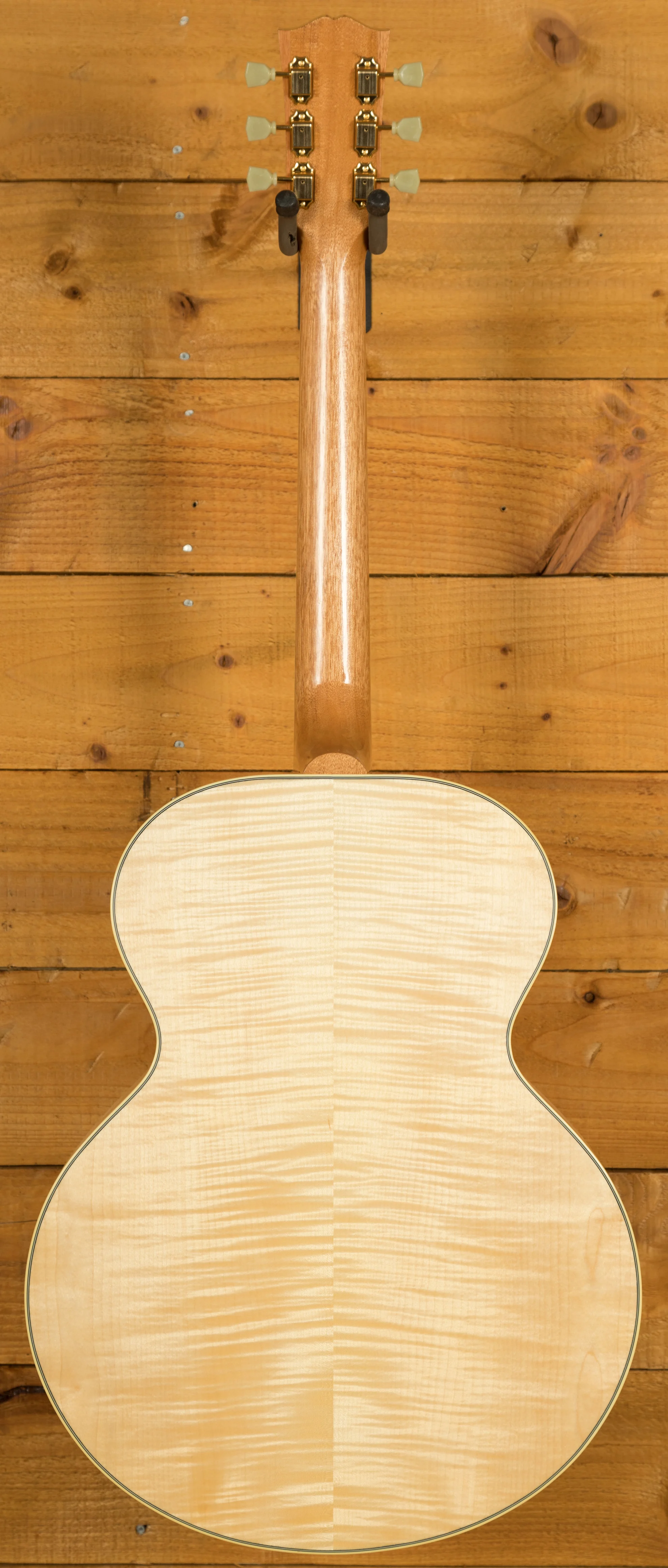 A key feature of the 1952 J-185 is its tonewood selection. The top is made from thermally aged Sitka spruce, a process that simulates the ageing of the wood over time, resulting in enhanced resonance and a richer tone. The back and sides are constructed from flame maple, contributing to the guitar's balanced tonal characteristics and striking visual appeal. Traditional hand-scalloped X-bracing, utilising hide glue, further enhances the instrument's resonance and structural integrity.