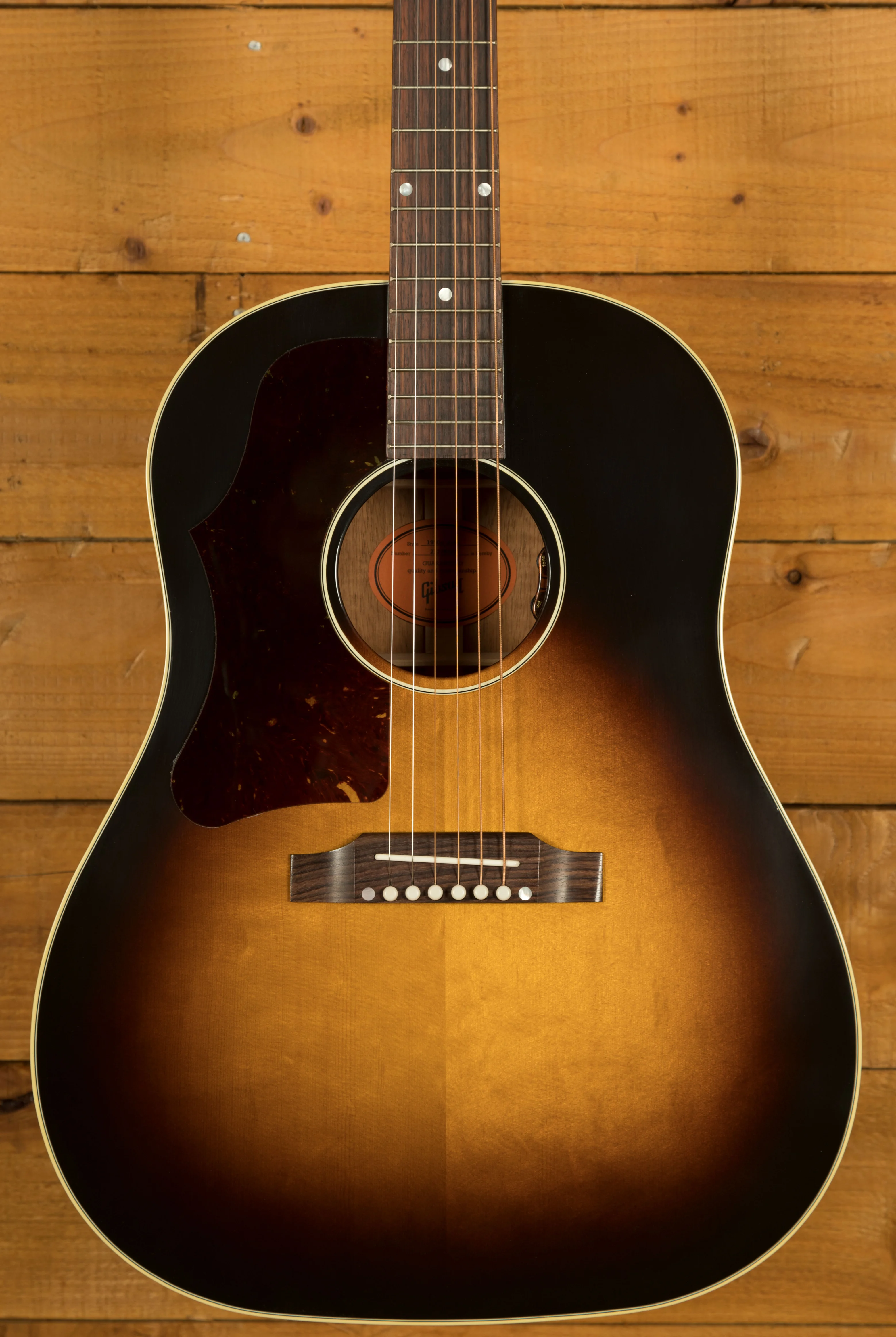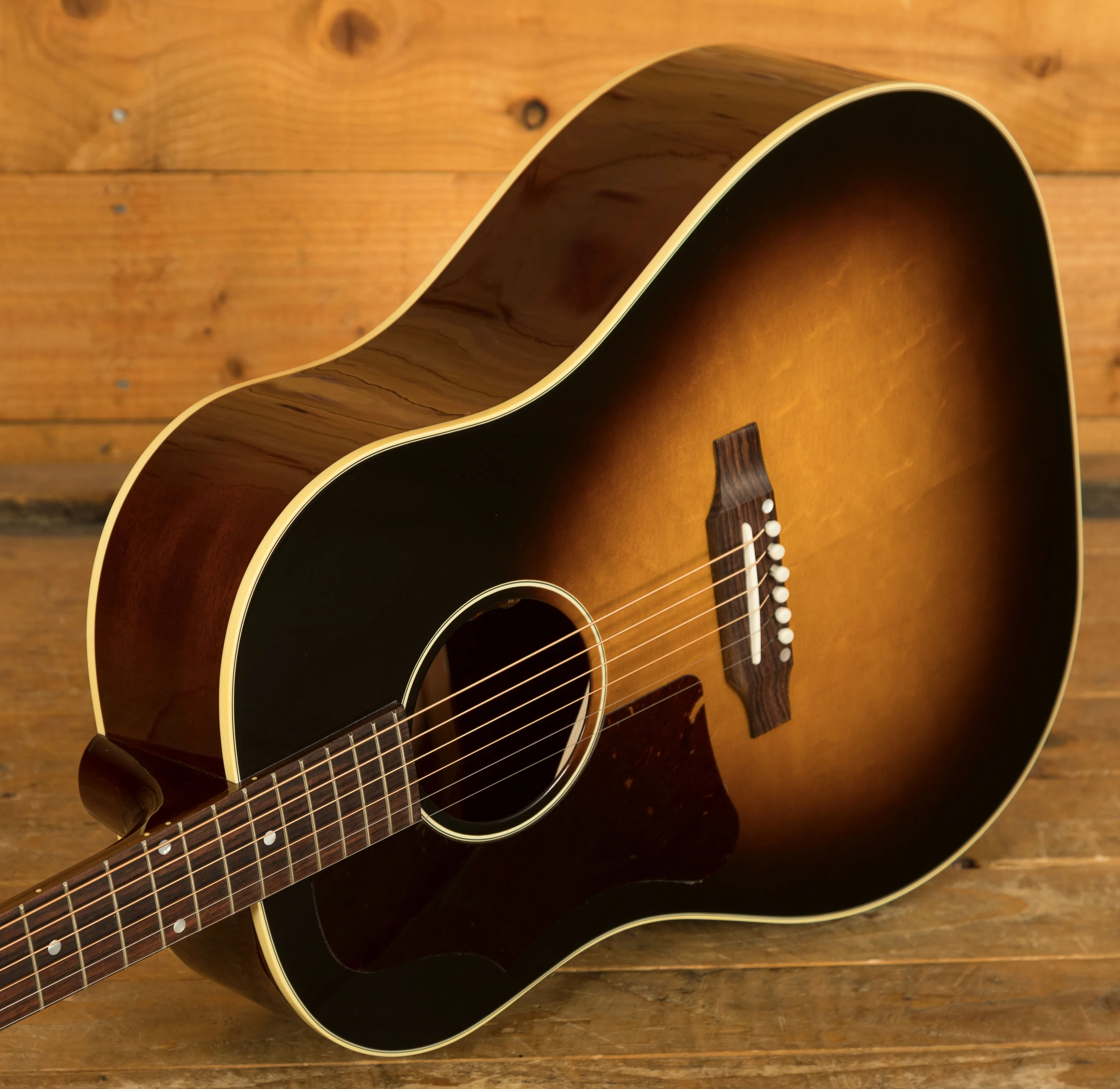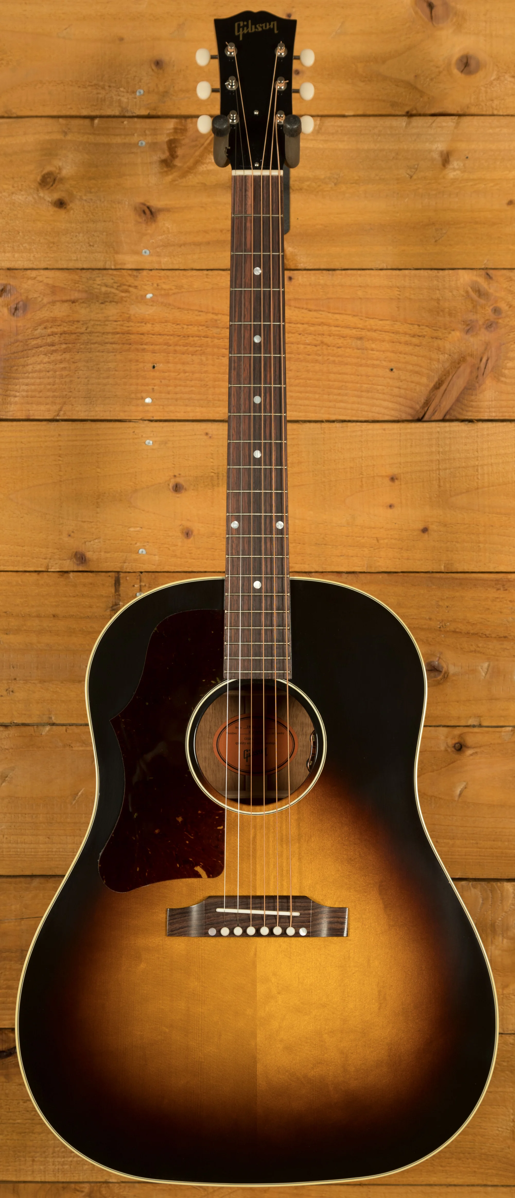 The Gibson J-45 50s Original in Vintage Sunburst offers a playing experience reminiscent of the golden age of Gibson acoustics. This round shoulder dreadnought features a solid Sitka spruce top, known for its balanced tone and projection, paired with select mahogany back and sides for warmth and richness. The traditional hand-scalloped X-bracing further enhances the guitar's resonance and responsiveness. The vintage-inspired aesthetic is evident in the subtly antiqued multi-ply top and single-ply back binding, giving the instrument the appearance of a well-loved classic. Other period-correct appointments include cream button tuners, a 50s-era tortoise pickguard, and a rounded neck profile for comfortable playability. The rosewood fingerboard with mother-of-pearl dot inlays adds a touch of elegance. For amplified performance, the J-45 50s Original comes equipped with an LR Baggs VTC pickup, providing a natural and accurate representation of the guitar's acoustic tone. The guitar has a 24.75-inch scale length, a 12-inch fingerboard radius, and a 1.724-inch bone nut. It features 20 standard frets, a traditional belly-up bridge with a bone saddle, and Tusq bridge pins. The nickel finish hardware includes Grover Strap Cream Button tuning machines. It comes with a hardshell case and a Gibson accessory kit.