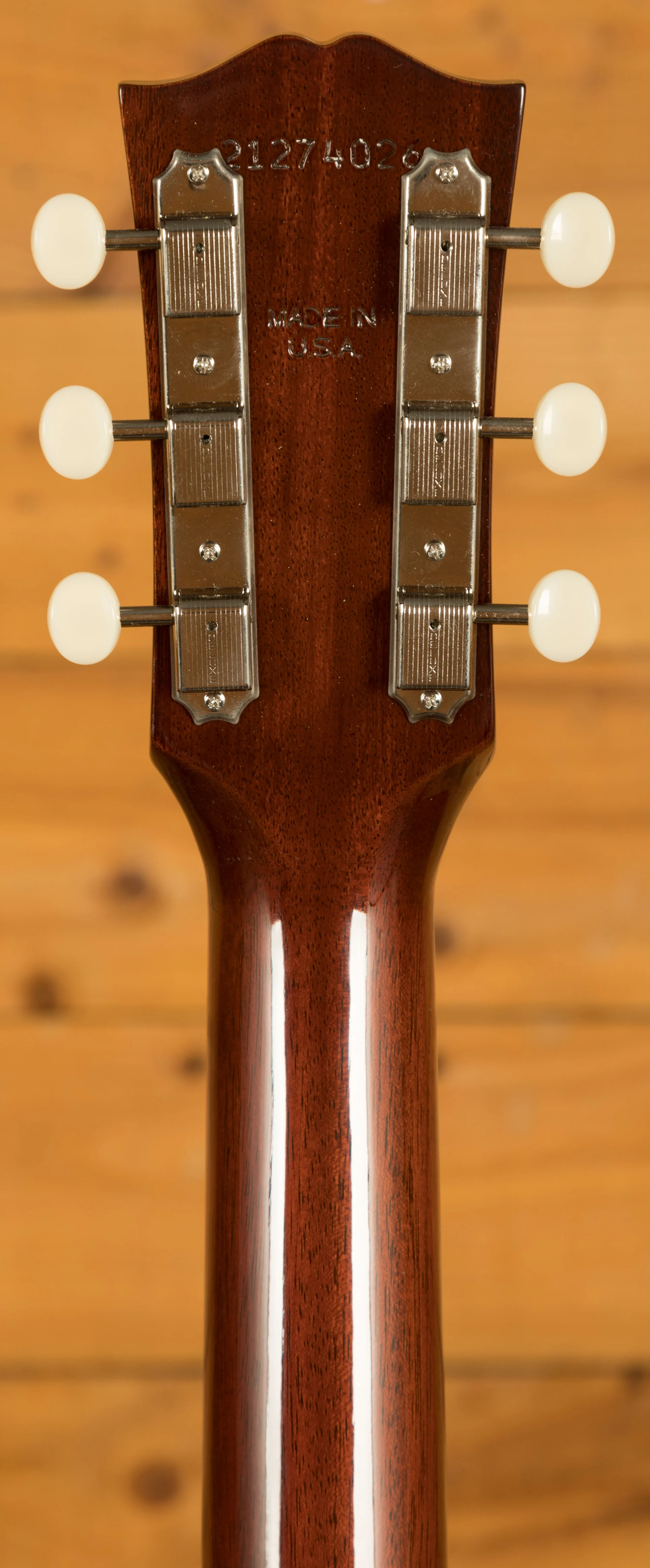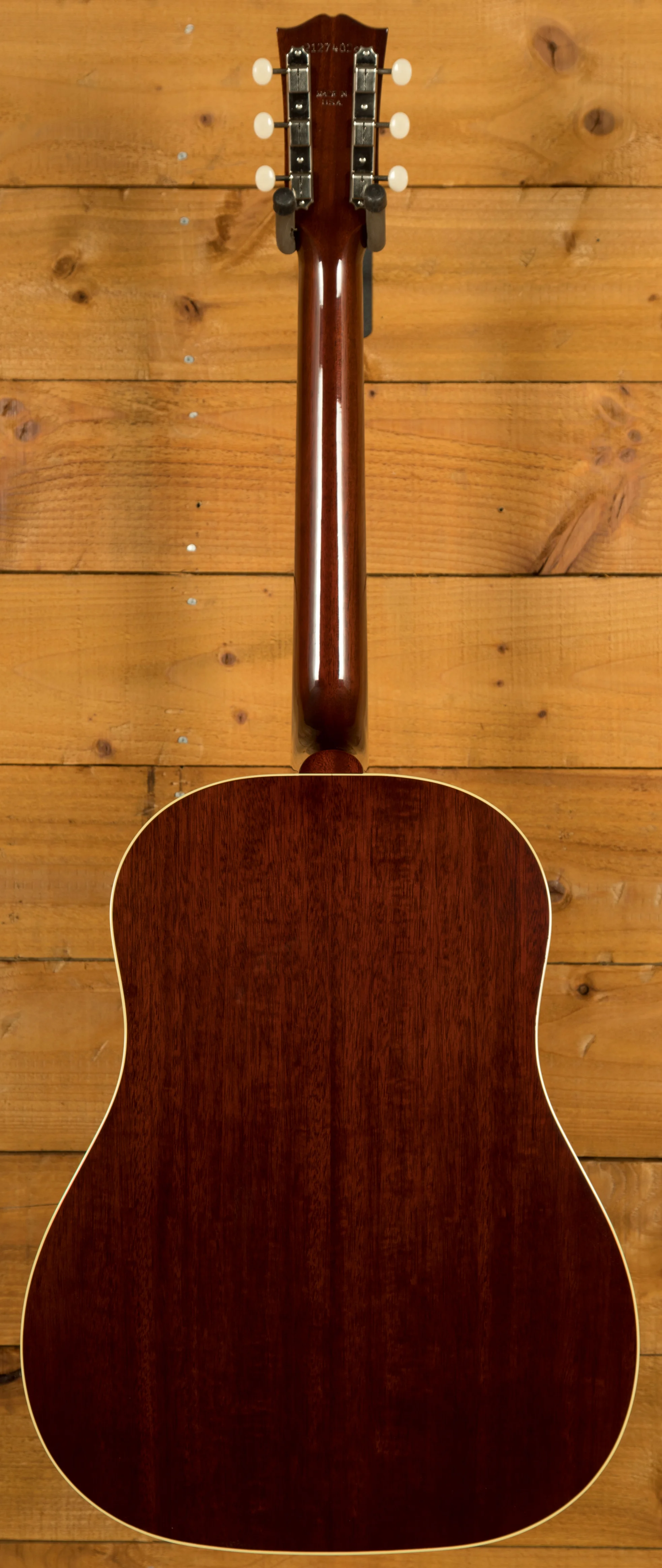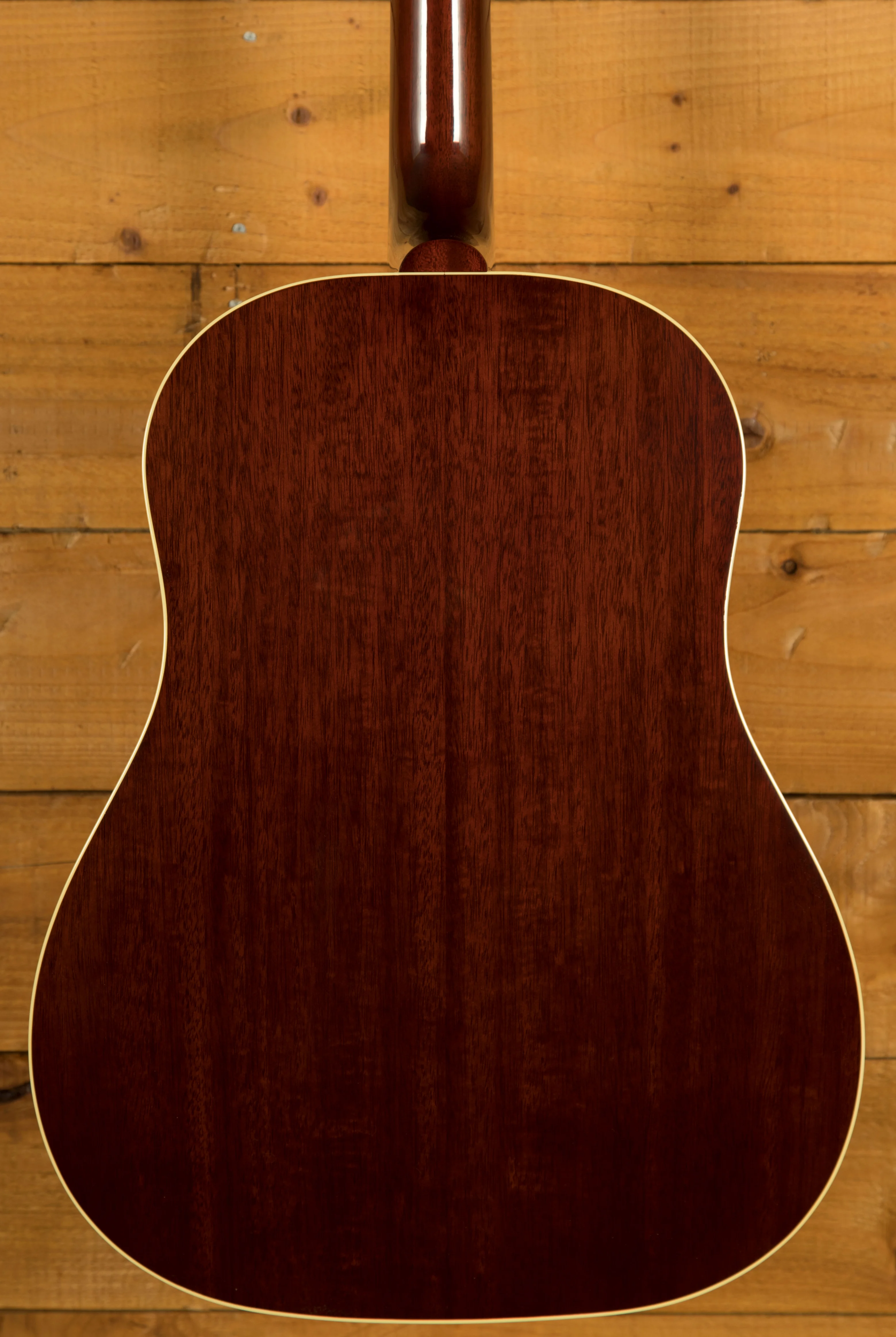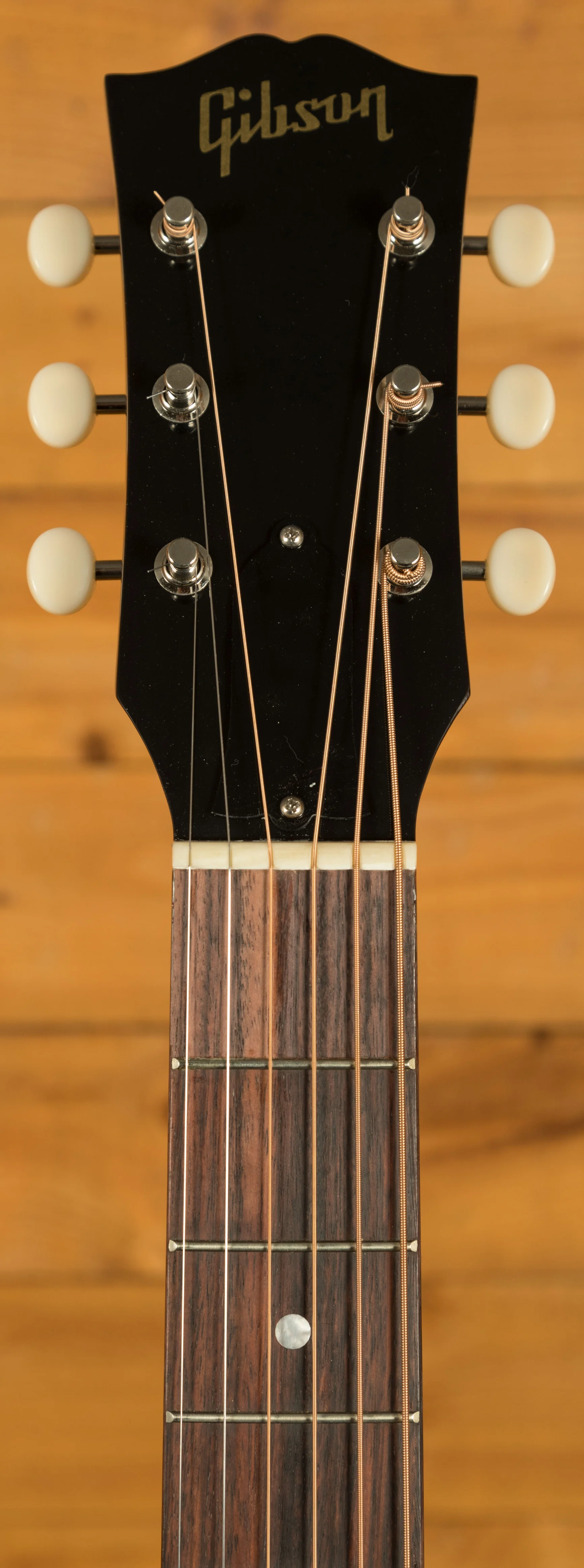 The Gibson J-45 50s Original in Vintage Sunburst offers a playing experience reminiscent of the golden age of Gibson acoustics. This round shoulder dreadnought features a solid Sitka spruce top, known for its balanced tone and projection, paired with select mahogany back and sides for warmth and richness. The traditional hand-scalloped X-bracing further enhances the guitar's resonance and responsiveness. The vintage-inspired aesthetic is evident in the subtly antiqued multi-ply top and single-ply back binding, giving the instrument the appearance of a well-loved classic. Other period-correct appointments include cream button tuners, a 50s-era tortoise pickguard, and a rounded neck profile for comfortable playability. The rosewood fingerboard with mother-of-pearl dot inlays adds a touch of elegance. For amplified performance, the J-45 50s Original comes equipped with an LR Baggs VTC pickup, providing a natural and accurate representation of the guitar's acoustic tone. The guitar has a 24.75-inch scale length, a 12-inch fingerboard radius, and a 1.724-inch bone nut. It features 20 standard frets, a traditional belly-up bridge with a bone saddle, and Tusq bridge pins. The nickel finish hardware includes Grover Strap Cream Button tuning machines. It comes with a hardshell case and a Gibson accessory kit.