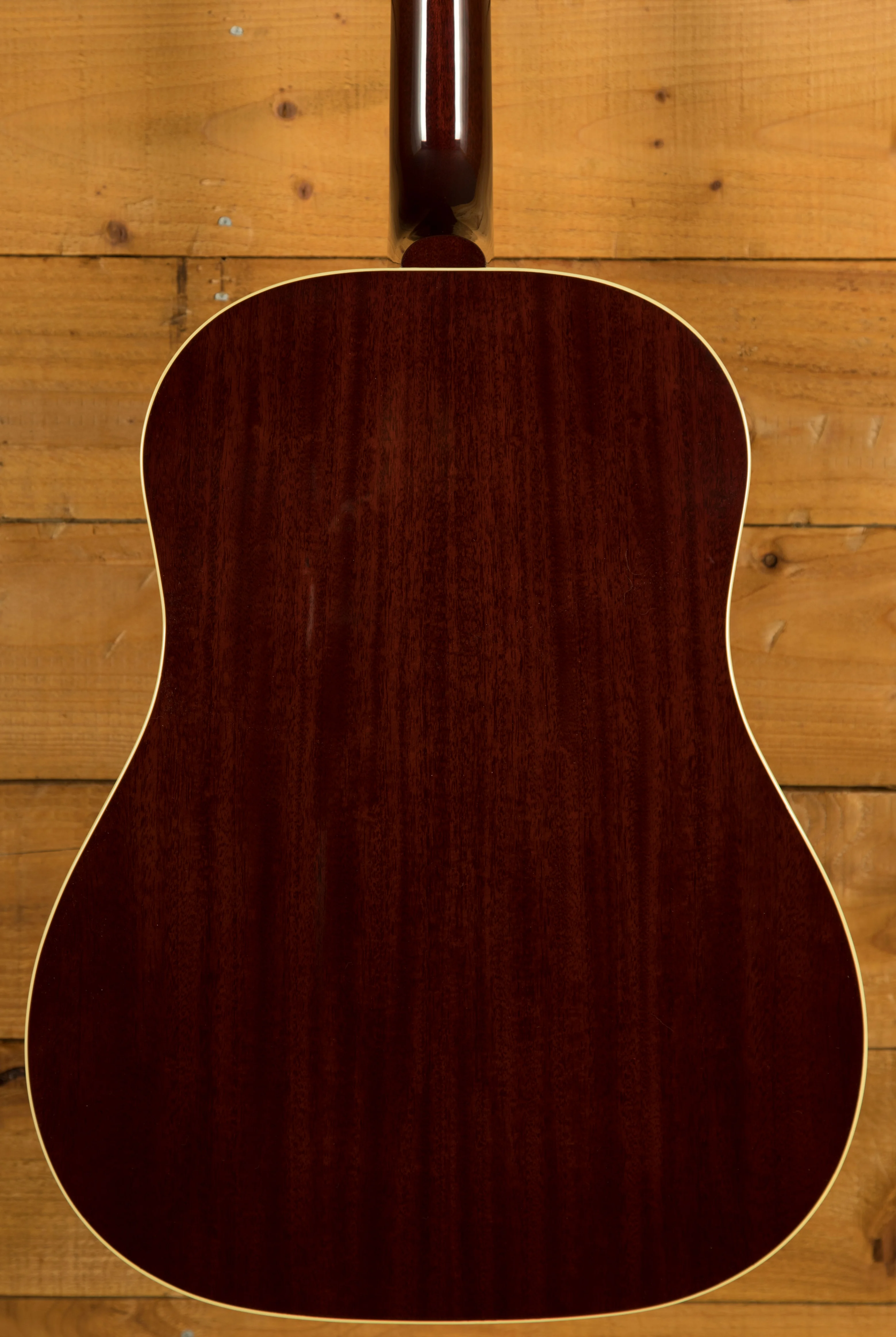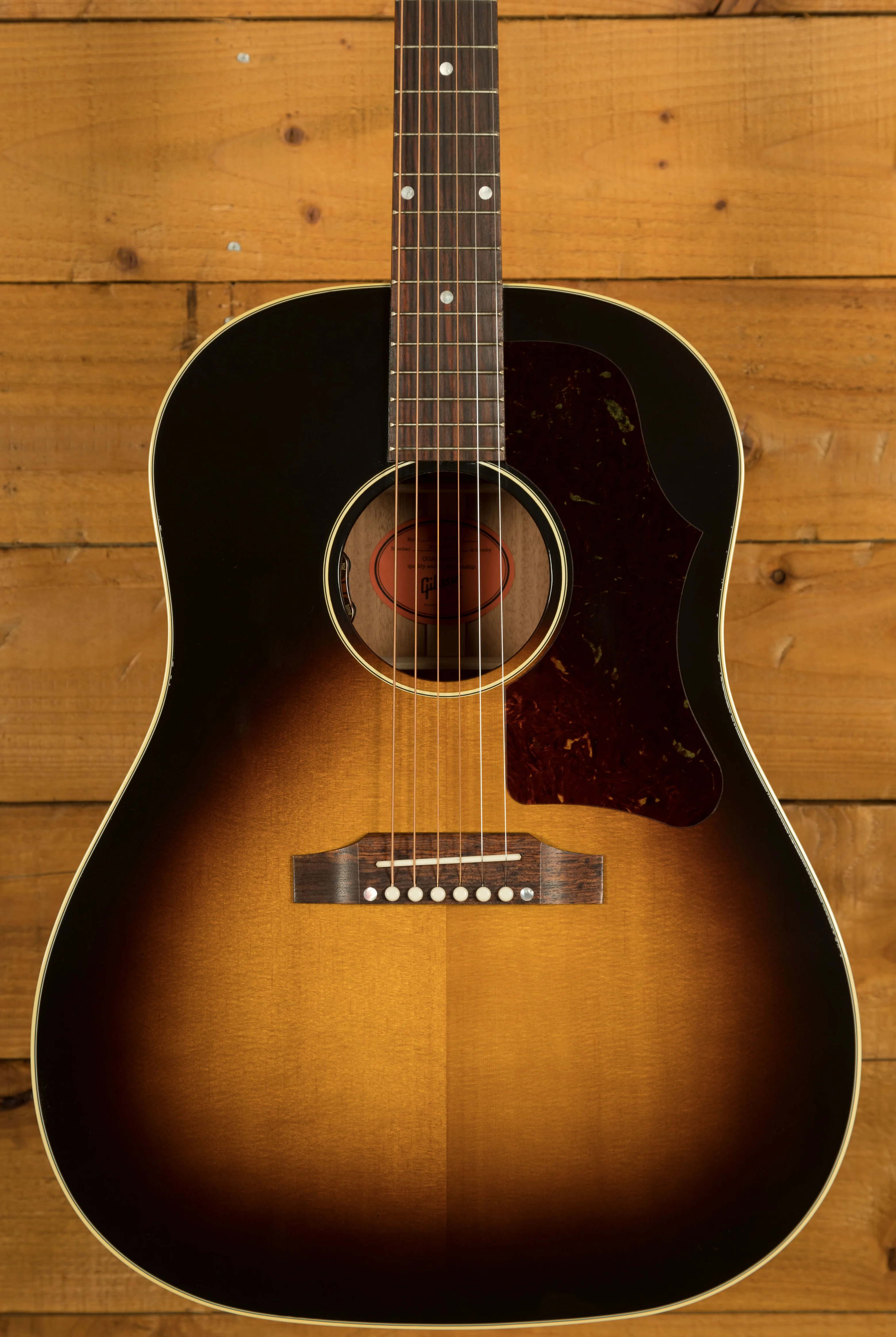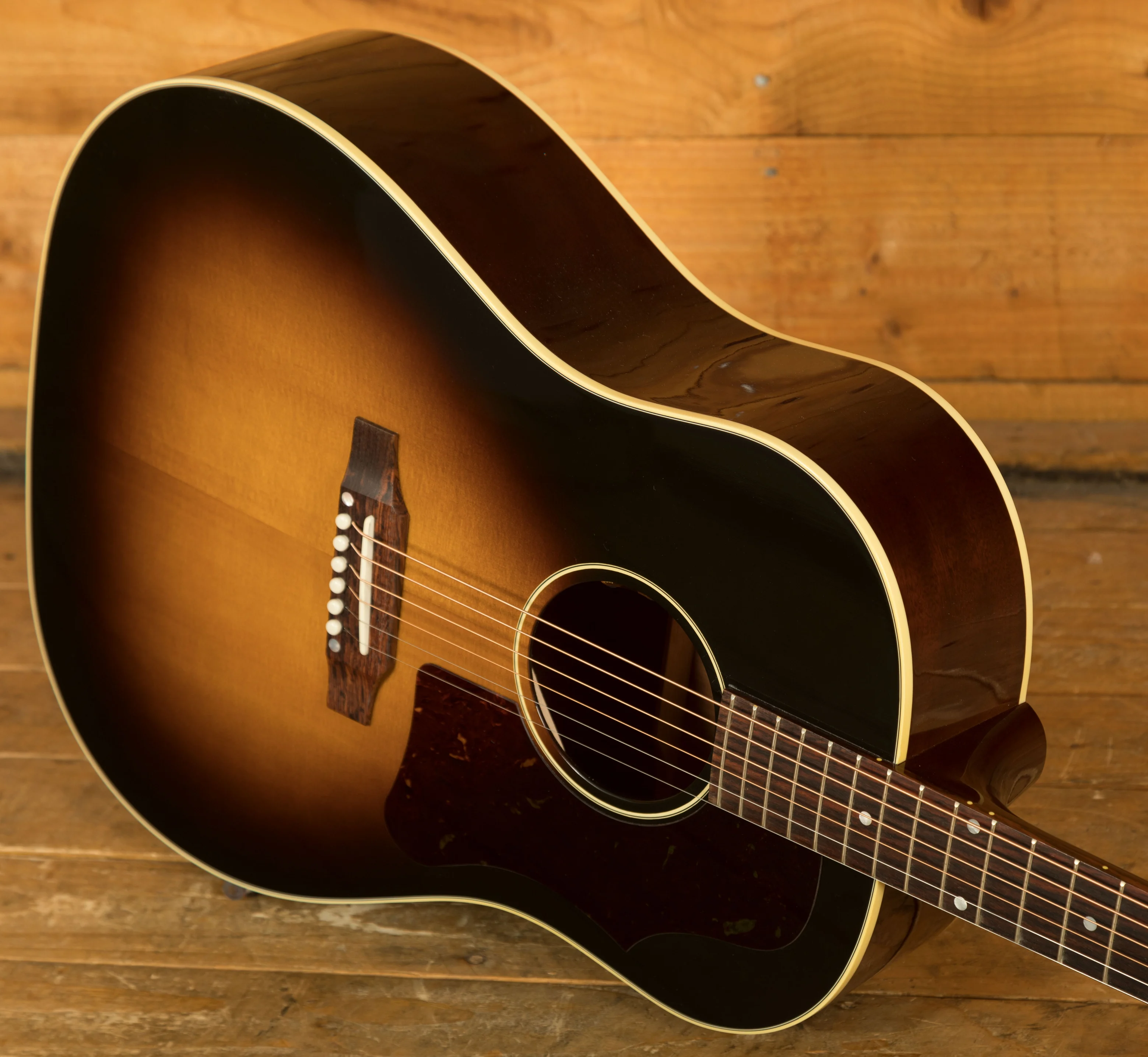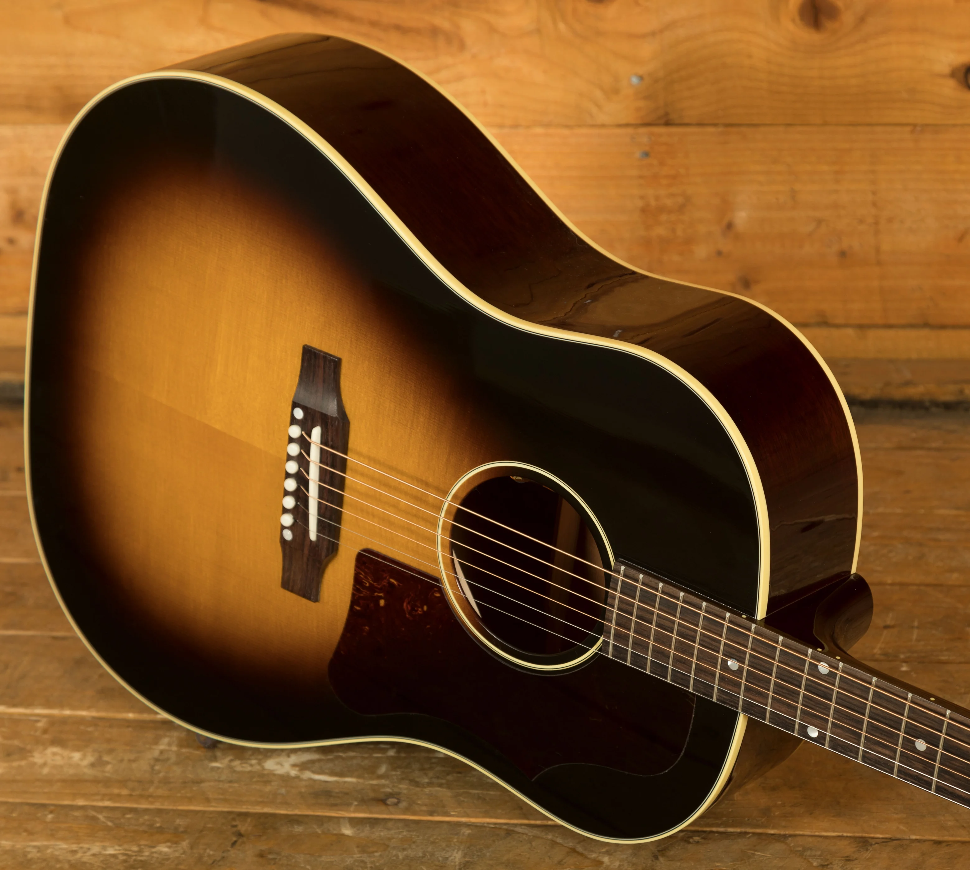The Gibson J-45 50s Original in Vintage Sunburst offers a playing experience reminiscent of the golden age of Gibson acoustics. This round shoulder dreadnought features a solid Sitka spruce top, known for its balanced tone and projection, paired with select mahogany back and sides for warmth and richness. The traditional hand-scalloped X-bracing further enhances the guitar's resonance and responsiveness. The vintage-inspired aesthetic is evident in the subtly antiqued multi-ply top and single-ply back binding, giving the instrument the appearance of a well-loved classic. Other period-correct appointments include cream button tuners, a 50s-era tortoise pickguard, and a rounded neck profile for comfortable playability. The rosewood fingerboard with mother-of-pearl dot inlays adds a touch of elegance. For amplified performance, the J-45 50s Original comes equipped with an LR Baggs VTC pickup, providing a natural and accurate representation of the guitar's acoustic tone. The guitar has a 24.75-inch scale length, a 12-inch fingerboard radius, and a 1.724-inch bone nut. It features 20 standard frets, a traditional belly-up bridge with a bone saddle, and Tusq bridge pins. The nickel finish hardware includes Grover Strap Cream Button tuning machines. It comes with a hardshell case and a Gibson accessory kit.