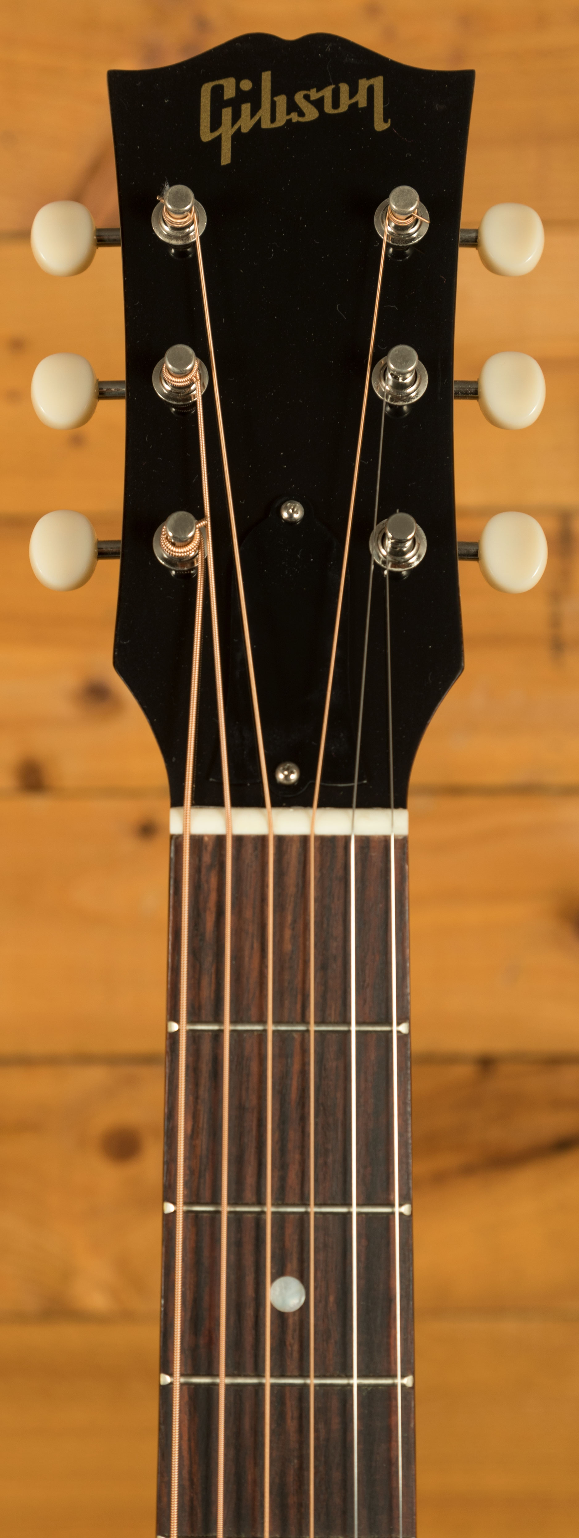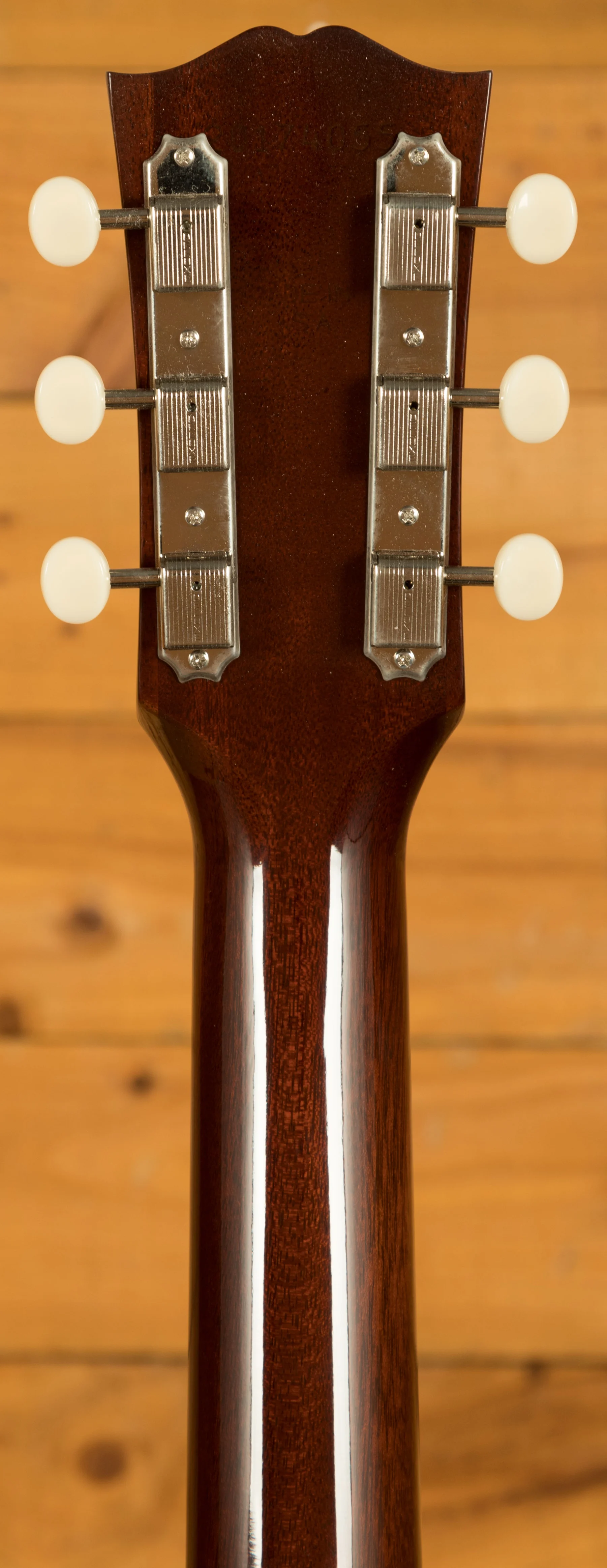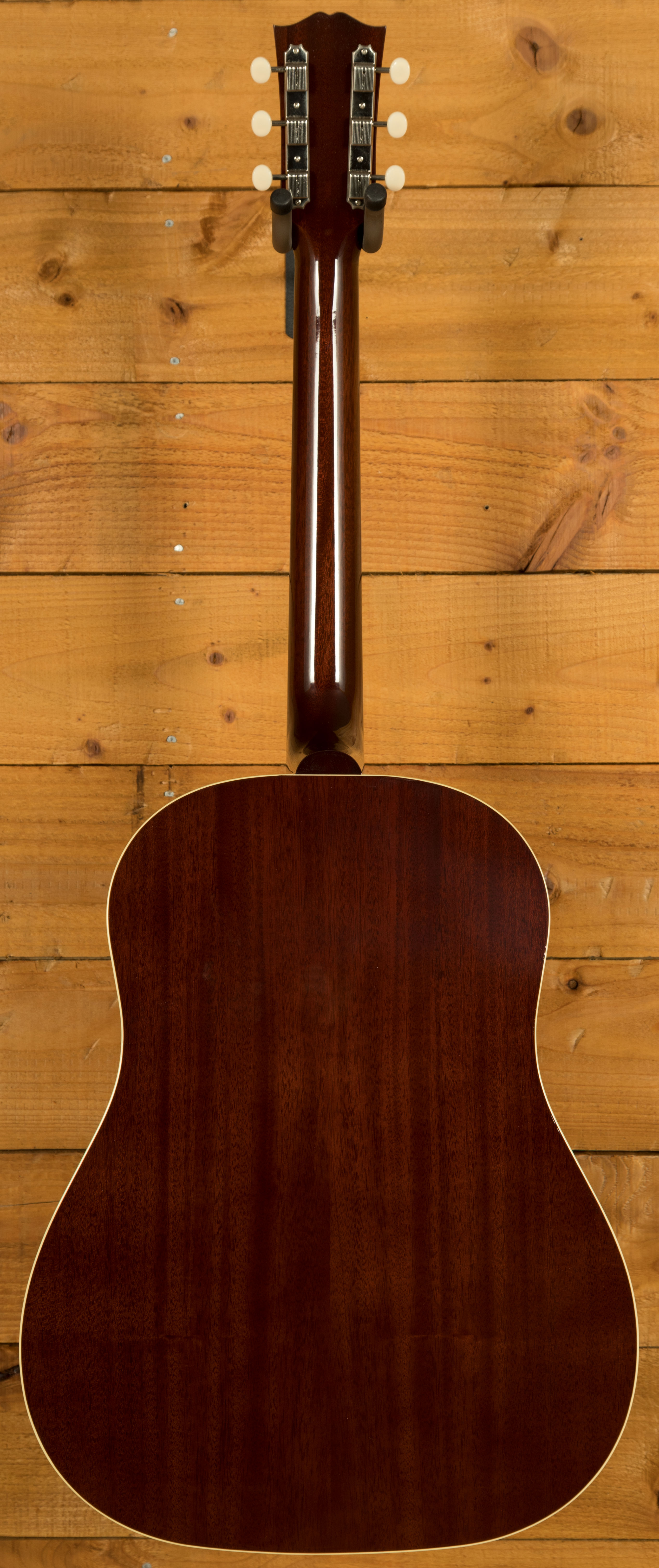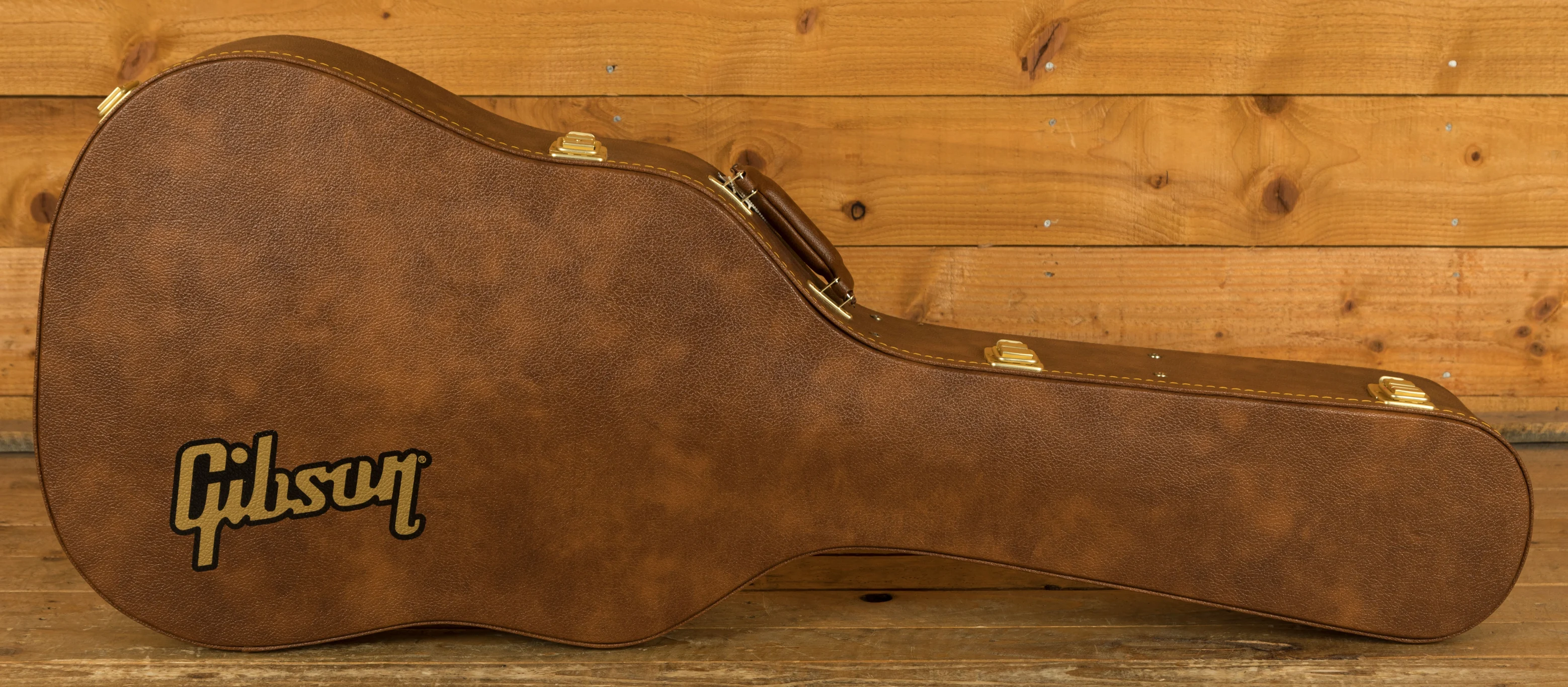 The Gibson J-45 50s Original in Vintage Sunburst offers a playing experience reminiscent of the golden age of Gibson acoustics. This round shoulder dreadnought features a solid Sitka spruce top, known for its balanced tone and projection, paired with select mahogany back and sides for warmth and richness. The traditional hand-scalloped X-bracing further enhances the guitar's resonance and responsiveness. The vintage-inspired aesthetic is evident in the subtly antiqued multi-ply top and single-ply back binding, giving the instrument the appearance of a well-loved classic. Other period-correct appointments include cream button tuners, a 50s-era tortoise pickguard, and a rounded neck profile for comfortable playability. The rosewood fingerboard with mother-of-pearl dot inlays adds a touch of elegance. For amplified performance, the J-45 50s Original comes equipped with an LR Baggs VTC pickup, providing a natural and accurate representation of the guitar's acoustic tone. The guitar has a 24.75-inch scale length, a 12-inch fingerboard radius, and a 1.724-inch bone nut. It features 20 standard frets, a traditional belly-up bridge with a bone saddle, and Tusq bridge pins. The nickel finish hardware includes Grover Strap Cream Button tuning machines. It comes with a hardshell case and a Gibson accessory kit.