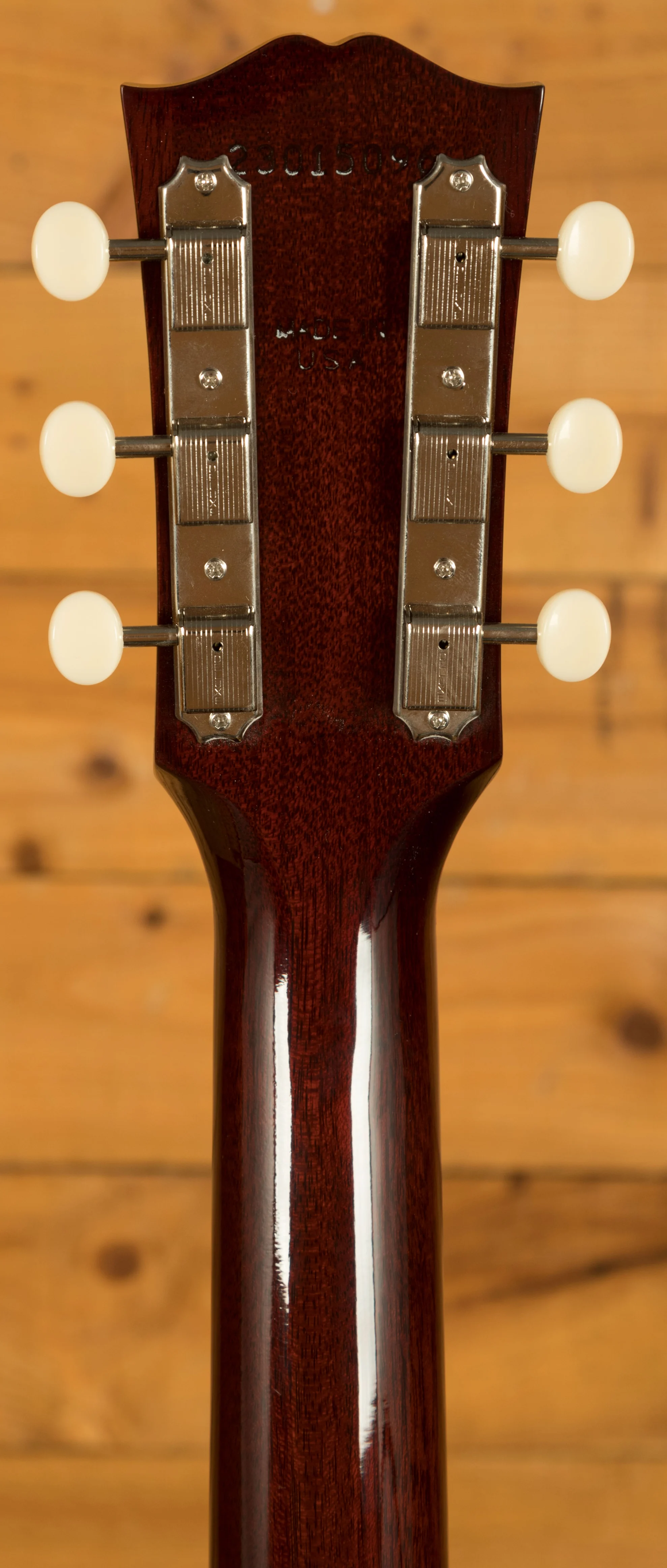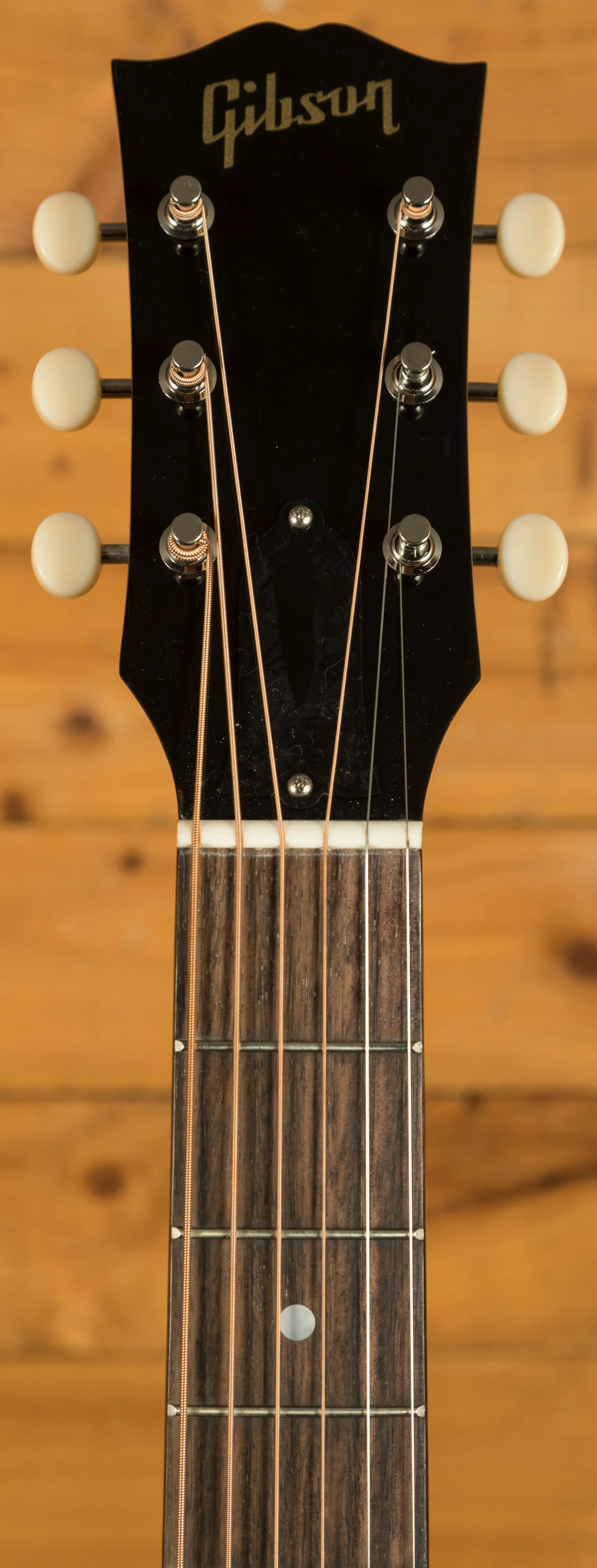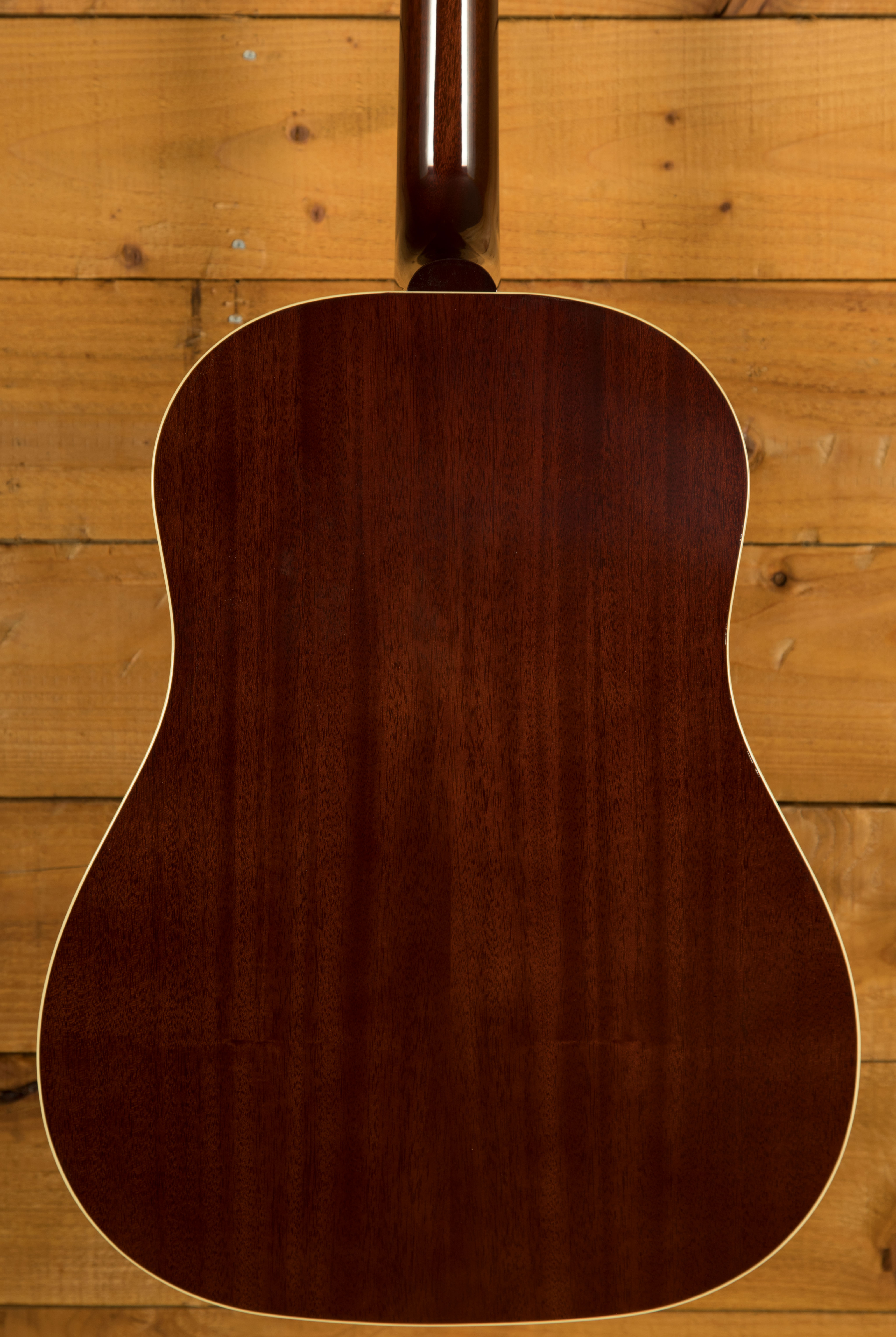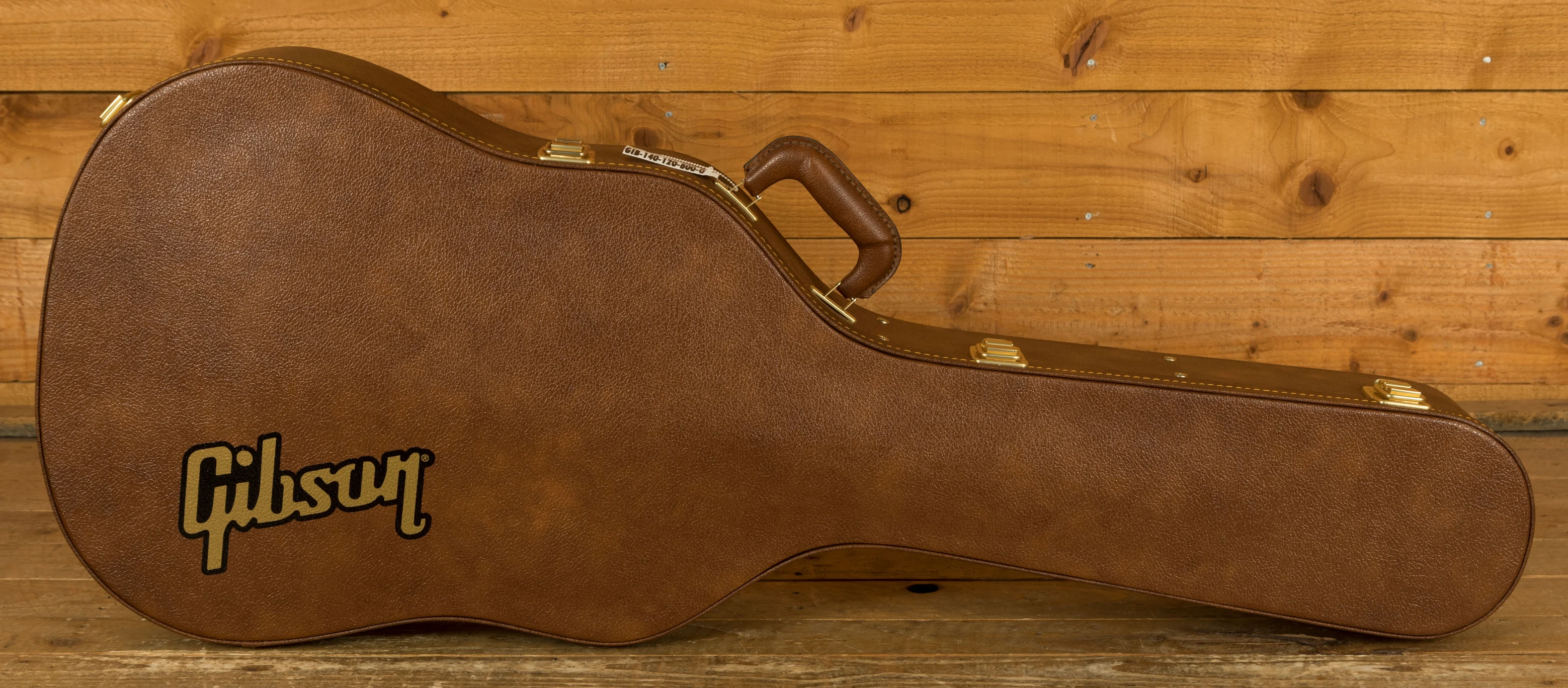 The Gibson J-45 50s Original in Vintage Sunburst offers a playing experience reminiscent of the golden age of Gibson acoustics. This round shoulder dreadnought features a solid Sitka spruce top, known for its balanced tone and projection, paired with select mahogany back and sides for warmth and richness. The traditional hand-scalloped X-bracing further enhances the guitar's resonance and responsiveness. The vintage-inspired aesthetic is evident in the subtly antiqued multi-ply top and single-ply back binding, giving the instrument the appearance of a well-loved classic. Other period-correct appointments include cream button tuners, a 50s-era tortoise pickguard, and a rounded neck profile for comfortable playability. The rosewood fingerboard with mother-of-pearl dot inlays adds a touch of elegance. For amplified performance, the J-45 50s Original comes equipped with an LR Baggs VTC pickup, providing a natural and accurate representation of the guitar's acoustic tone. The guitar has a 24.75-inch scale length, a 12-inch fingerboard radius, and a 1.724-inch bone nut. It features 20 standard frets, a traditional belly-up bridge with a bone saddle, and Tusq bridge pins. The nickel finish hardware includes Grover Strap Cream Button tuning machines. It comes with a hardshell case and a Gibson accessory kit.